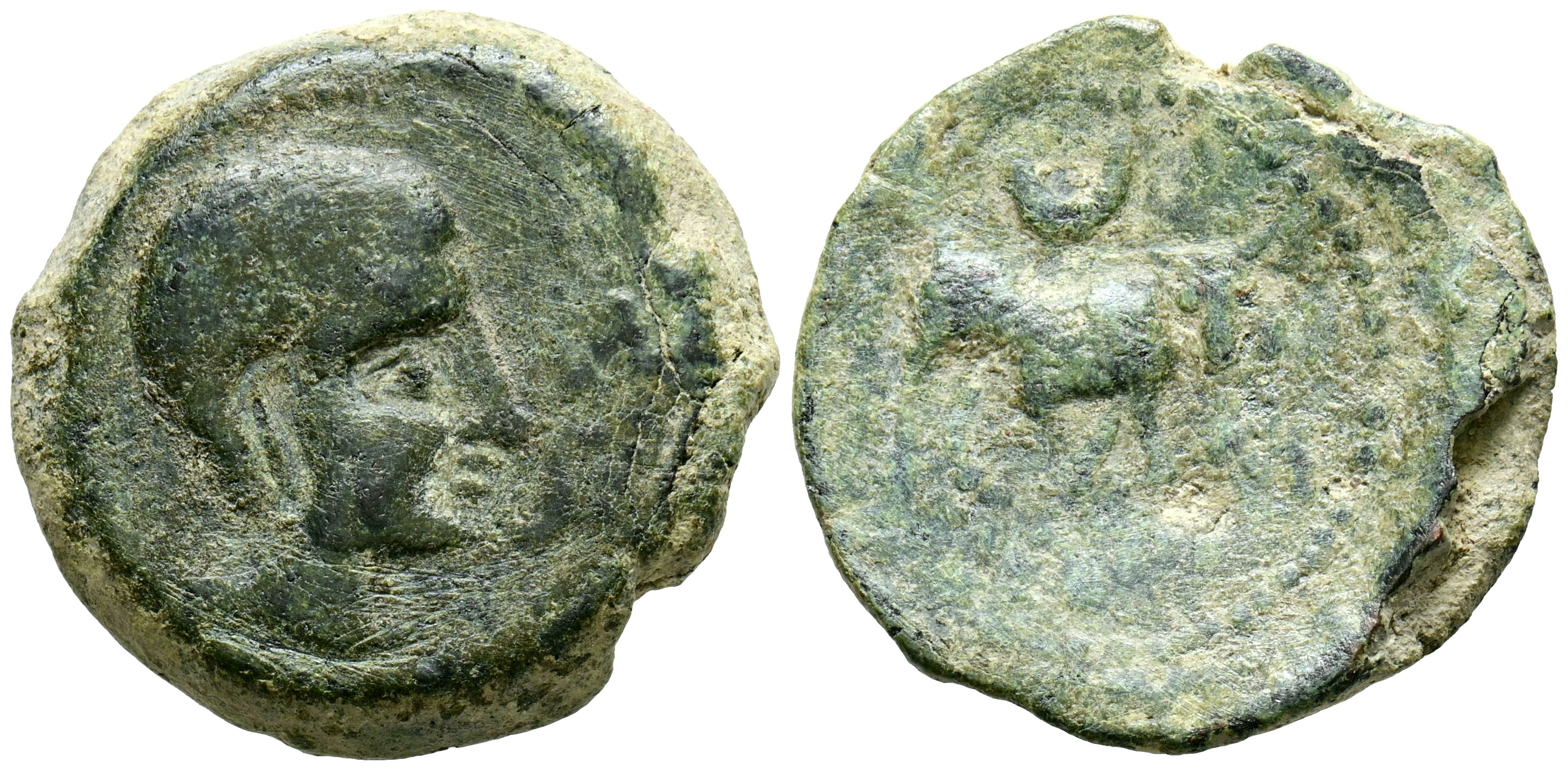 CASTULO (Cazlona, Sevilla). Semis. (Ae. 10,17g/23mm). 180 a.C. (FAB-715). Anv: Cabeza masculina con diadema a la derecha, delante S. Rev: Toro a la derecha, encima creciente, antes de la letra ibérica Co, en exergo leyenda ibérica: CaSTeLE.