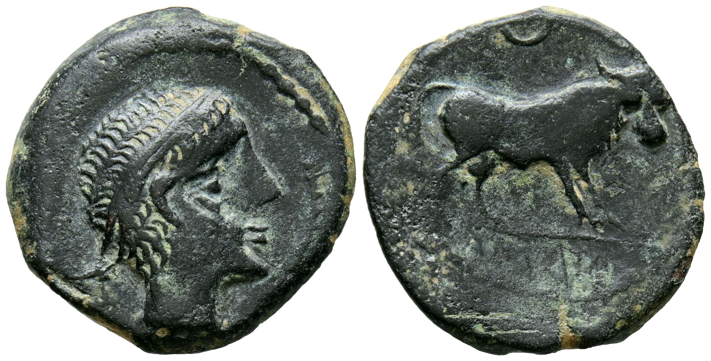 CASTULO (Cazlona, Jaén). Semis. (Ae. 4,81g/20mm). 180 a.C. (FAB-717). Anv: Cabeza diademada a derecha, delante espiga. Rev: Toro a derecha, encima creciente, en exergo leyenda ibérica: CaSTeLE. MBC/MBC-.