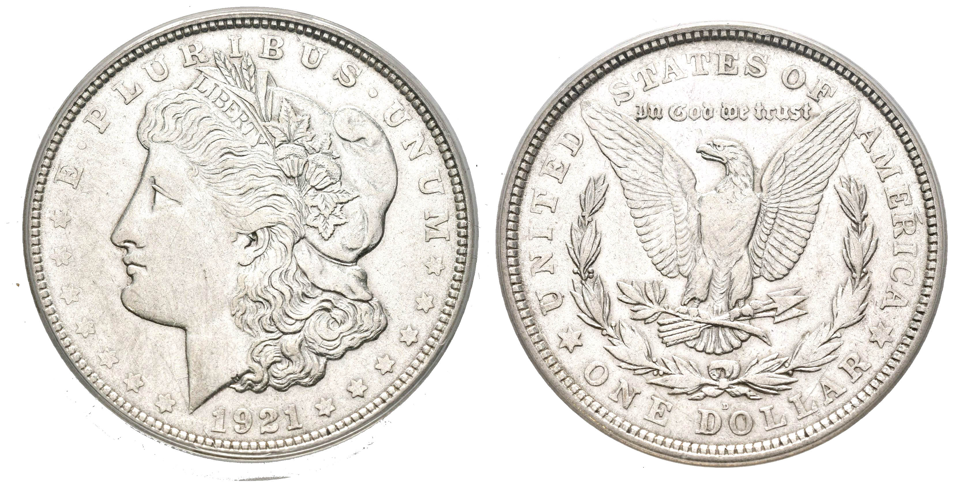 ESTADOS UNIDOS. 1 Dollar (Ar. 26,73g/38mm)*. 1921. Denver D. VAM 1B1. HOT-50. (Km#110). Rayas. Encapsulado por ANACS AU50 Details. *Peso y medida teórico.