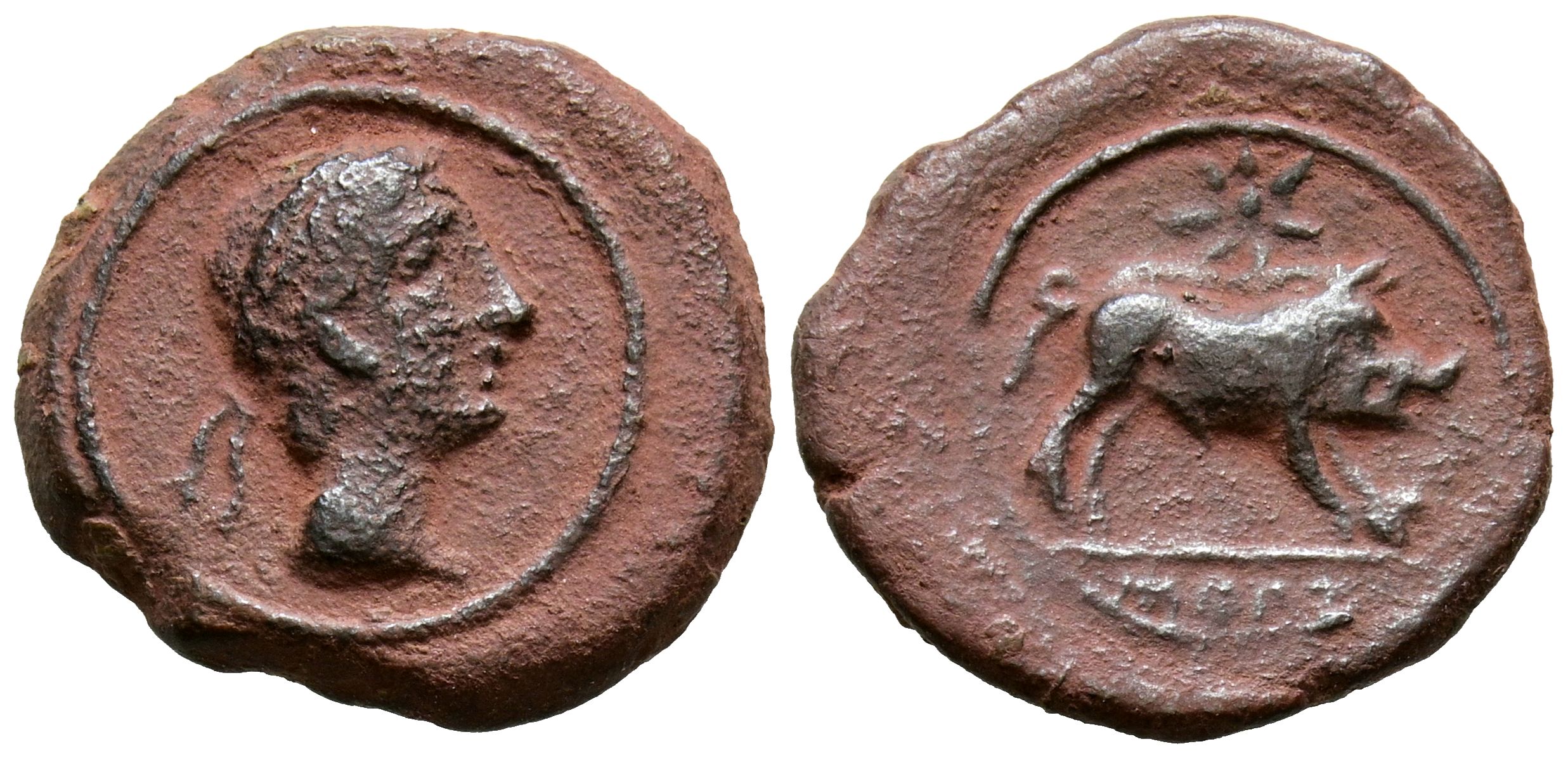 CASTULO (Cazlona, Jaén). Cuadrante. (Ae. 3,18g/17mm). 180 a.C. (FAB-736). Anv: Cabeza masculina a derecha, delante letra ibérica Ca. Rev: Jabalí a derecha, encima estrella, debajo leyenda ibérica CaSTeLE. MBC.