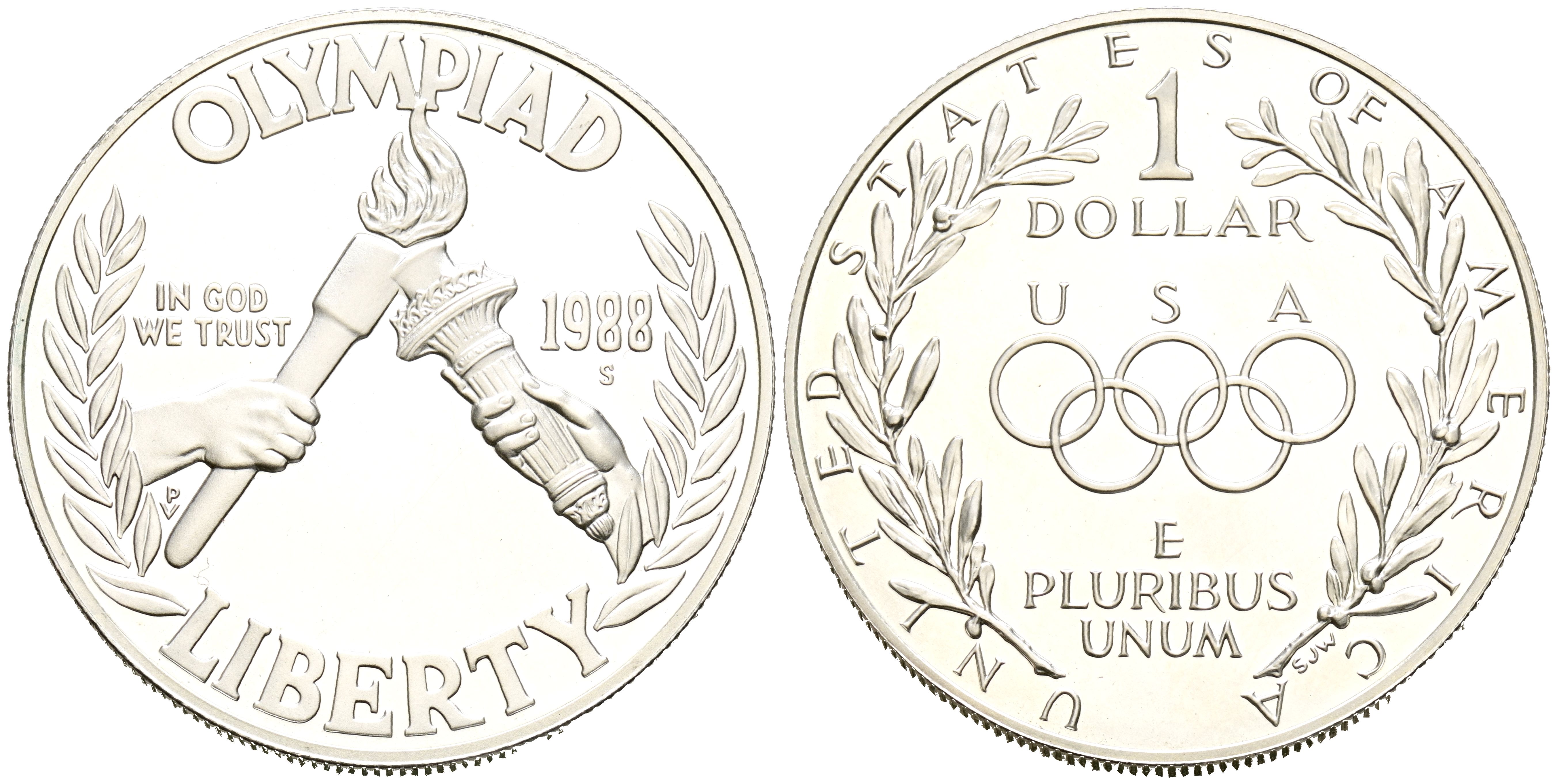 ESTADOS UNIDOS. 1 Dollar. (Ar. 26,74g/38mm). 1988. San Francisco S. Juegos Olímpicos Seúl´88. (Km#222). PROOF. Leves rayitas.