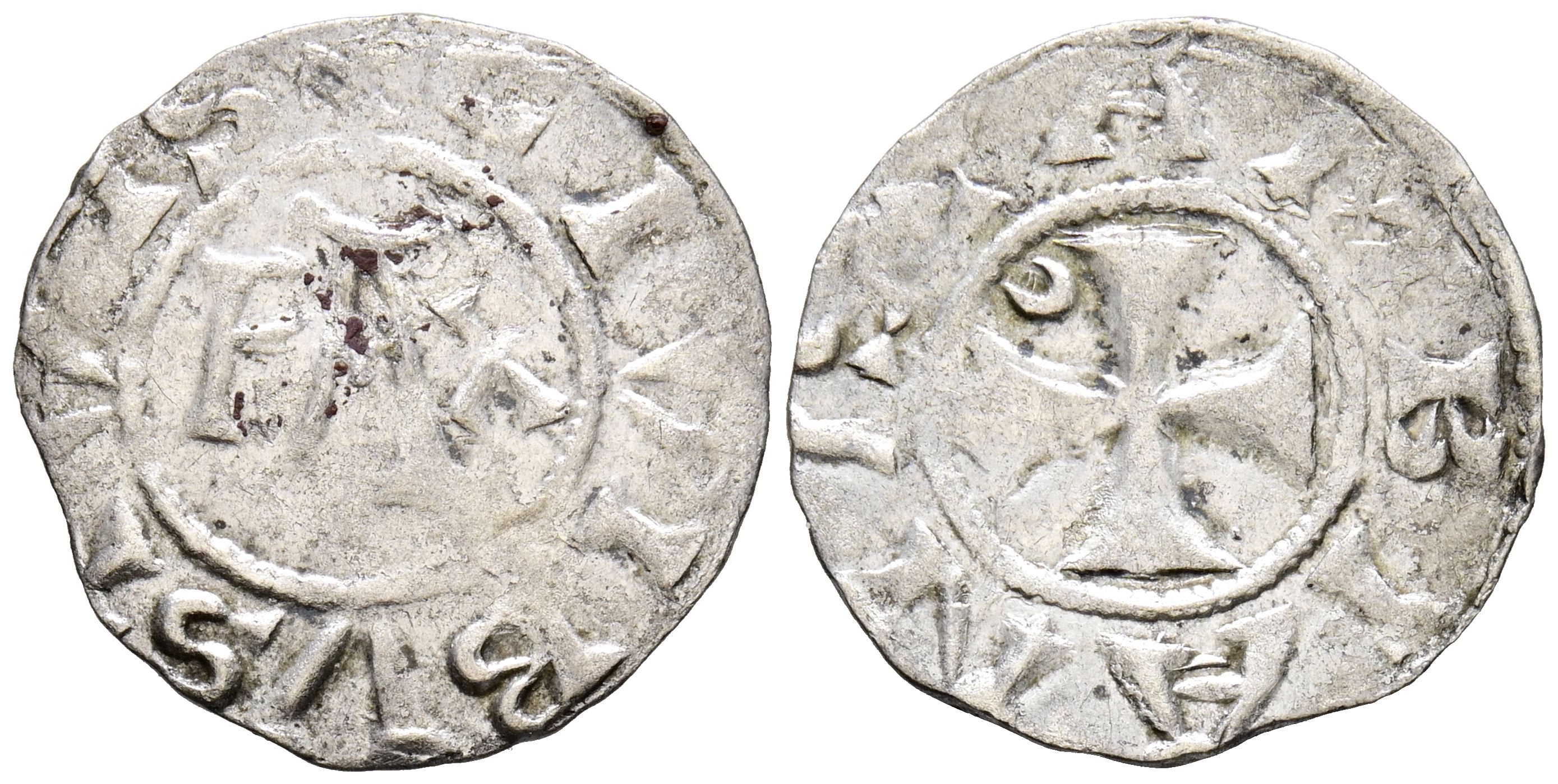 FRANCIA, Anónimo (Siglo XI). Dinero. (Ve. 1,10g/19mm). Amiens. (Poey d'Avant 6402 var (sin media luna); Boudeau 1914; Roberts 4178 var). Anv: Cruz patada con media luna en el primer cuadrante dentro de una gráfila circular, alrededor leyenda: AMBIANIS. Rev: Anagrama PAX dentro de gráfila circular, alrededor leyenda: CIVIBVS TVIS. MBC.