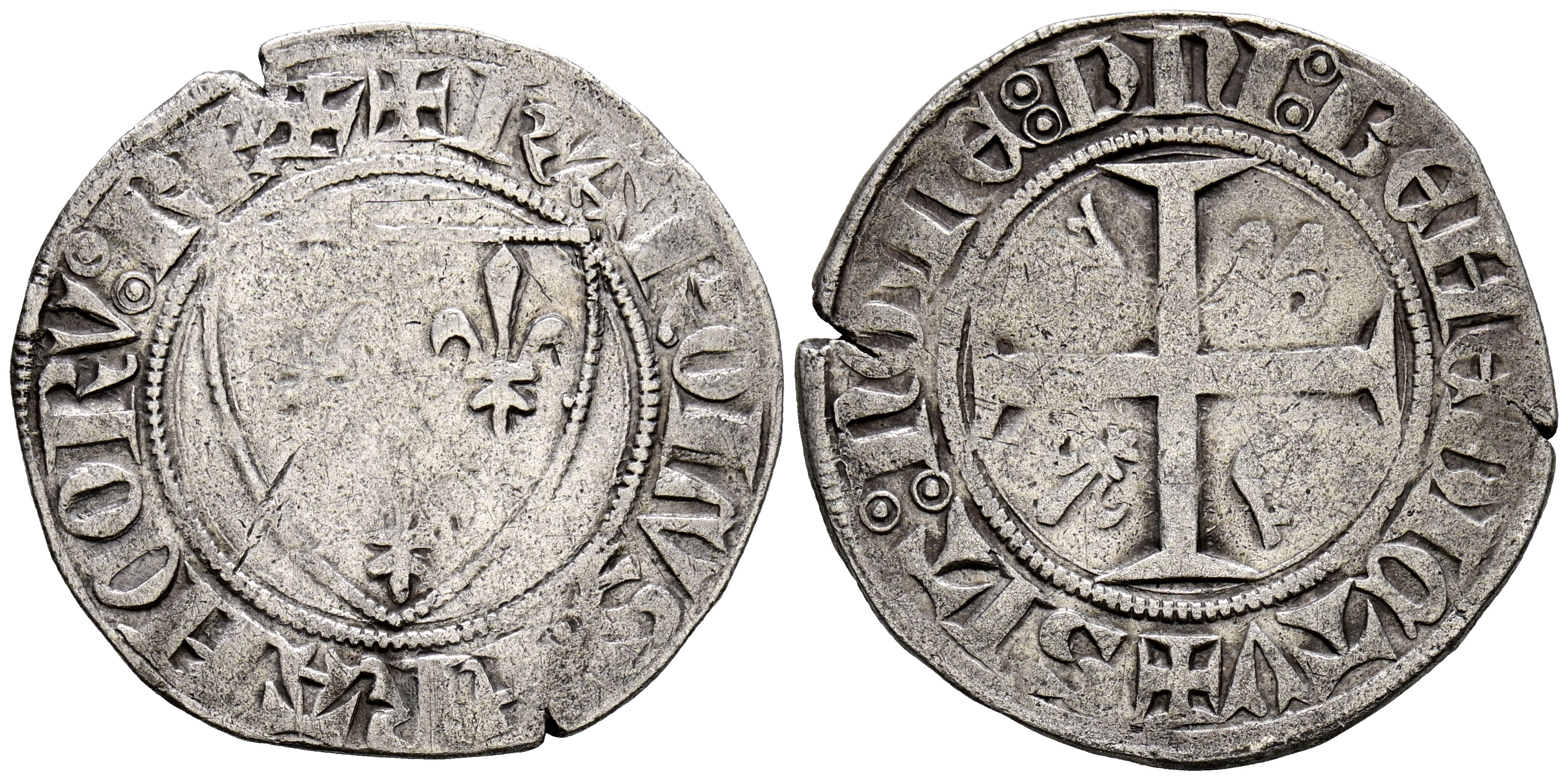 FRANCIA, Carlos VI ''el loco''. Blanc Guénar. (Ar. 3,07g/26mm). 1380-1422. París A. (Dupplessy 377a). Anv: escudo de francia, alrededor leyenda: KAROLVS FRANCORV REX. Rev: Cruz patada con coronas en 1º y 4º cuadrante y flor de lis en 2º y 3º cuadrante, alrededor leyenda: SIT NOME DNI BENEDICTV. MBC.