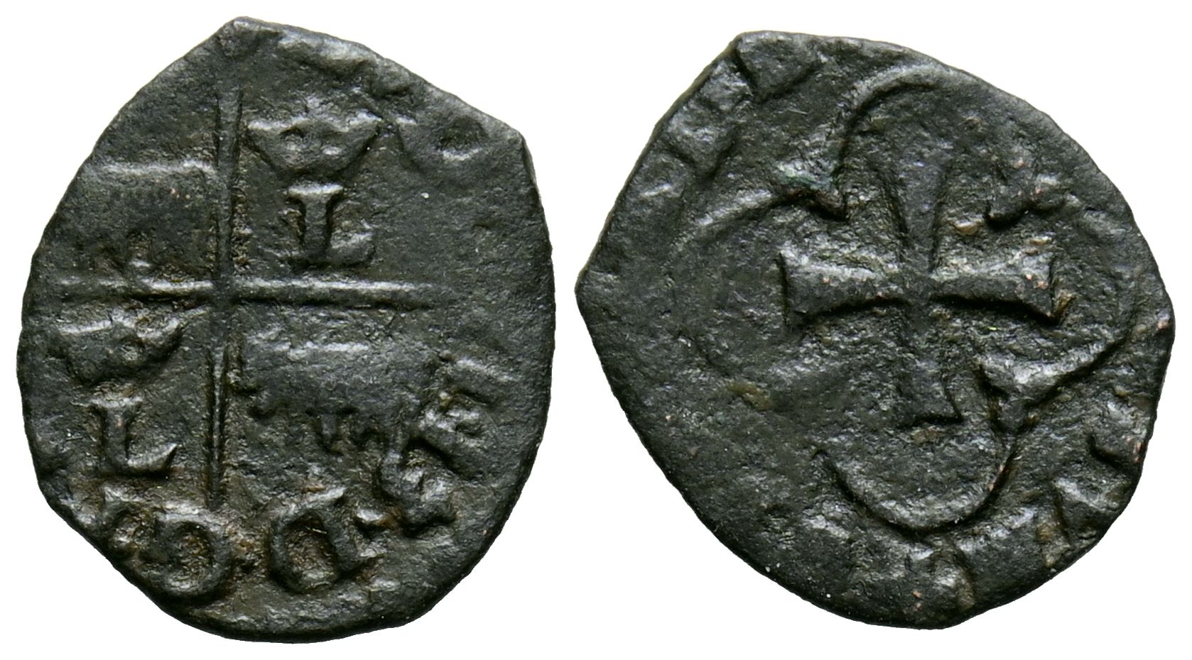 FRANCIA, Luis XIII (1610-1643). Vaquette (1º tipo). (Ae. 0,46g/12mm). Morlaàs (Navarra Francesa). (Duplessy 1355). Anv: Cruz, vacas en 1º y 4º cuadrante y L coronada en 2º y 3º cuadrante, alrededor leyenda: LVDOVI 13 D G F ET N REX. Rev: Cruz patada dentro de una gráfila floral, alrededor leyenda: GRATIA DEI SVM ID Q SVM. MBC. Escasa.