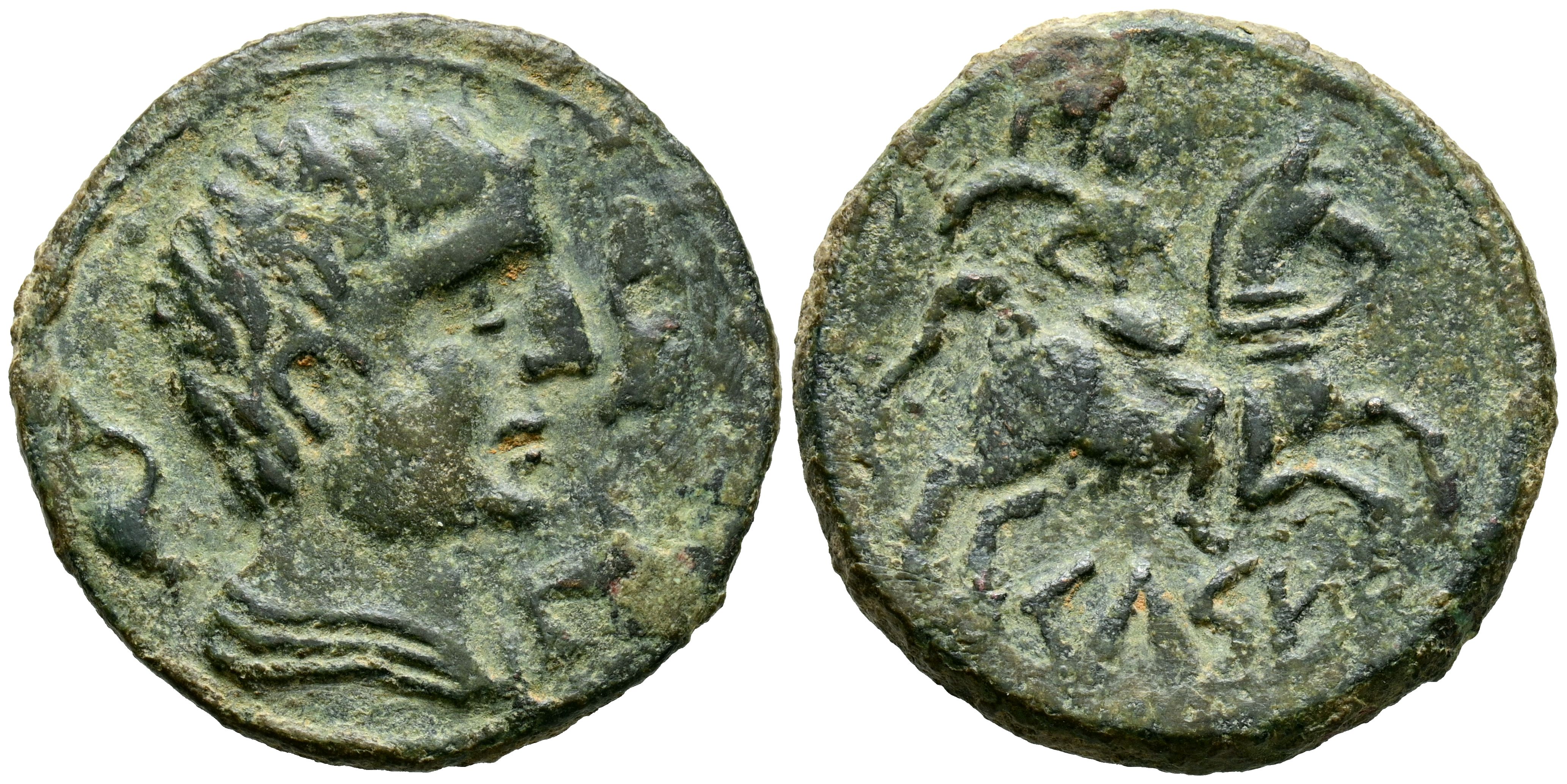 CELSE (Velilla del Ebro, Zaragoza). As. (Ae. 10,91g/29mm). 120-50 a.C. (FAB-771). Anv: Cabeza a derecha con manto y fíbula a derecha, alrededor tres delfines. Rev: Jinete con palma a derecha, debajo leyenda ibérica sobre línea: CeLSE. MBC-. Repatinado.