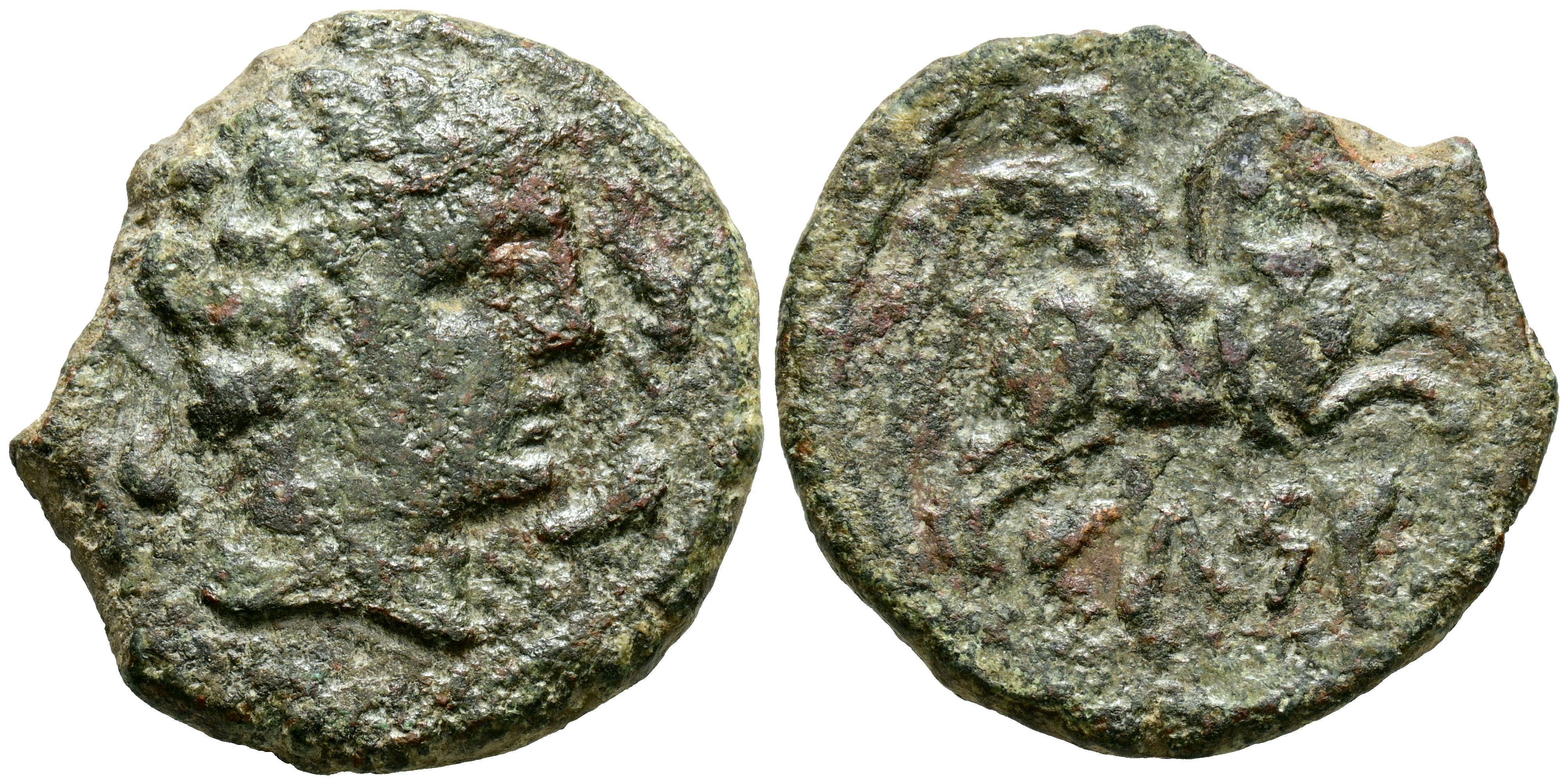 CELSE (Velilla de Ebro, Zaragoza). As. (Ae. 11,55g/28mm). 120-50 a.C. (FAB-771). Anv: Cabeza masculina a derecha, alrededor tres delfines. Rev: Jinete con palma a derecha, debajo leyenda ibérica: CeLSE. BC+. Cospel faltado.