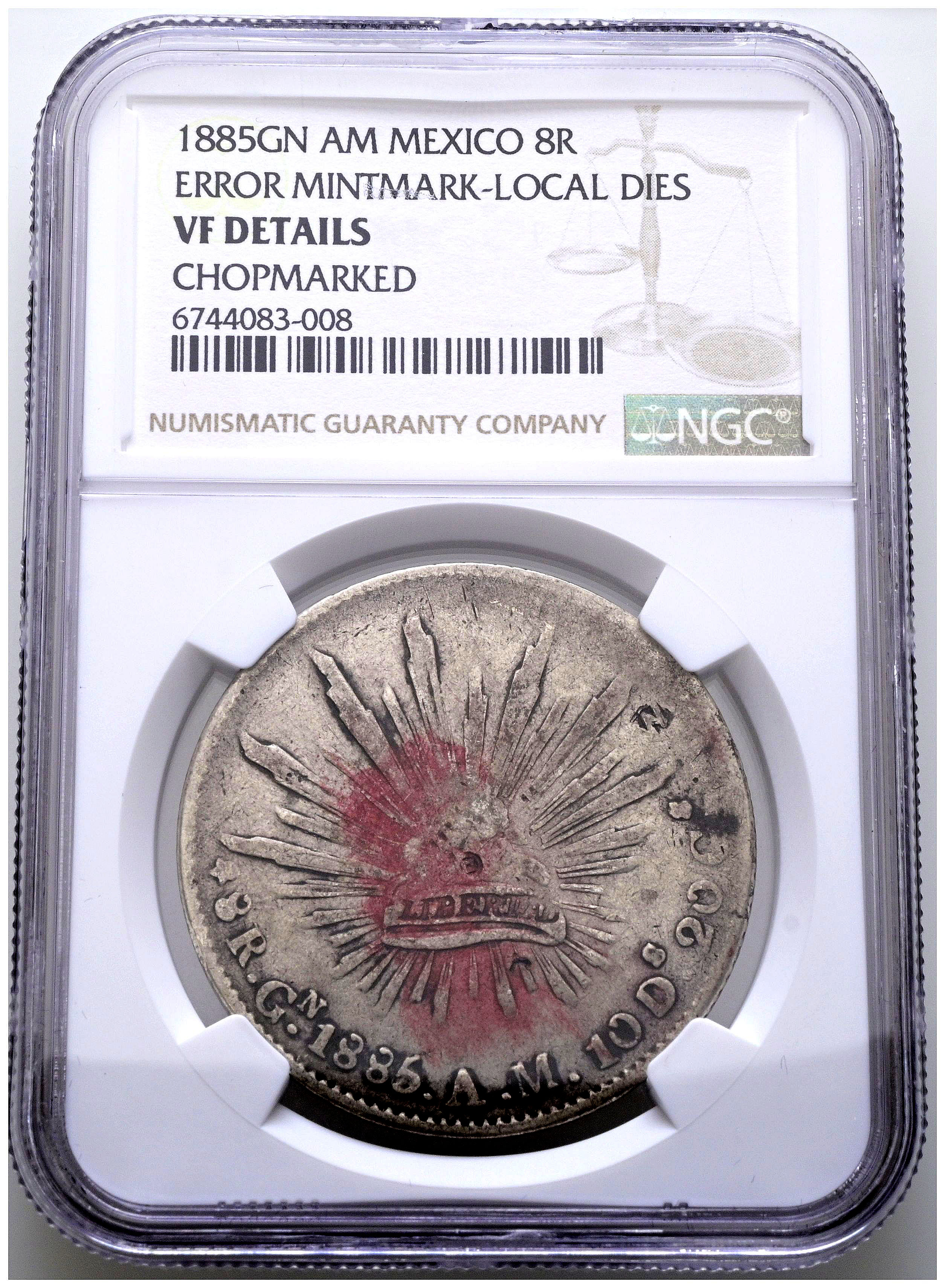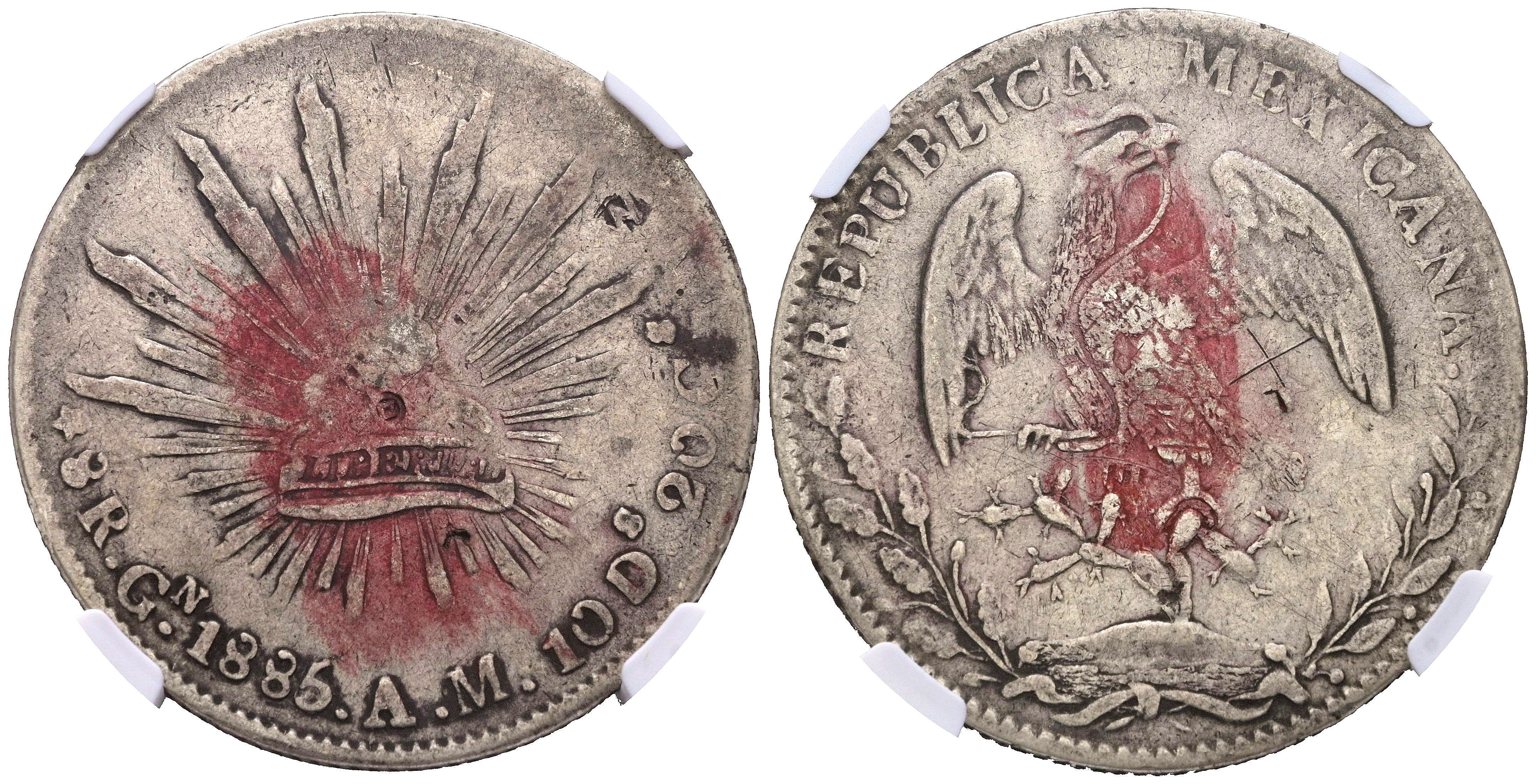 MÉXICO. 8 Reales. (Ar. 27,07g/39mm)*. 1885. Culican AM. (Km#377.3). Variante en la marca de ceca GN en lugar de CN. Encapsulado por NGC VF Details, Chopmarked. *Peso y medidas teóricos.