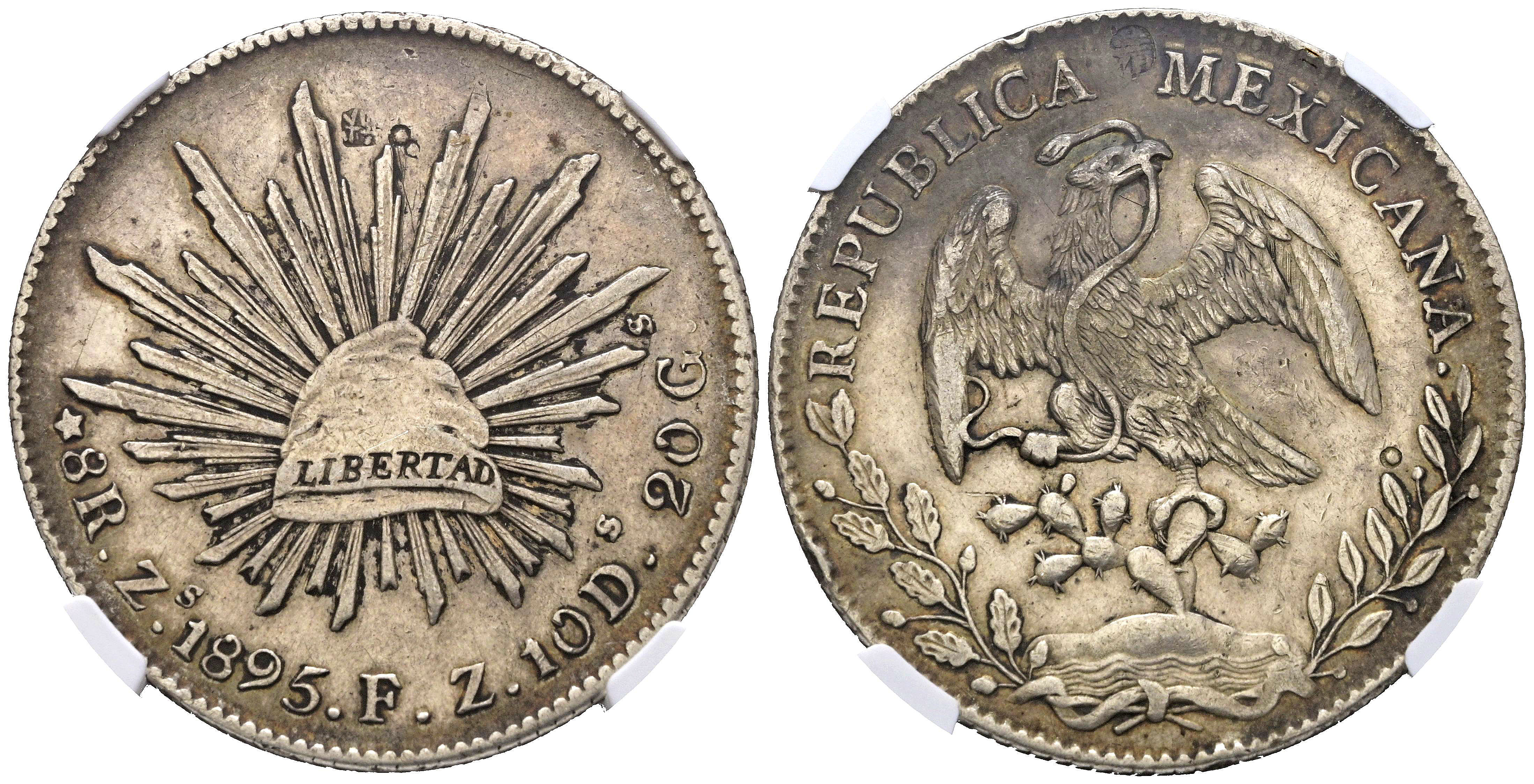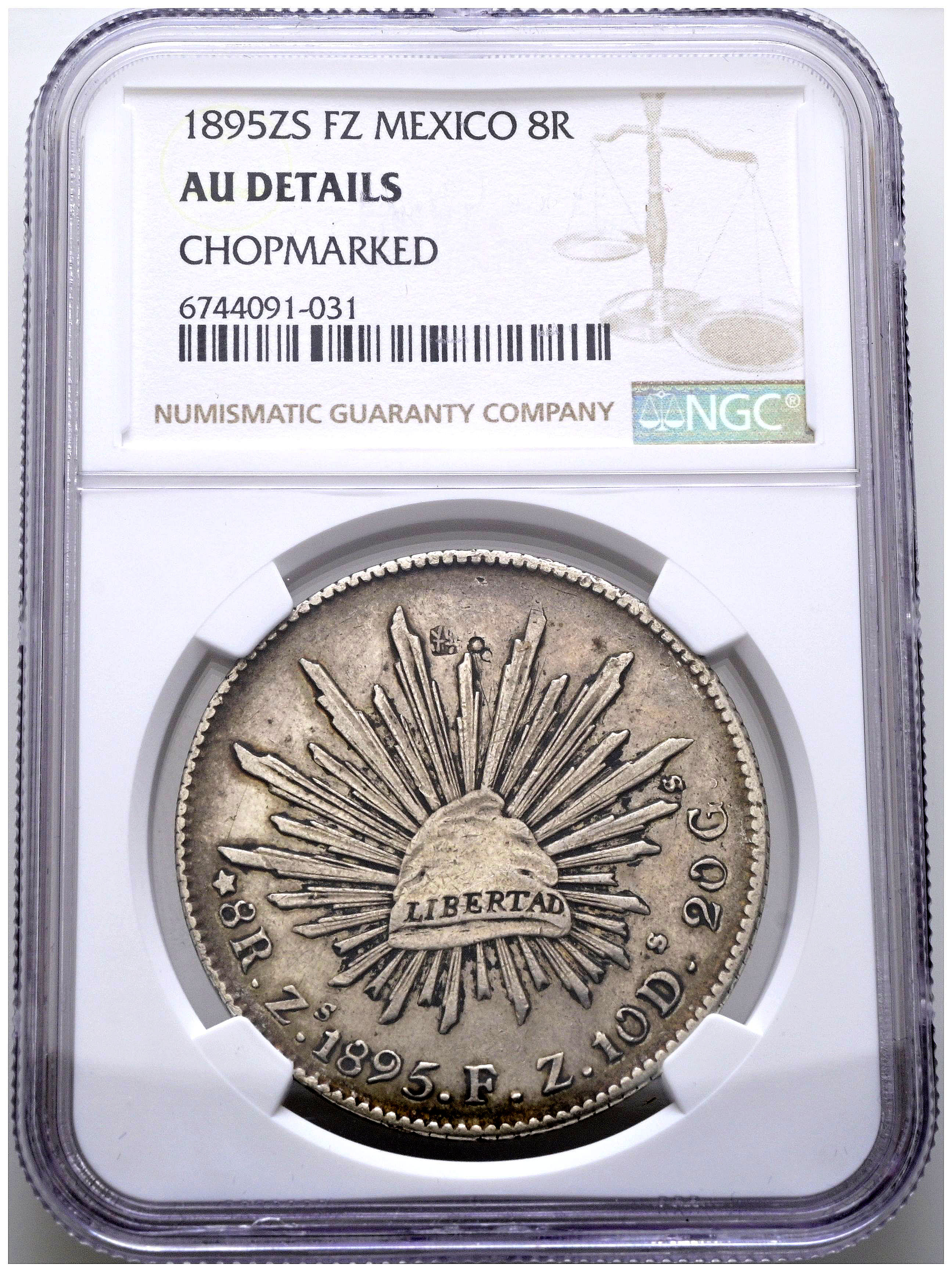MÉXICO. 8 Reales. (Ar. 27,07g/39mm)*. 1895. Zacatecas FZ. (Km#377.13). Encapsulado por NGC AU Details, Chopmarked. *Peso y medidas teóricos.