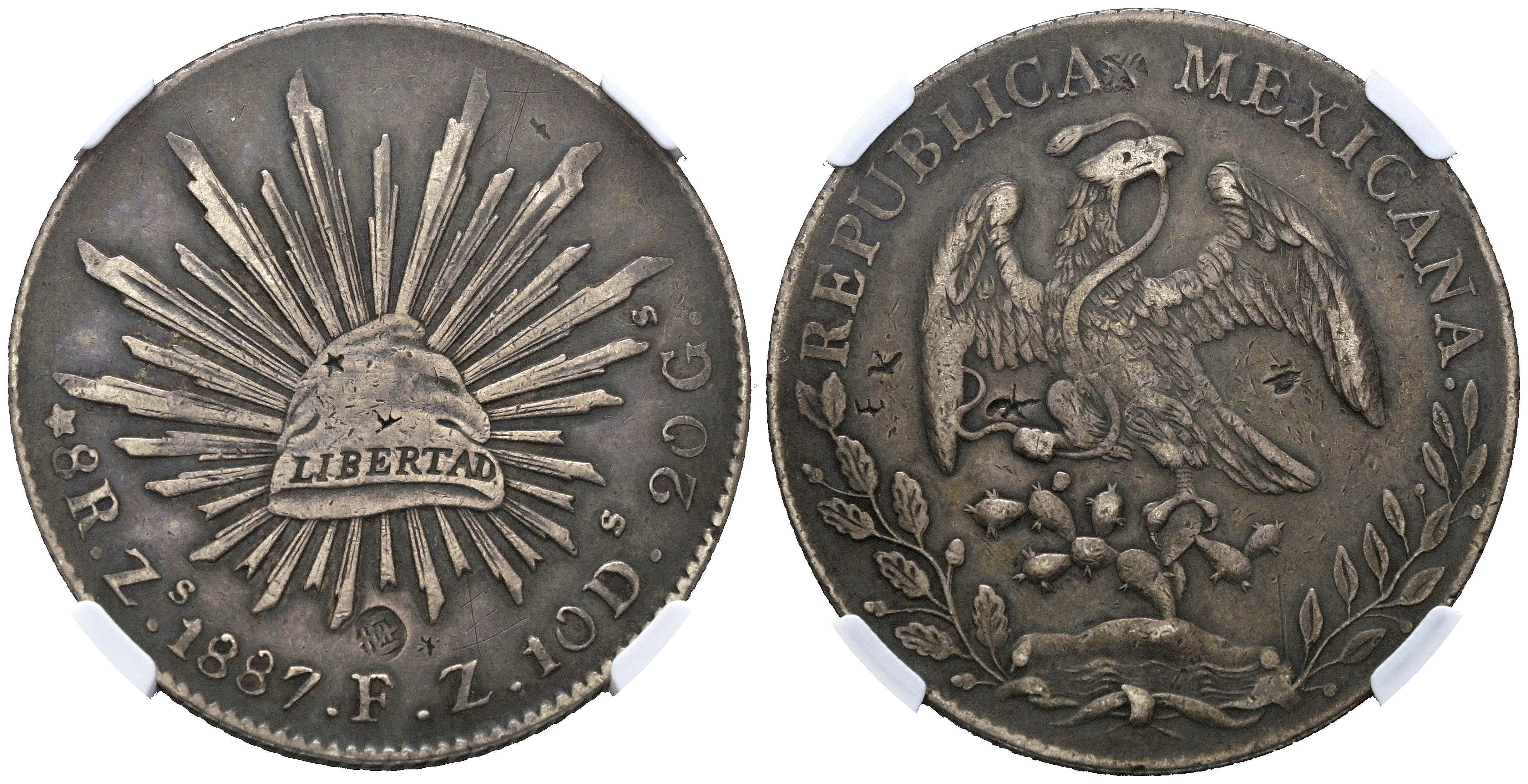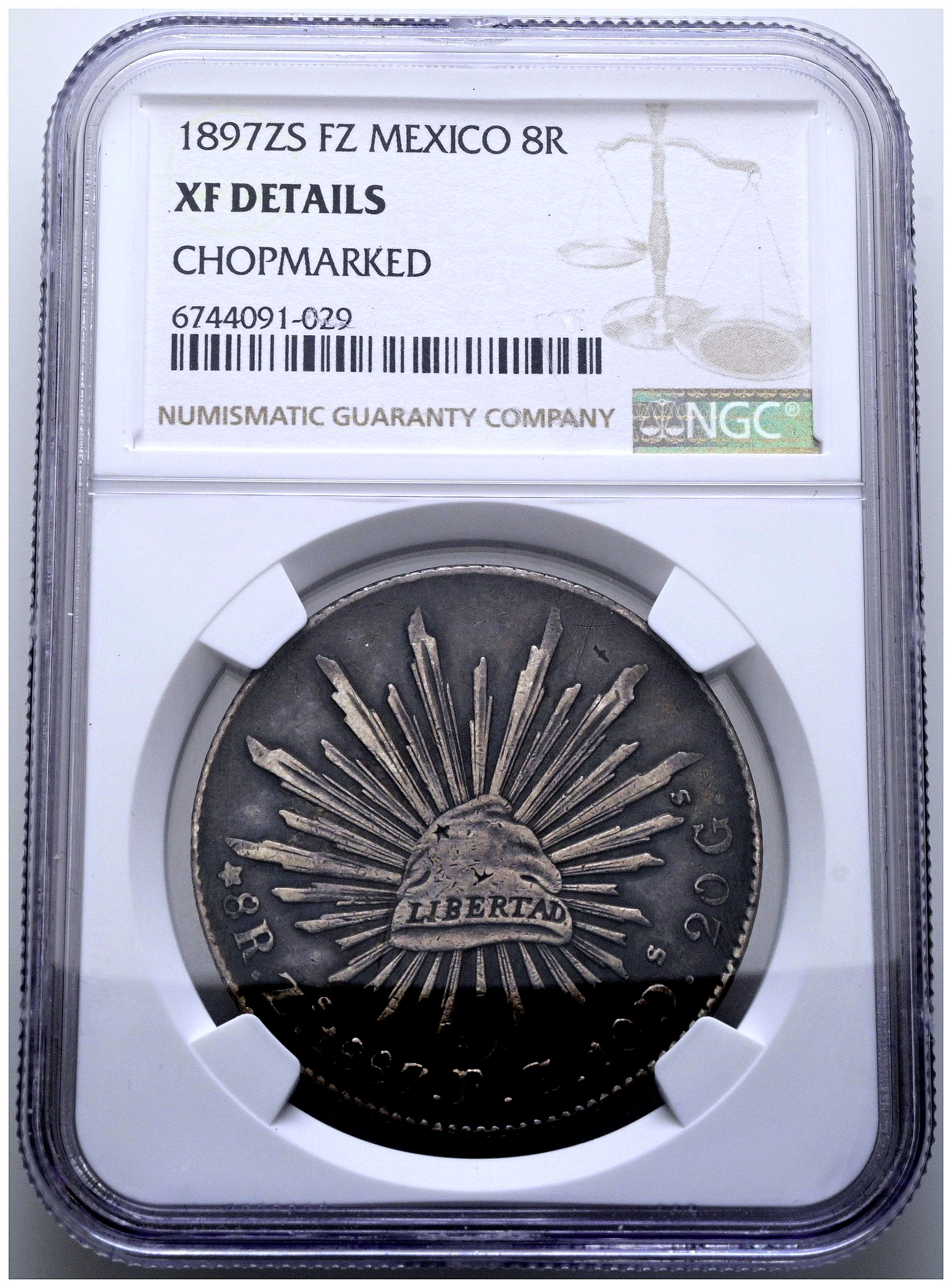 MÉXICO. 8 Reales. (Ar. 27,07g/39mm)*. 1897. Zacatecas FZ. (Km#377.13). Encapsulado por NGC XF Details, Chopmarked. *Peso y medidas teóricos.