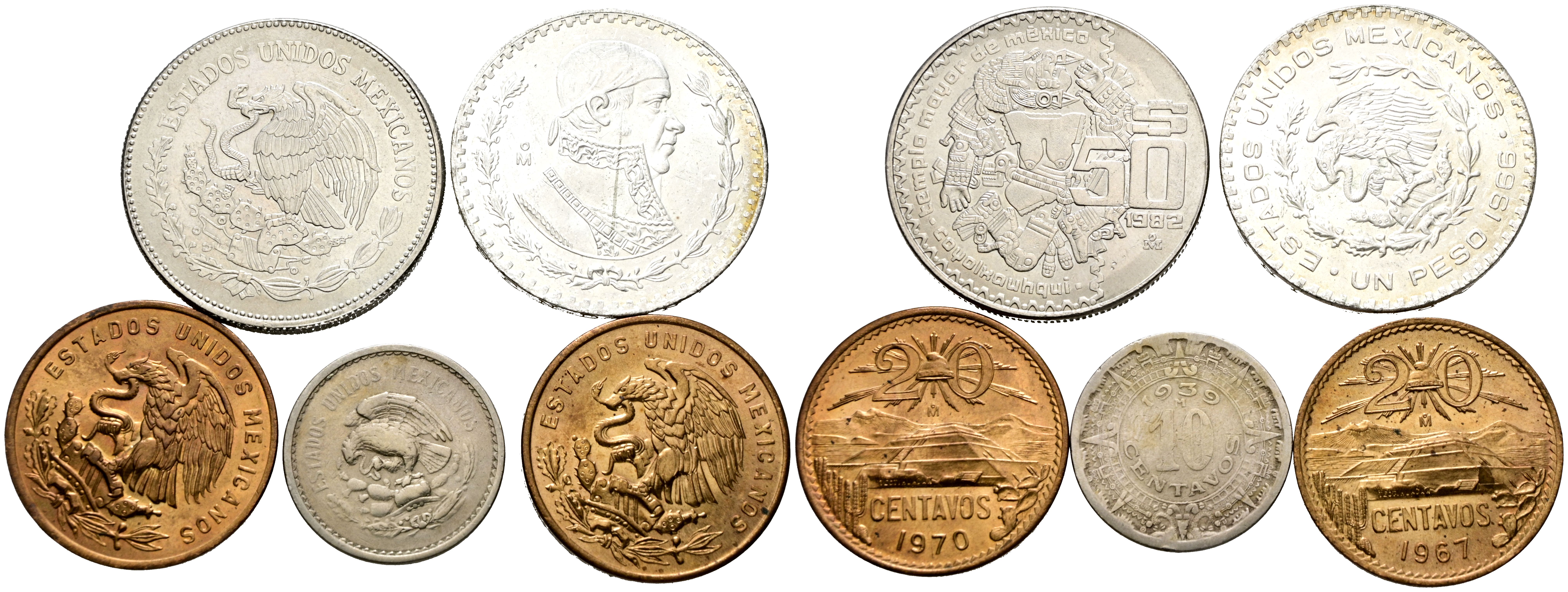MÉXICO. Magnífico conjunto de 5 piezas en diferentes módulos y materiales, incluyendo plata, y en un grado de conservación alto en general. A EXAMINAR.