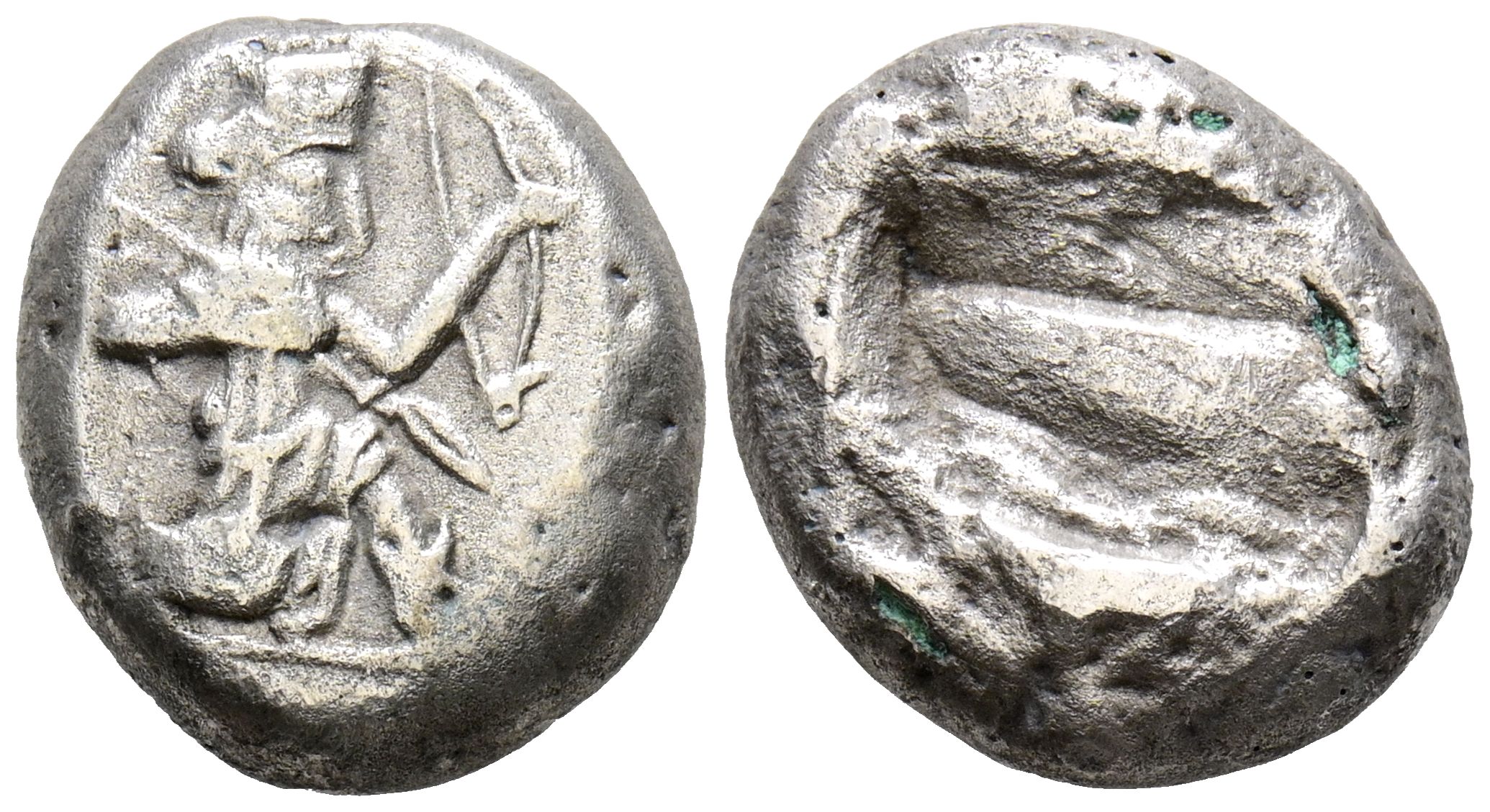 IMPERIO AQUEMENIDA, Tiempo de Xerxes I a Darios II. Siglos. (Ar. 4,22g/16mm). 485-420 a.C. Sardes. (Sunrise 25). Anv: Rey persa arrodillado a derecha portando arco y lanza y carcaj en su espalda. Rev: Cuadrado incuso. MBC.
