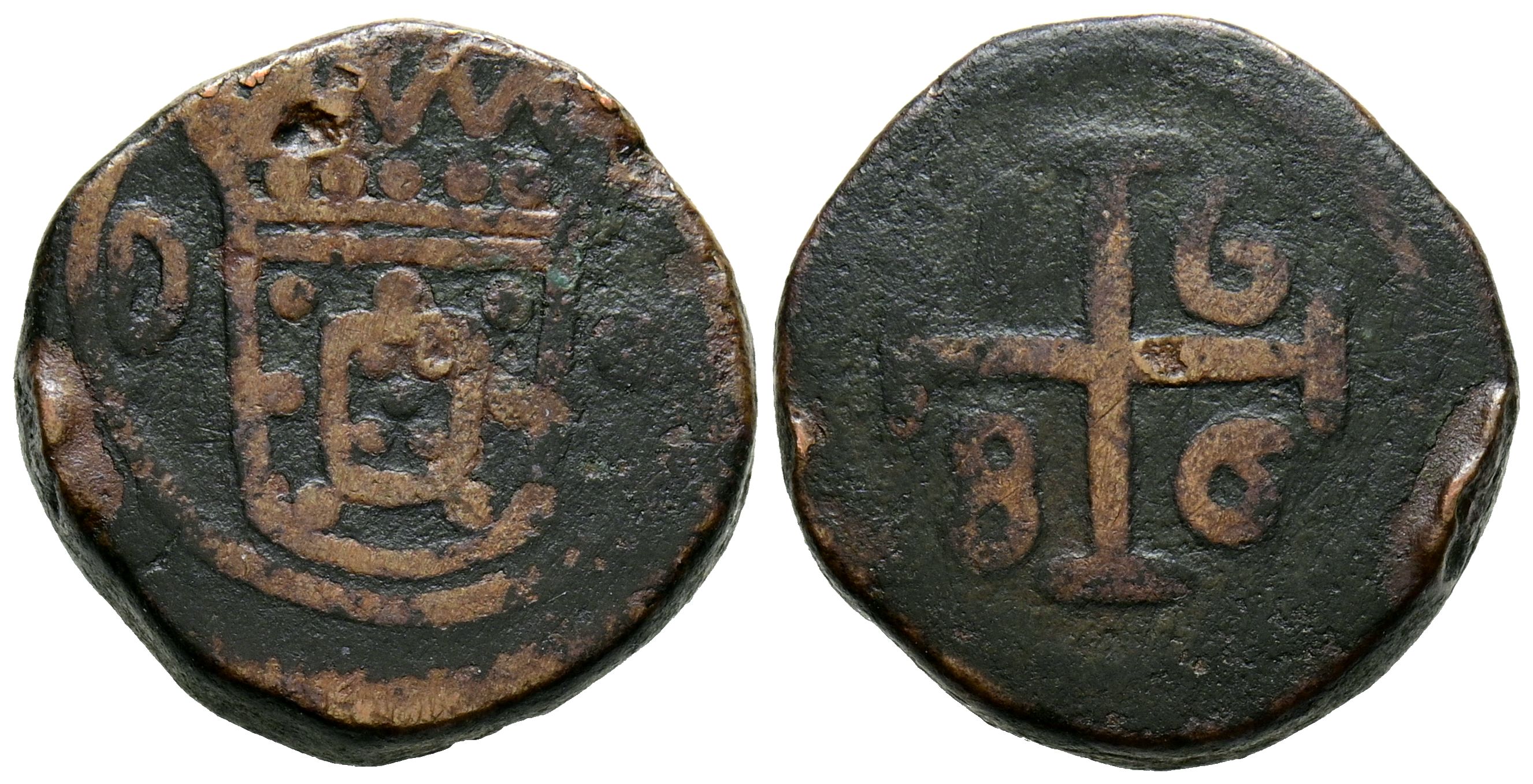 INDIA PORTUGUESA. D. Pedro II (1683 -1706). Bazaruco. (Ae. 7,10g/18mm). 1686. Diu. (Gomes-02.01). MBC-.