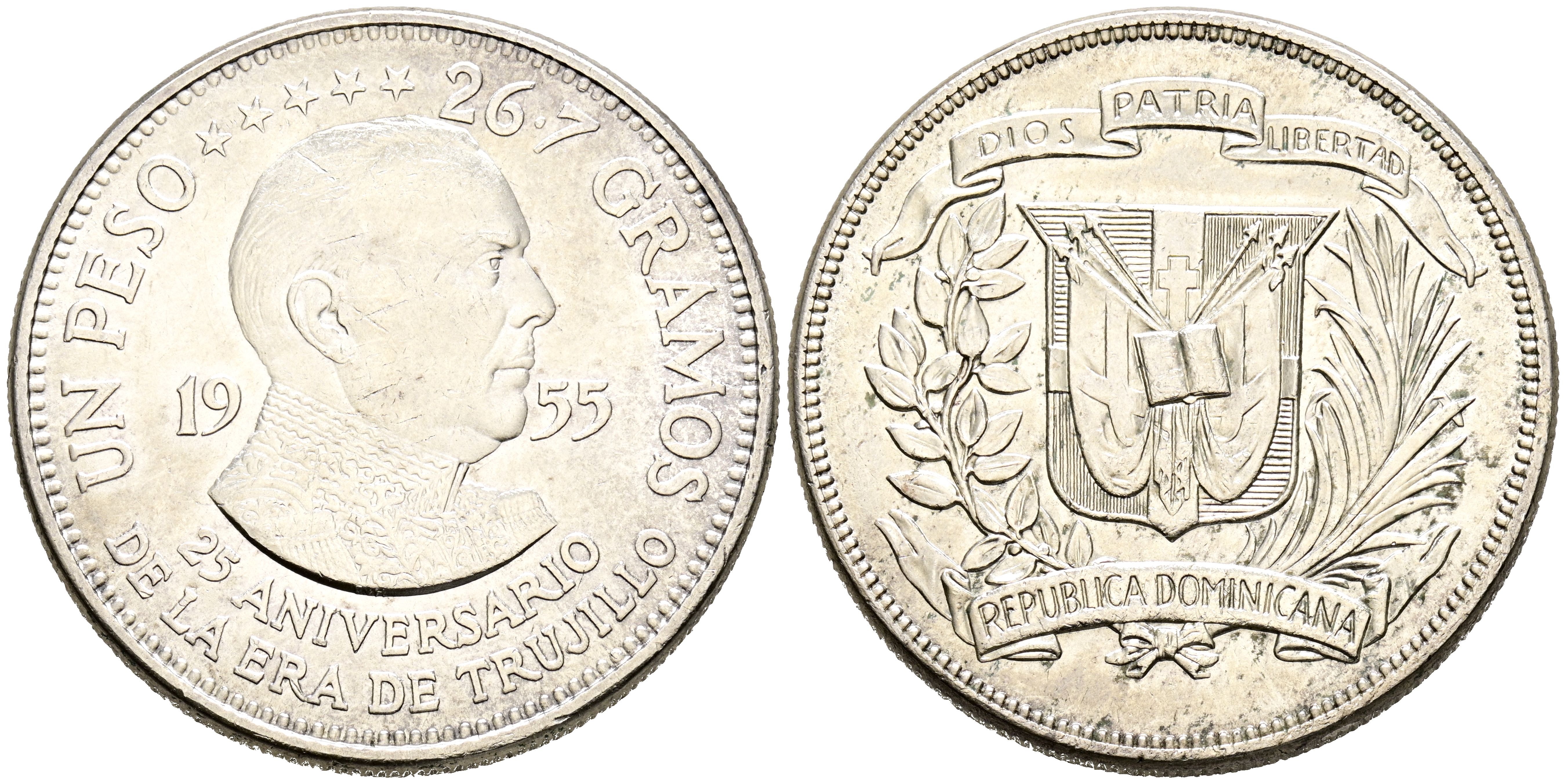 REPÚBLICA DOMINICANA. 1 Peso. (Ar. 26,52g/38mm). 1955. 25 Aniversario de la Era Trujillo. (Km#23). EBC+. Marquitas en anverso.