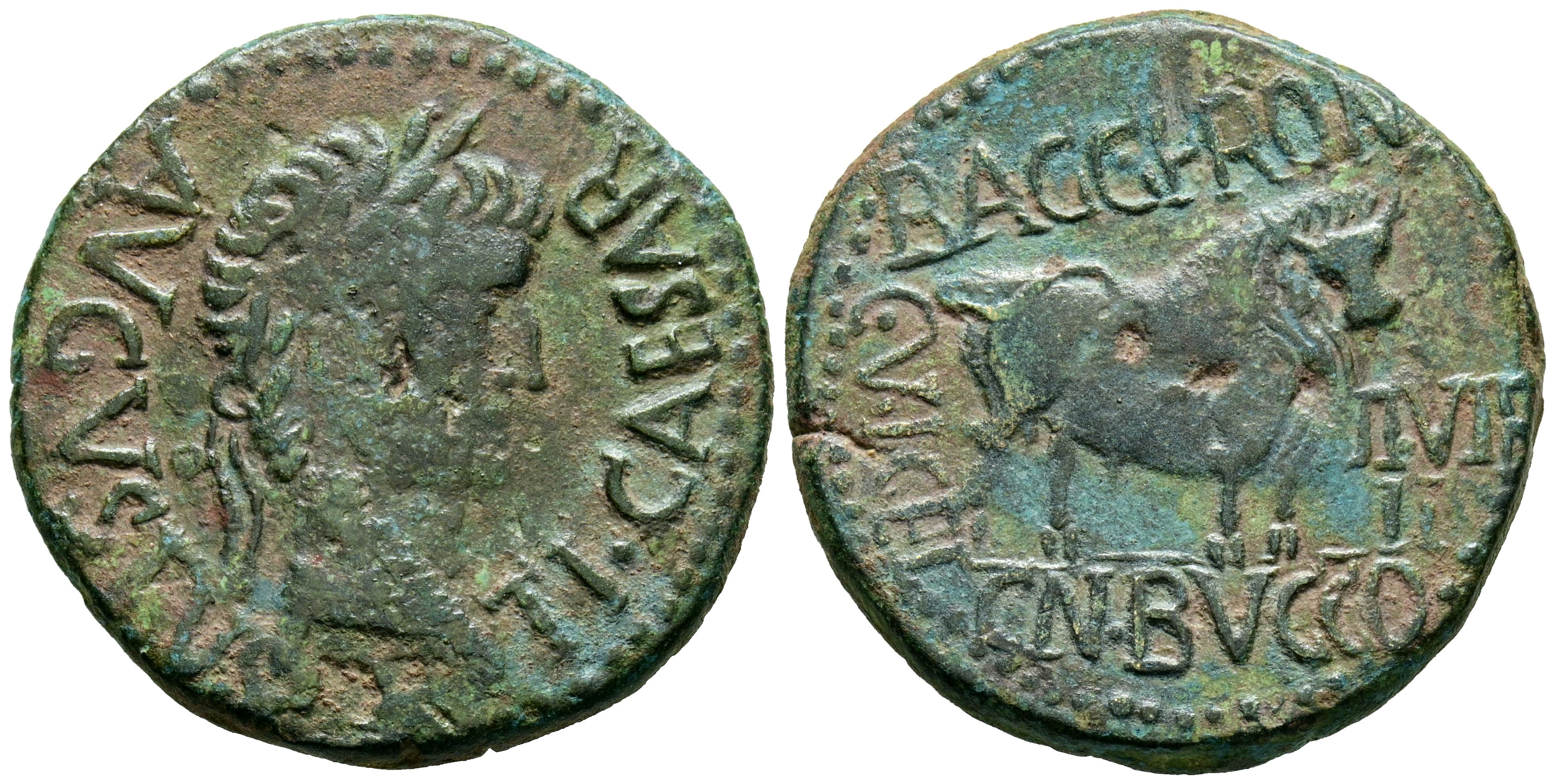 CELSE (Velilla del Ebro, Zaragoza). As. (Ae. 12,11g/27mm). 14-36 d.C. (FAB-819). Anv: Cabeza laureada de Tiberio a derecha, alrededor leyenda: TI CAESAR AVGVSTVS. Rev: Toro a derecha, encima leyenda: BACC FRONT, debajo: CN BVCCO, a la izquierda: D V I CEL, a la derecha: II VIR II. MBC.