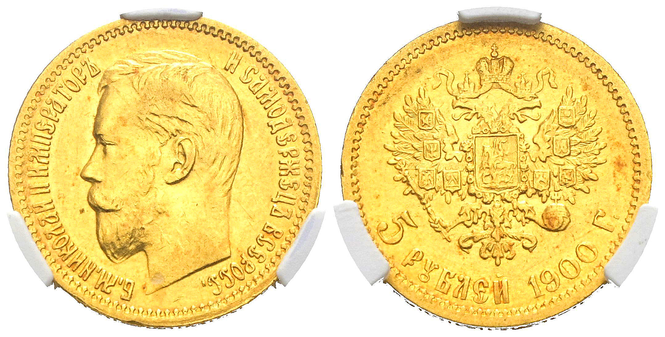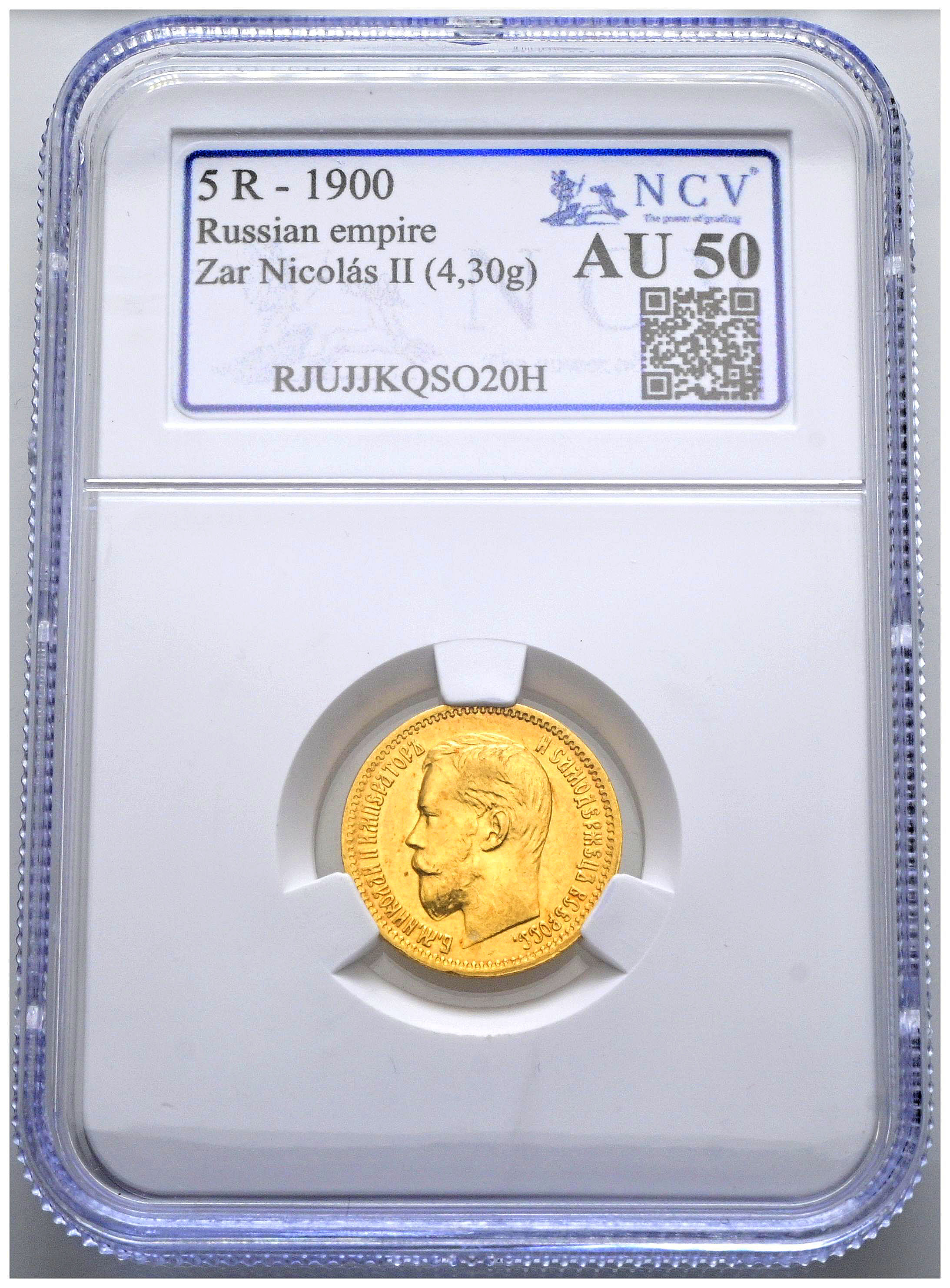 RUSIA. 5 Rublos (Au. 4,30g/19mm). 1900. Nicolás II. San Petersburgo. (Km#62). Encapsulada por NCV. AU 50.