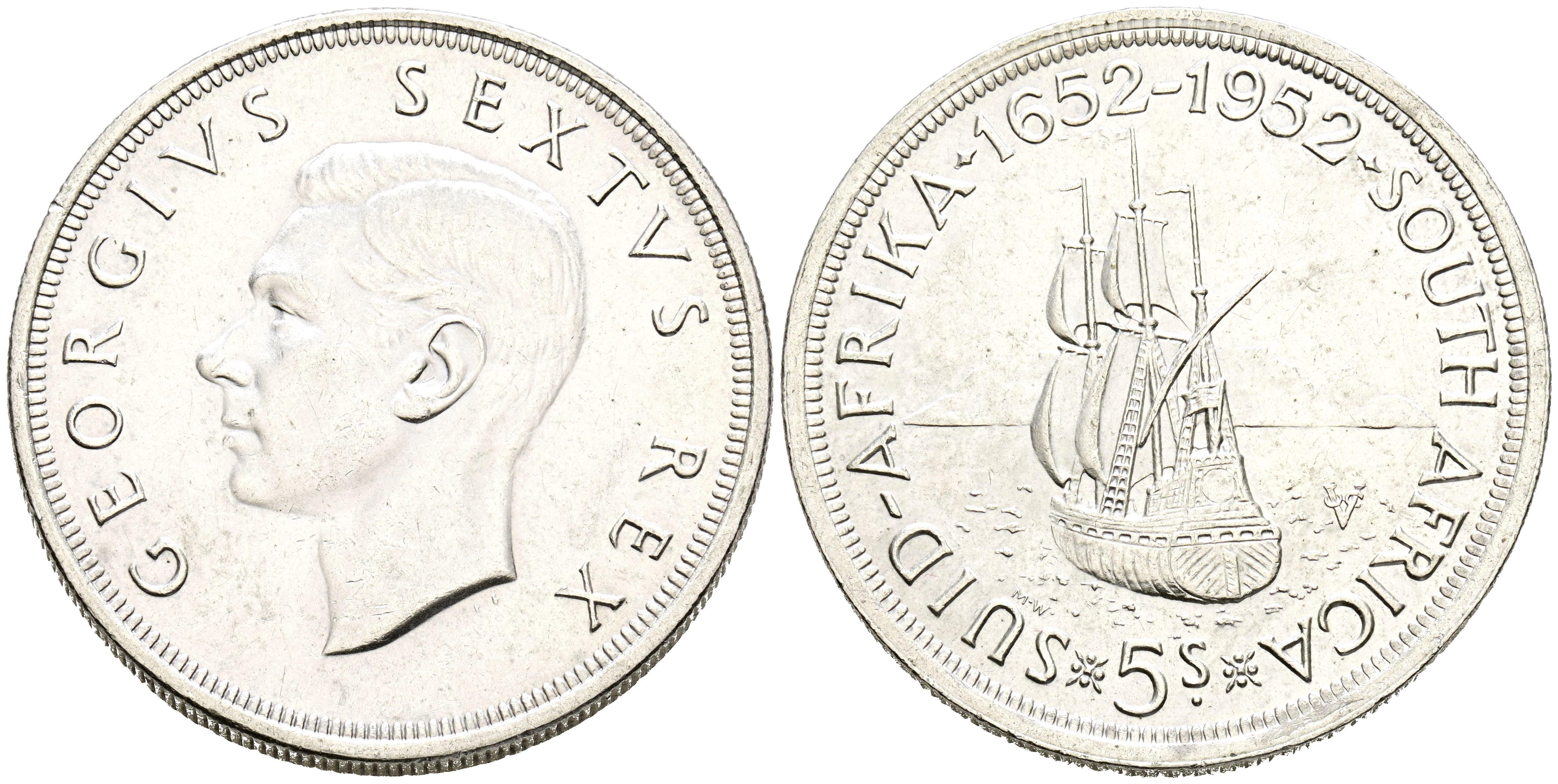 SUDÁFRICA. 5 Shillings. (Ar. 28,15g/39mm). 1952. Jorge VI. 300º Aniversario de la Fundación de Ciudad del Cabo. (Km#41). EBC+.
