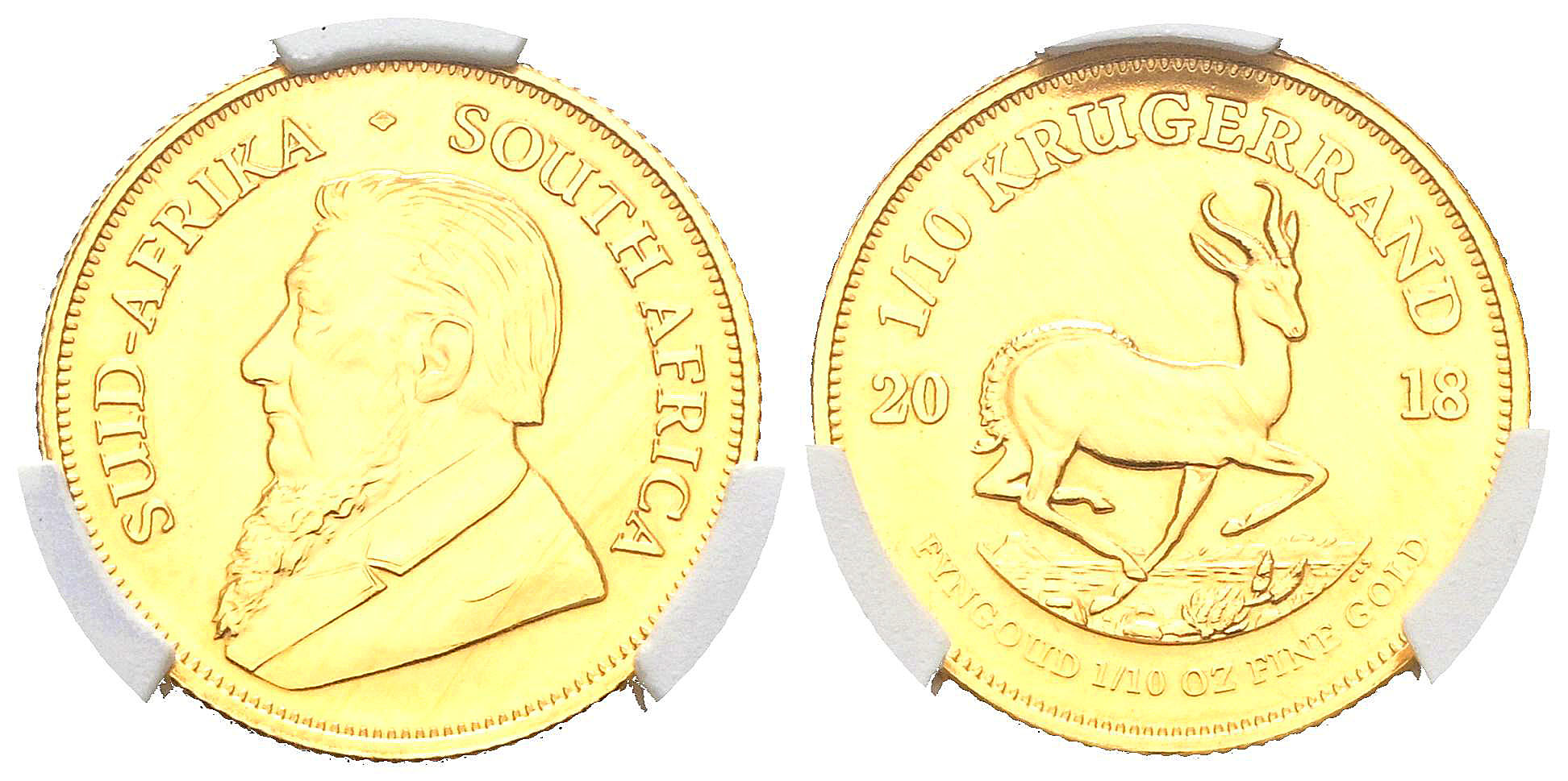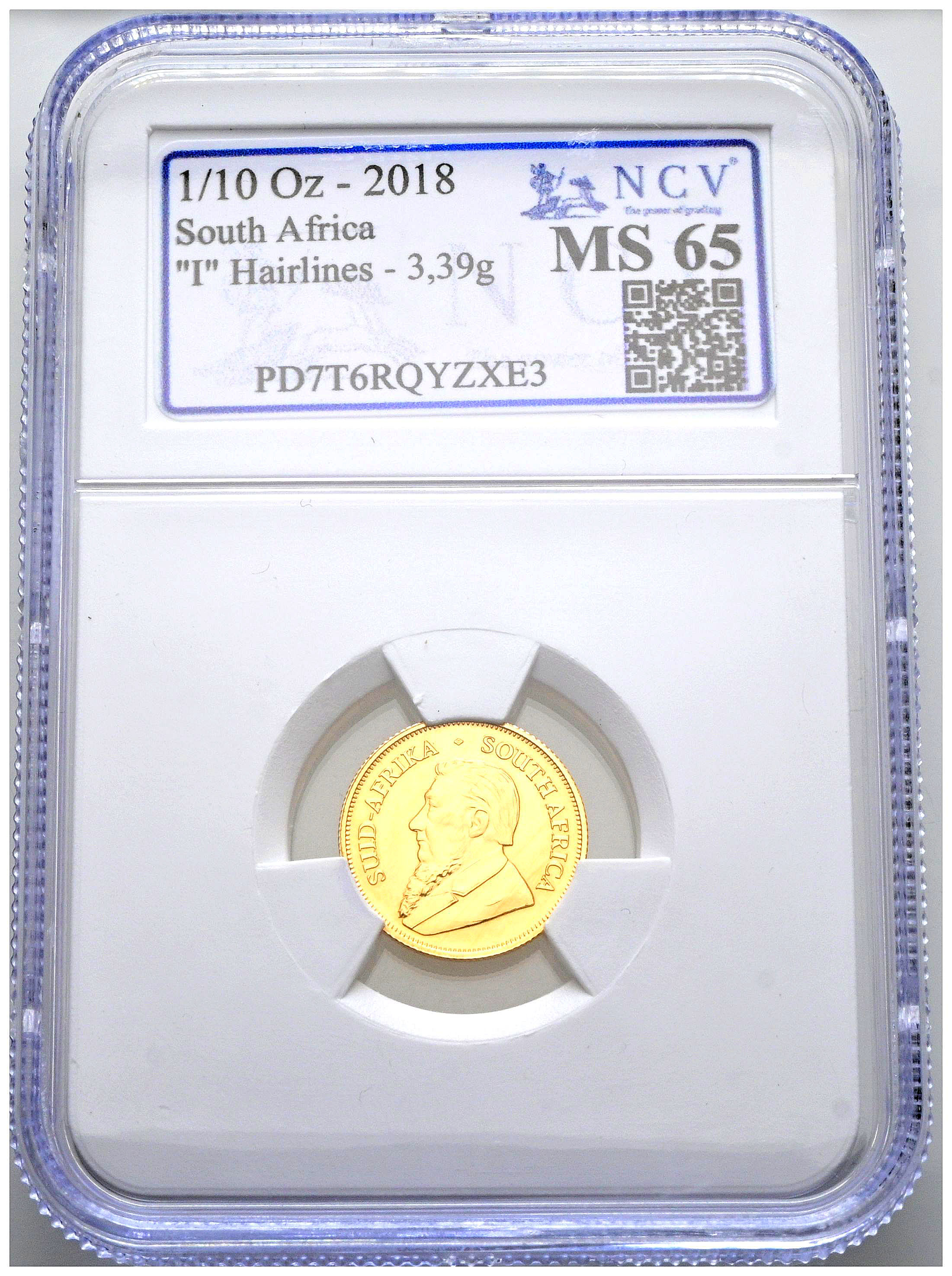 SUDÁFRICA. 1/10 Krugerrand (Au. 3,39g/17mm). 2018. Encapsulada por NCV. MS 65. I: Hairlines.