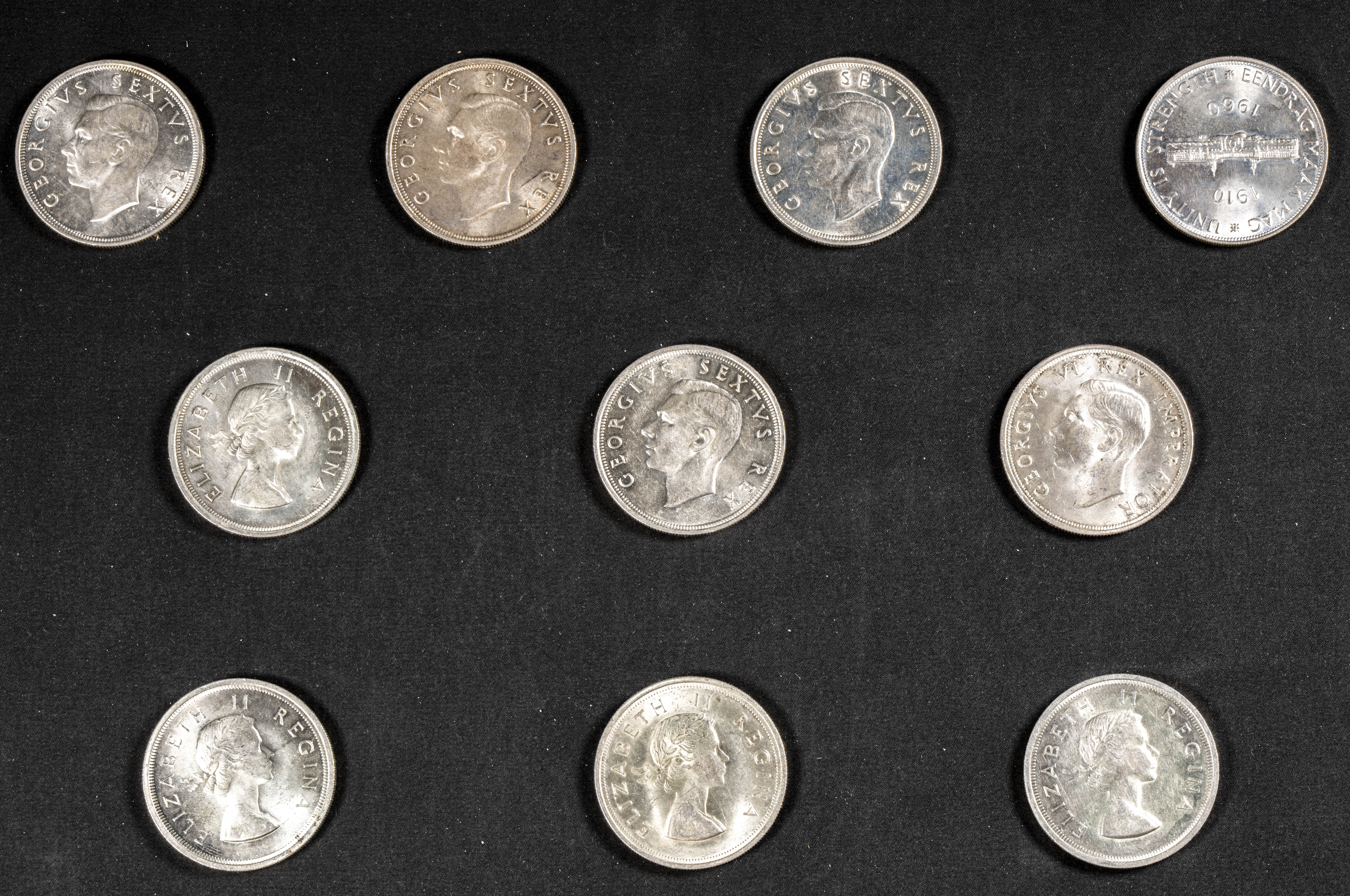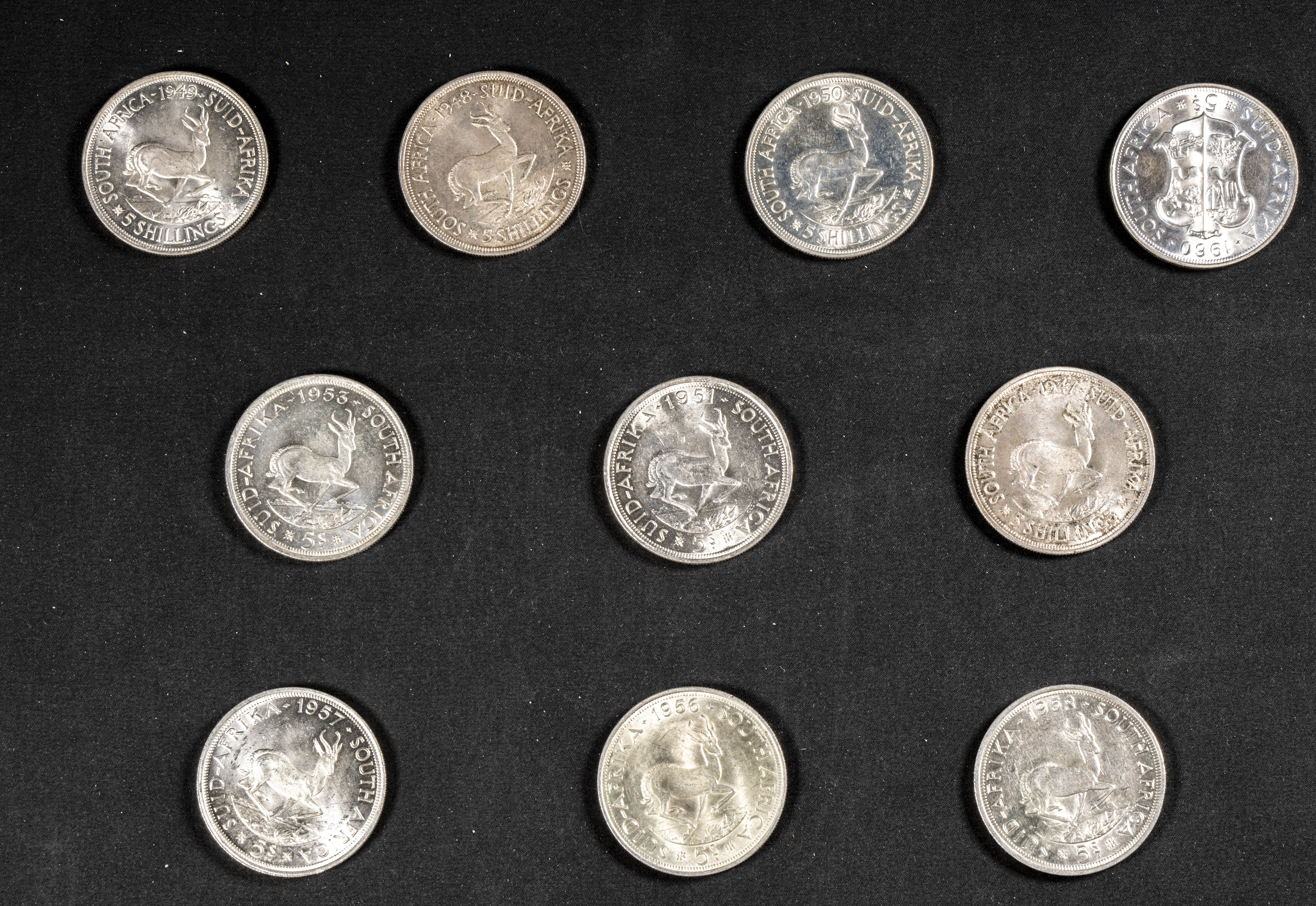 SUDÁFRICA. Interesante y bonito conjunto de 10 piezas en plata de 5 Shilling acuñados entre 1947 y 1960. Sin piezas repetidas y con un alto grado de conservación general. A EXAMINAR.