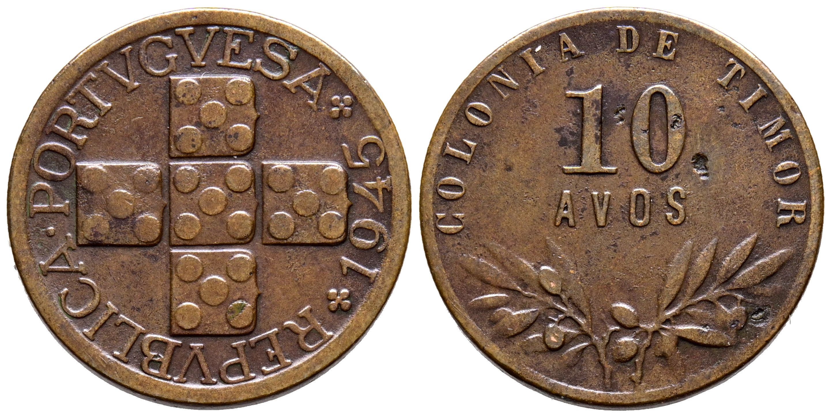 TIMOR (Portugués). 10 Avos (Ae. 3,03g/20mm). 1945. (Km#5). MBC+. Hojita en reverso. Rara.