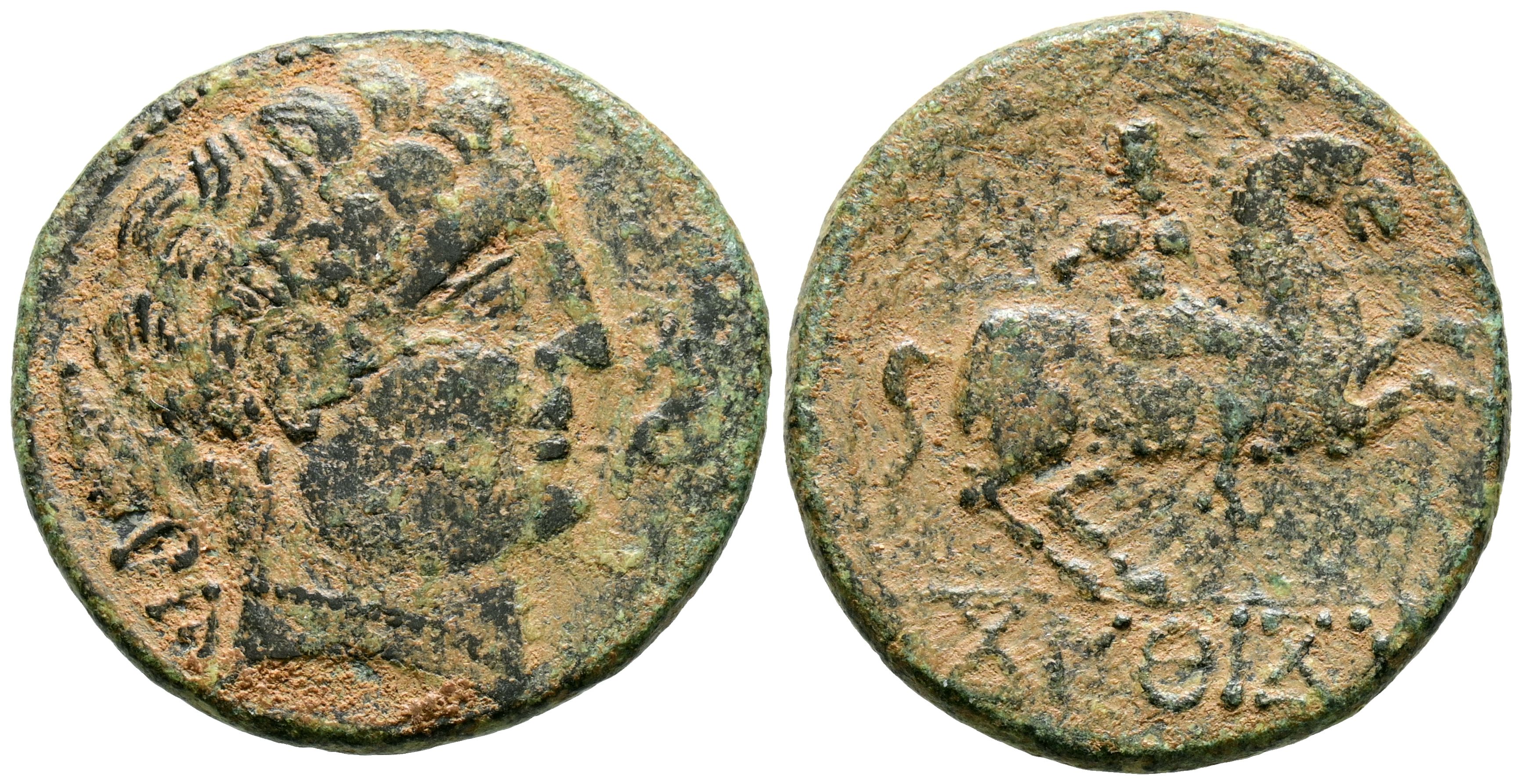 CONTERBIA CARBICA (Huete, Cuenca). As. (Ae. 9,48g/25mm). 120-80 a.C. (FAB-846). Anv: Cabeza masculina a derecha, detrás leyenda: CaRBiCa, delante delfín. Rev: Jinete con lanza a derecha, debajo leyenda ibérica bajo línea: CoNTeBaCoM. MBC-.