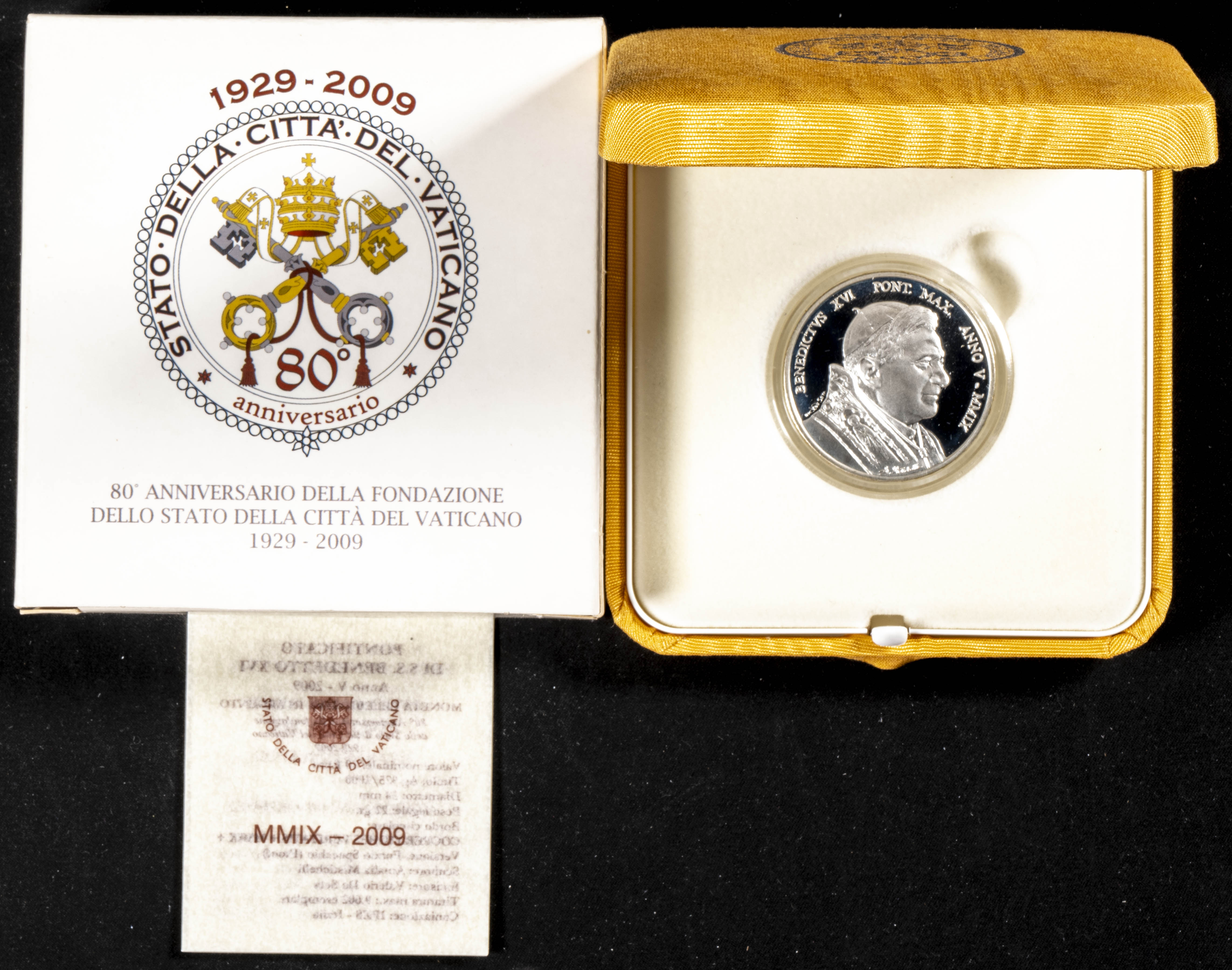 VATICANO. 10 Euros (Ar. 22,00g/34mm). 2009. Benedicto XVI. 80 Aniversario de la Fundación de la Ciudad del Vaticano. PROOF. Incluye estuche original y certificado de autenticidad. Escasa.