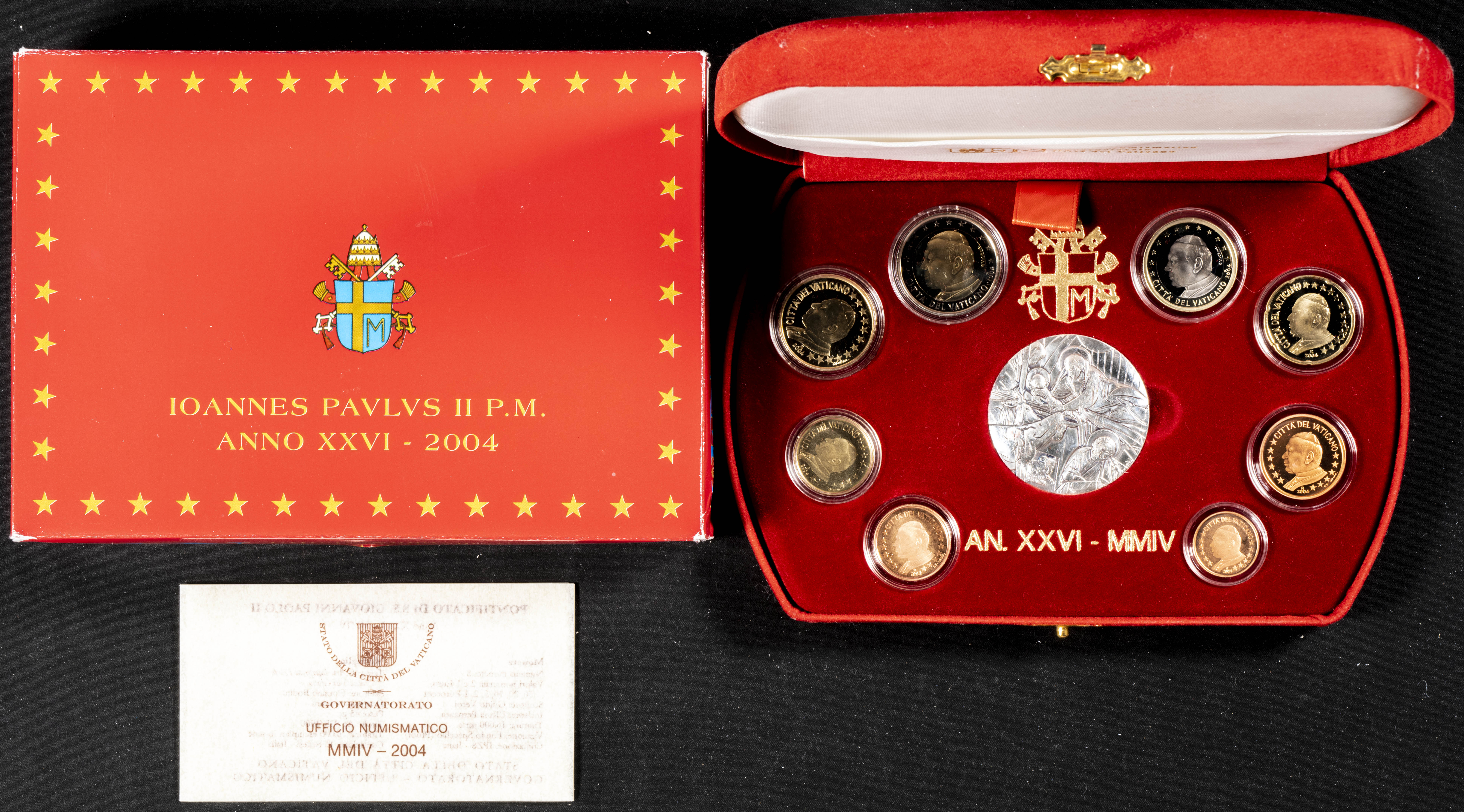 VATICANO. Set oficial completo con 8 valores comprendidos entre 1 Céntimos y 2 Euros. 2004. Juan Pablo II. Incluye, además, medalla de plata conmemorativa (Ar. 45,00g/40mm). Estuche completo con certificado de autenticidad. Monedas versión PROOF.