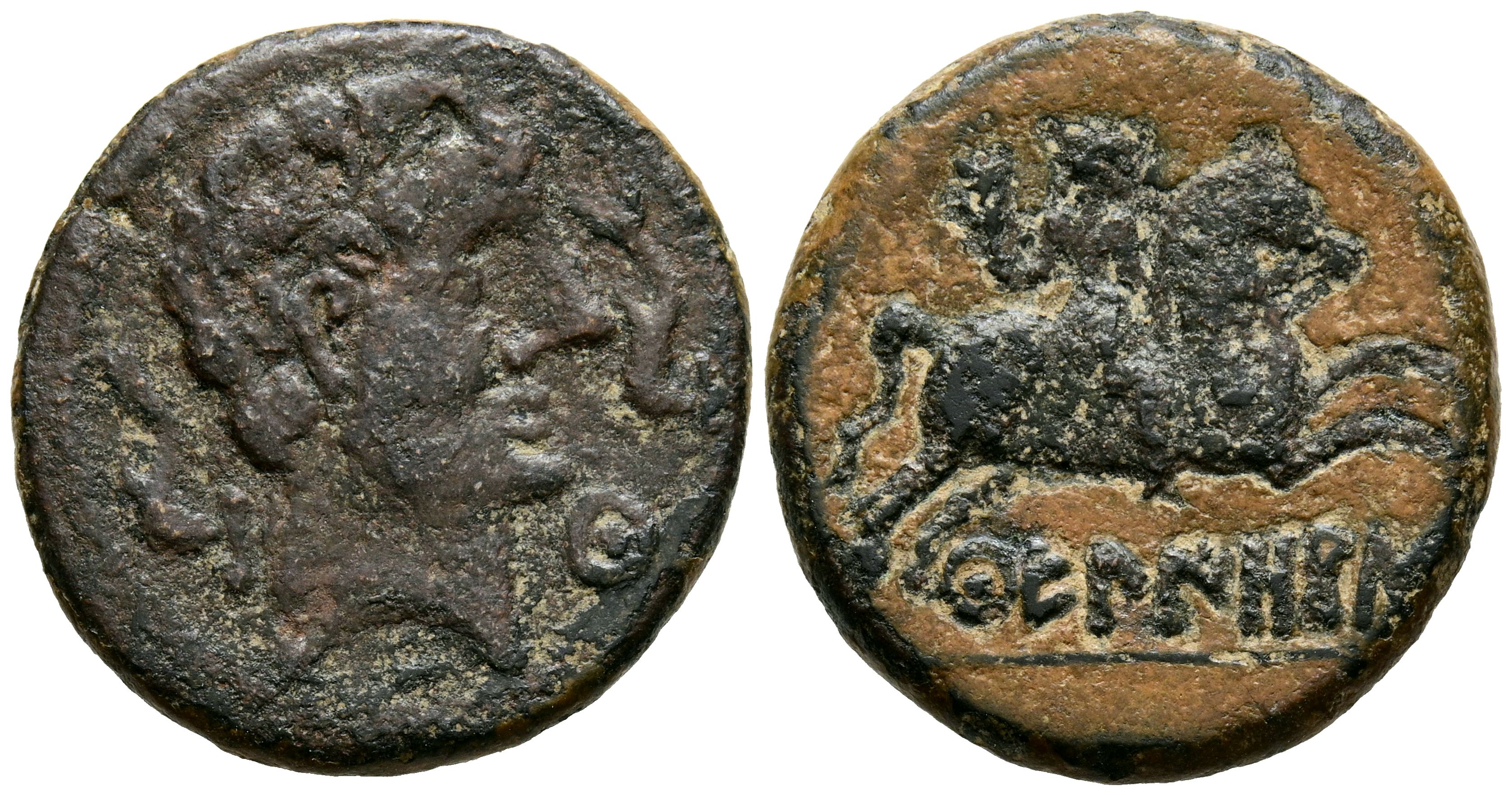 CUELIOCOS (Zona alta del Ebro). As. (Ae. 9,32g/24mm). 120-20 a.C. (FAB-870). Anv: Cabeza masculina a derecha, delante letra ibérica Cu, entre dos delfines. Rev: Jinete con palma a derecha, debajo leyenda ibérica: CuELIOCoS. MBC-.