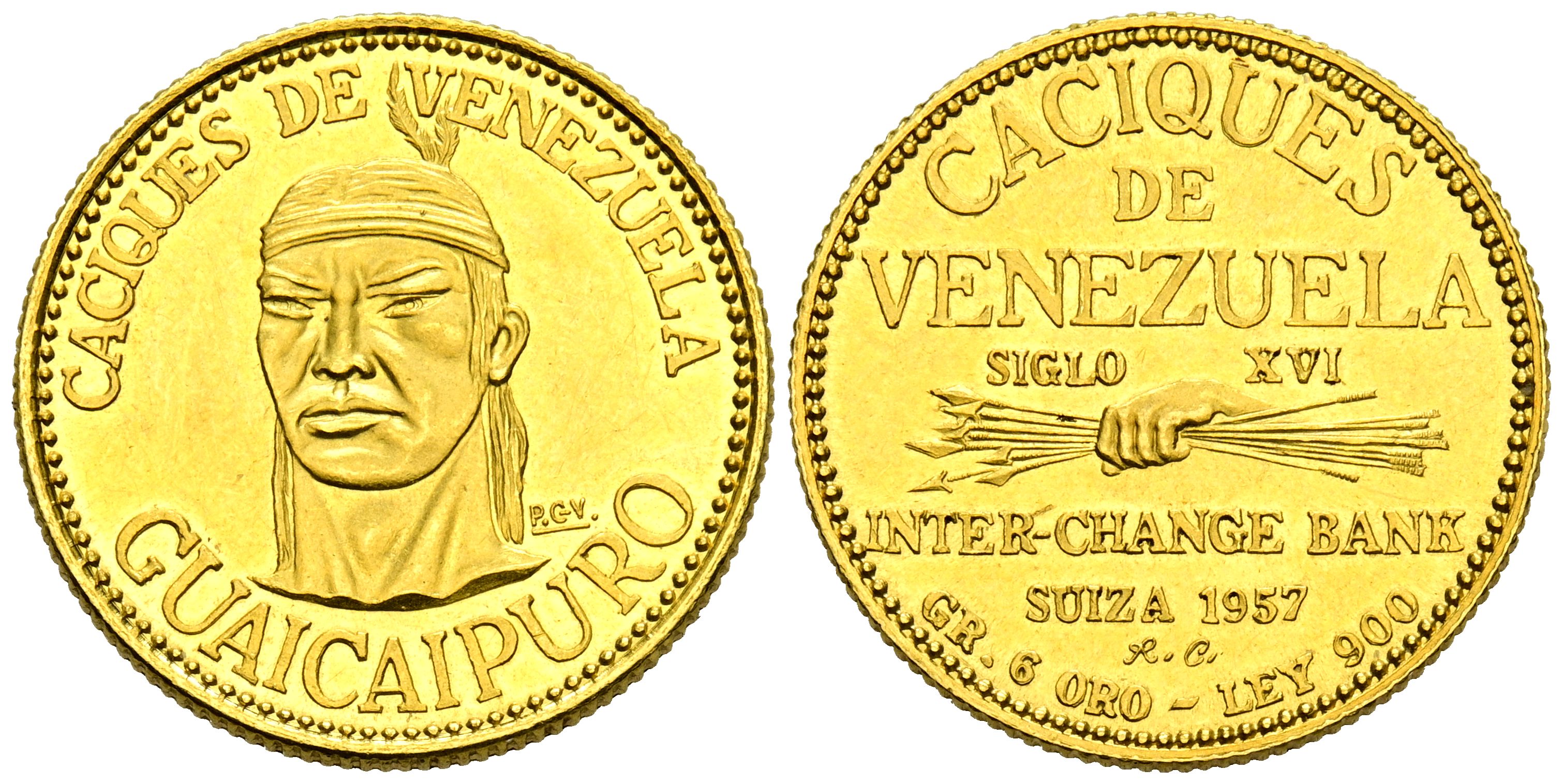 VENEZUELA. Caciques de Venezuela: Guaicaipuro. (Au. 6,00g /66mm). 1957. Suiza. Inter-Change Bank. PROOF. Leves rayitas.