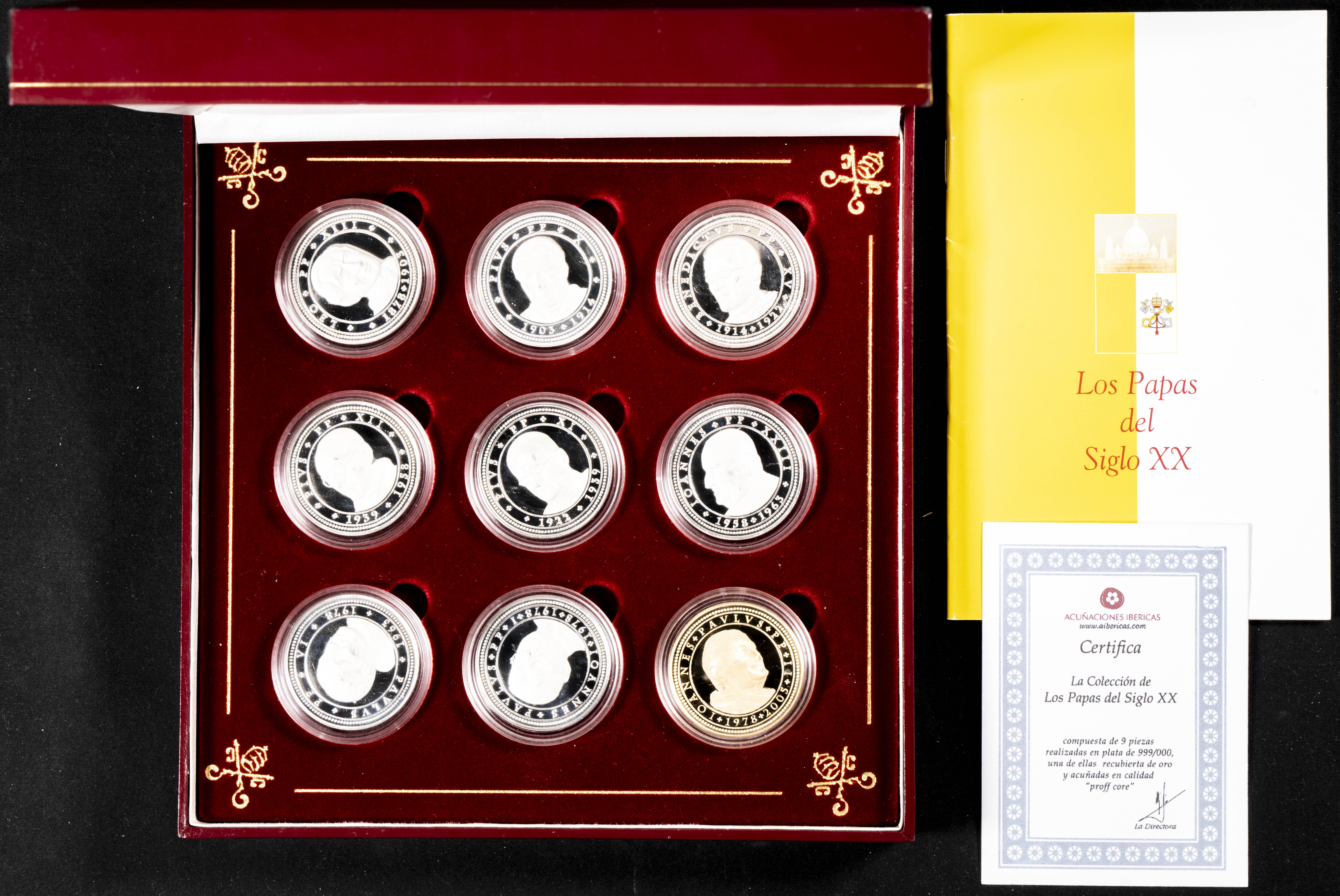 ESPAÑA. Estuche compuesto por 9 medallas de plata (1 con baño de oro) conmemorativas de Los Papas del Siglo XX . (Peso/medida medio por pieza, 16,60g/35mm). Incluye estuche original, certificado de autenticidad emitido por Acuñaciones Ibéricas y libreto biograficos sobre la historia de los 9 pontífices. PROOF. A EXAMINAR.