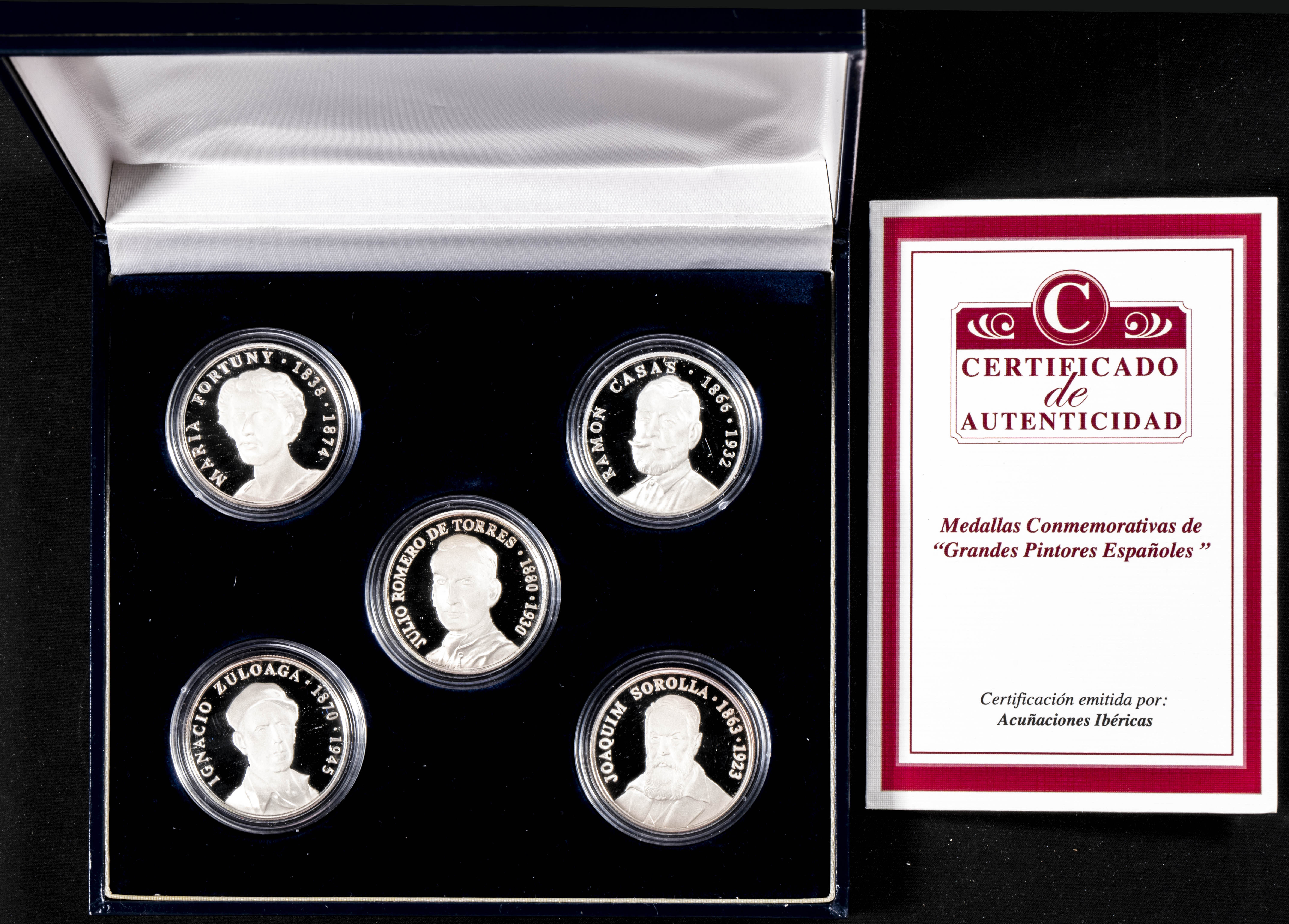 ESPAÑA. Estuche compuesto por 5 medallas de plata conmemorativas de Grandes Pintores Españoles. (Peso total del conjunto: 66g). Incluye estuche original y certificado de autenticidad emitido por Acuñaciones Ibéricas. PROOF. A EXAMINAR.