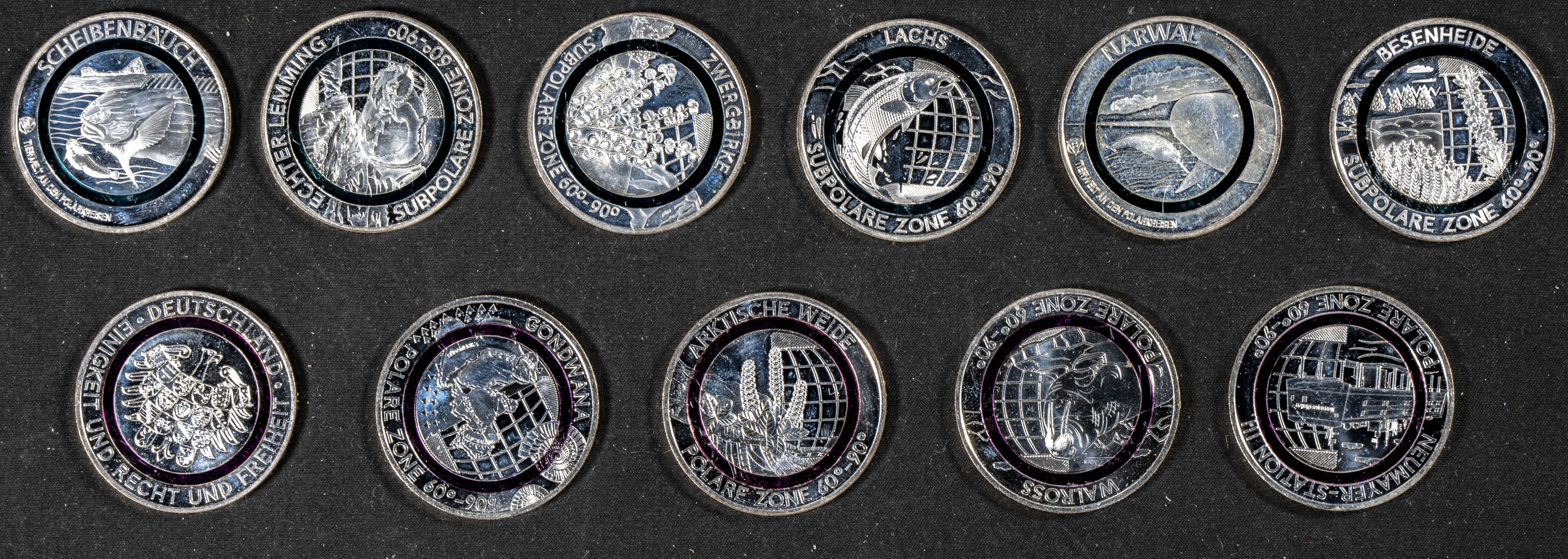 ALEMANIA. Conjunto de 11 medallas de plata conmemorativas de los principales hitos y personajes históricos del país. Peso total del conjunto 163g. Perfecto estado de conservación. A EXAMINAR.