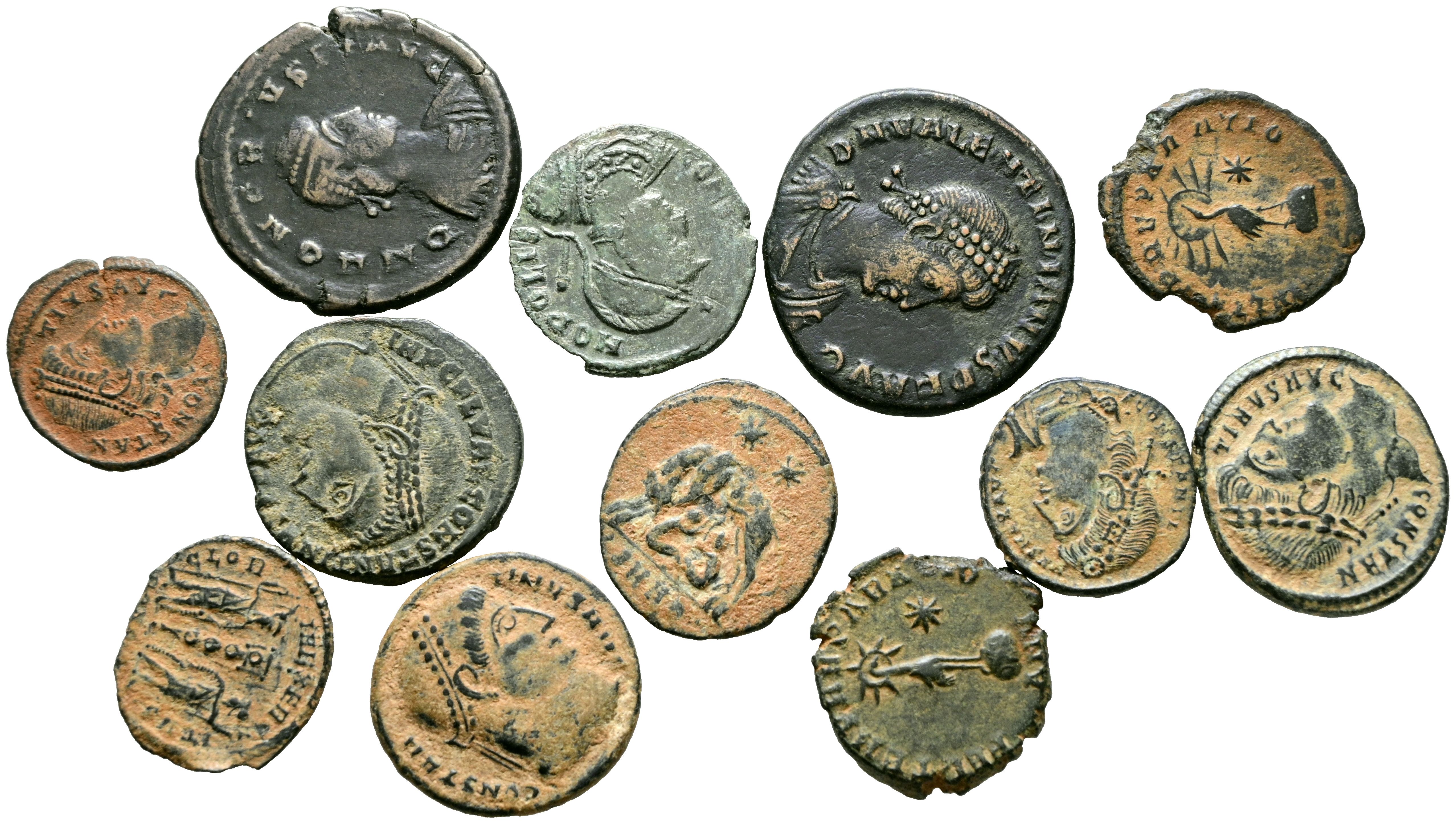 IMPERIO ROMANO. Conjunto de 12 pequeños bronces de distintos emperadores del bajo imperio, distintas cecas y reversos. A EXAMINAR.