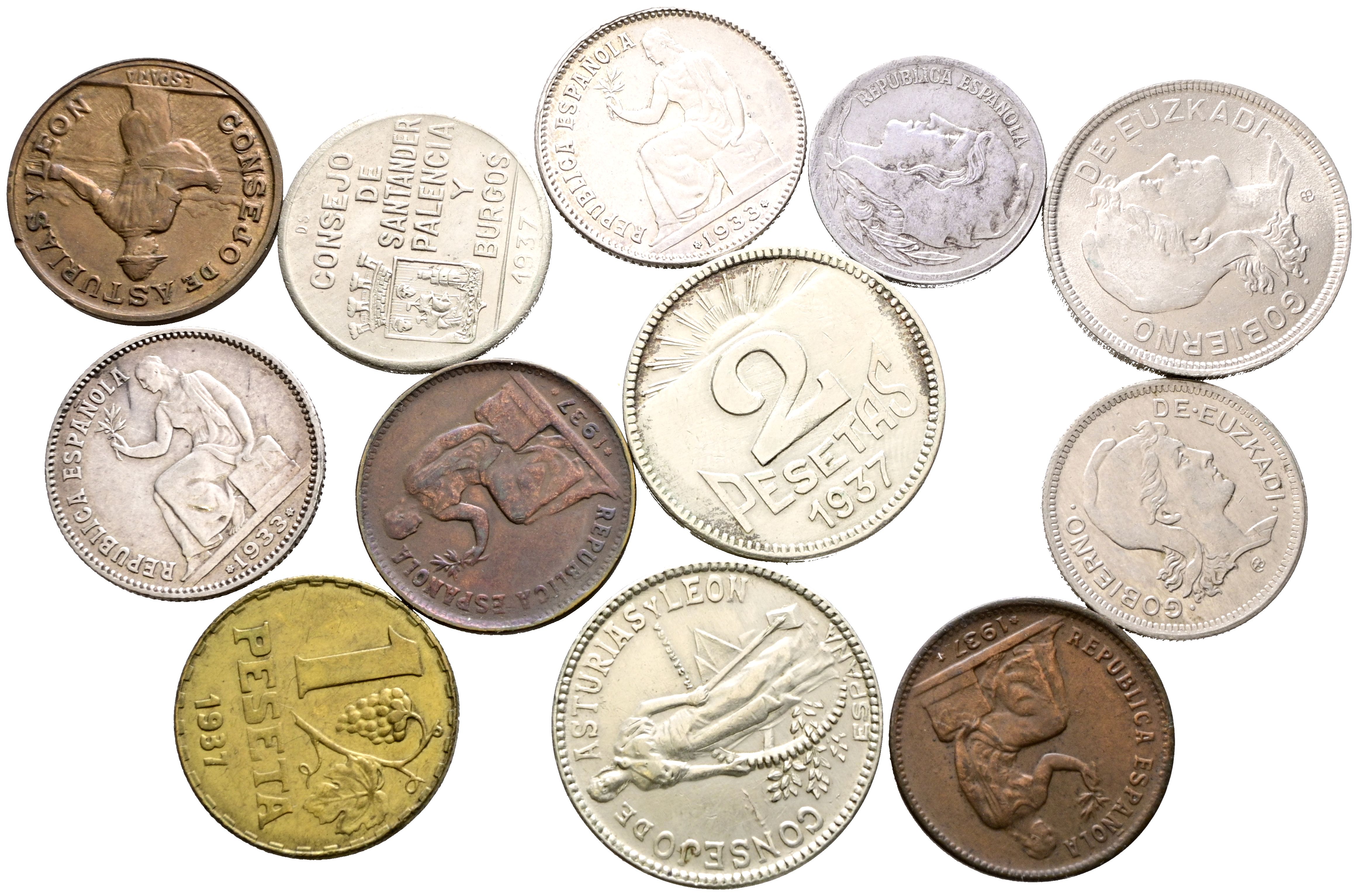 II REPÚBLICA Y GUERRA CIVIL. Conjunto formado por 13 monedas acuñadas durante este periodo con una gran variedad de módulos. Diferentes estados de conservación. A EXAMINAR.