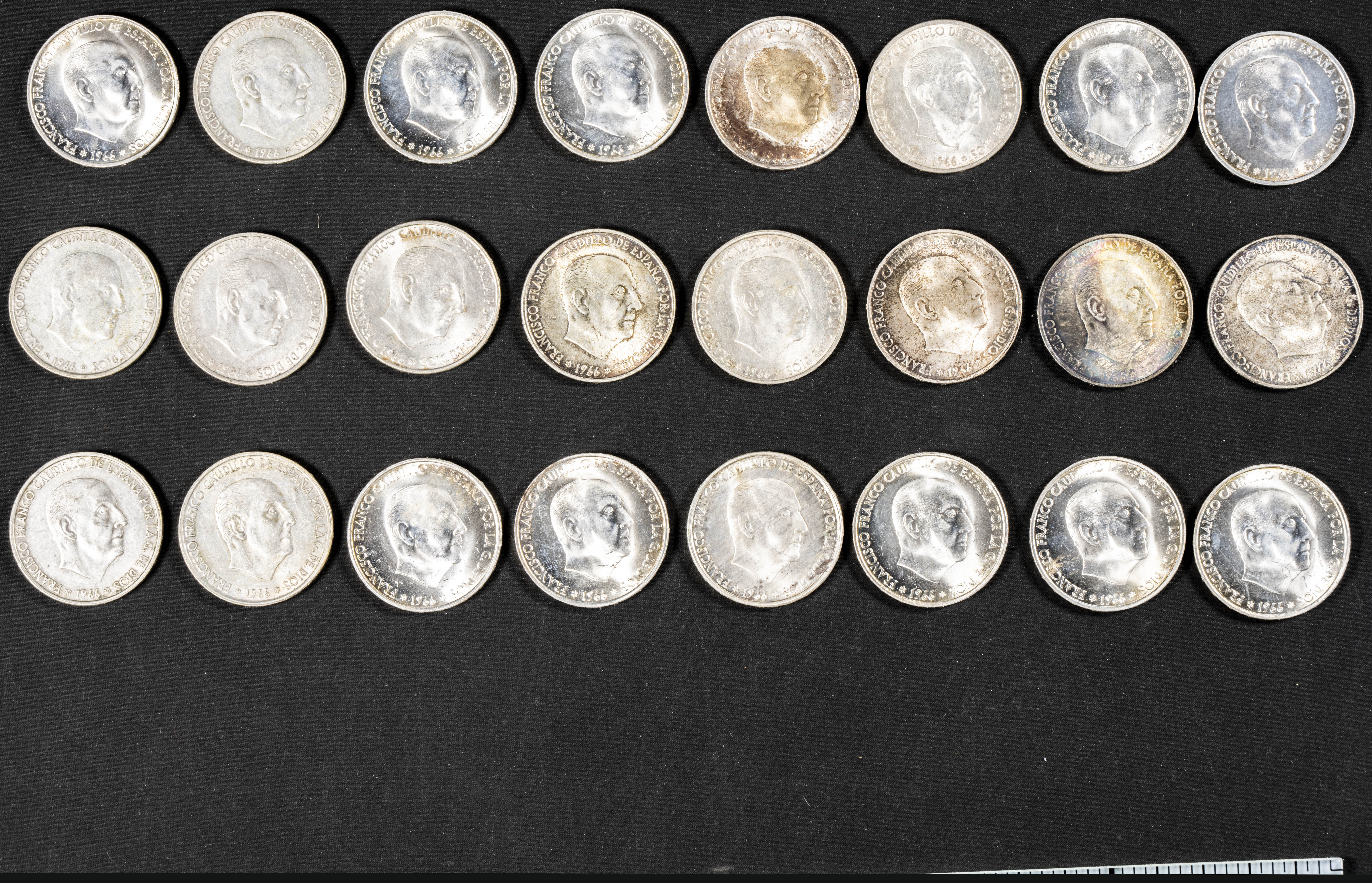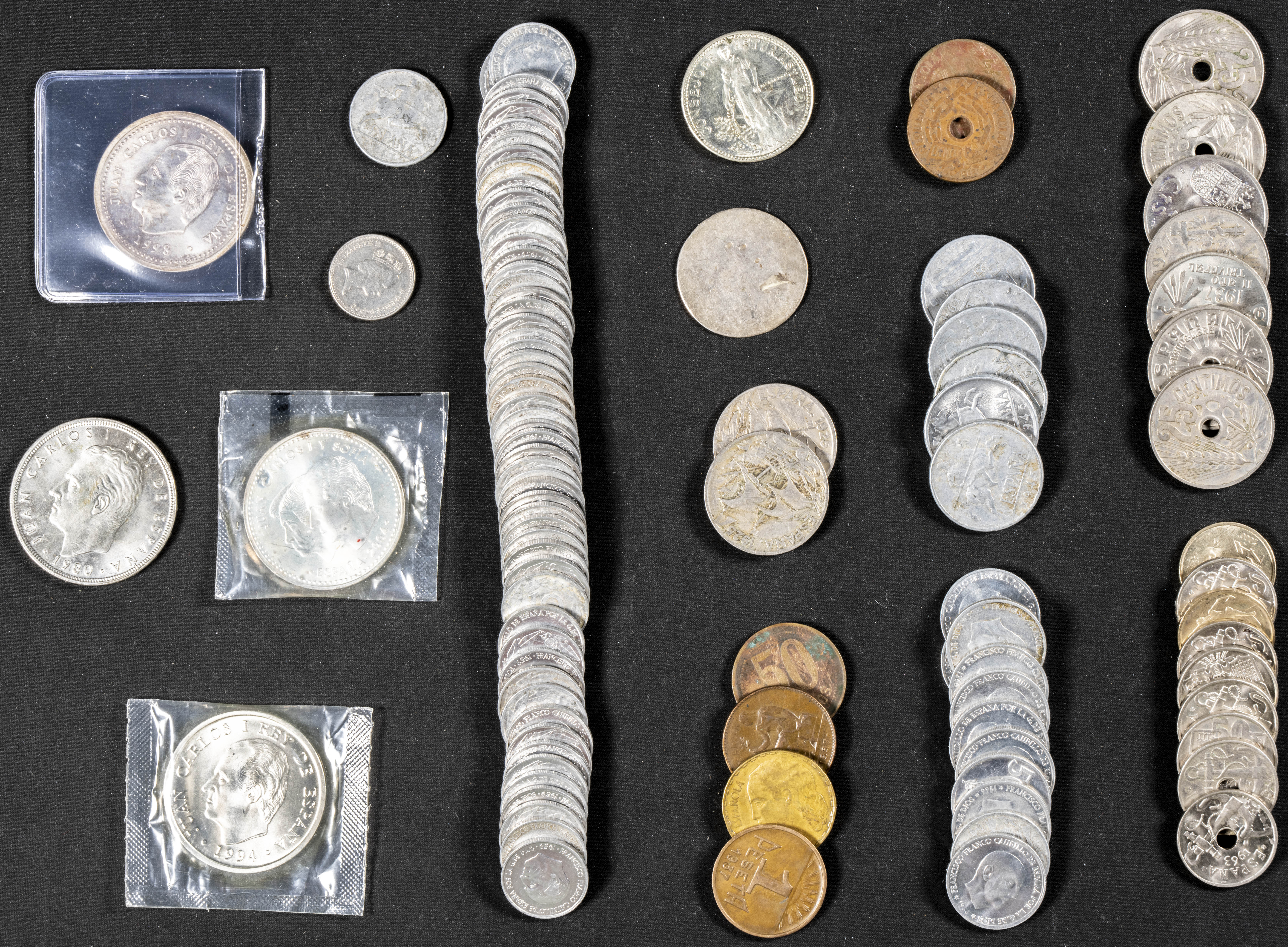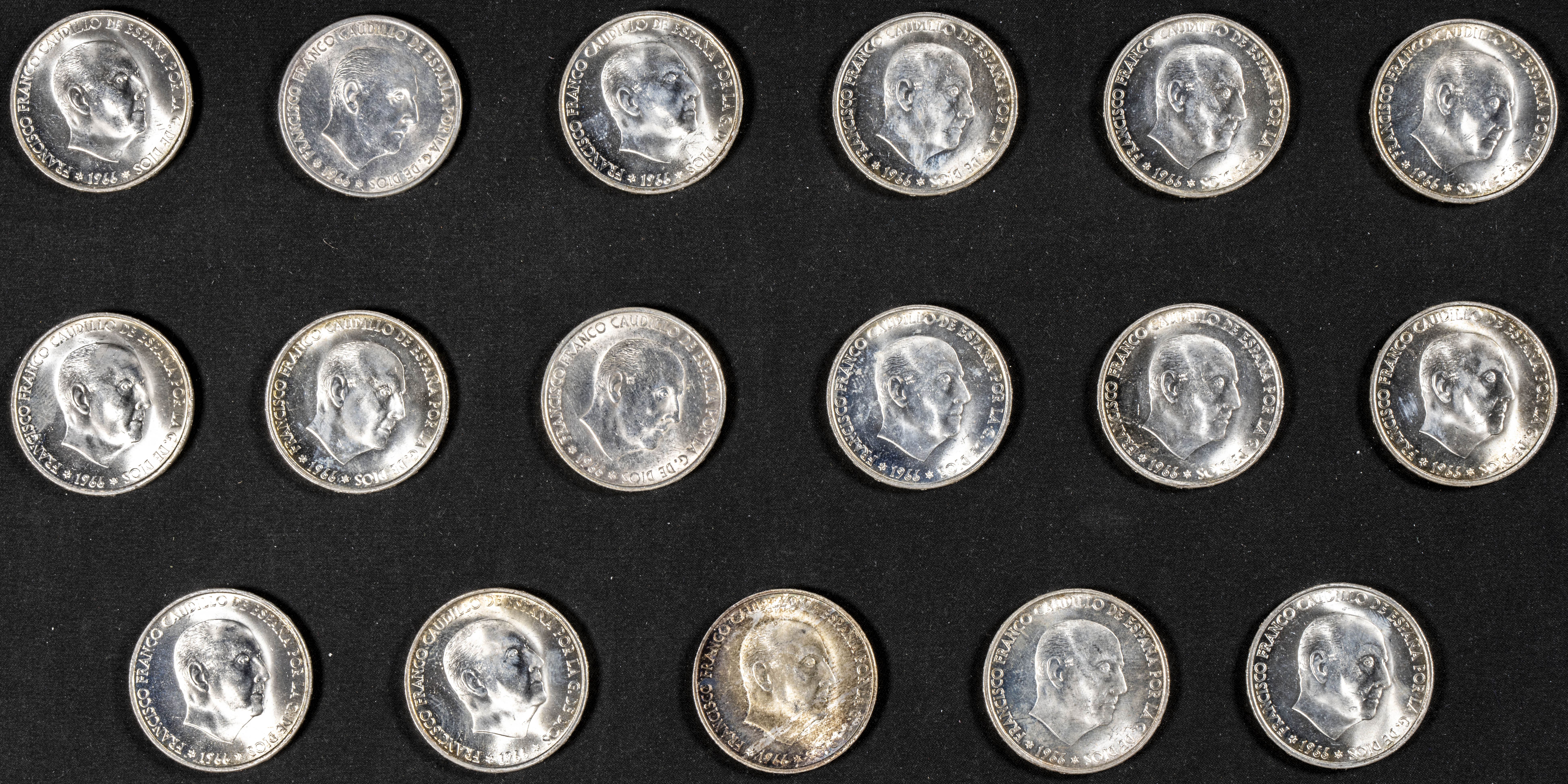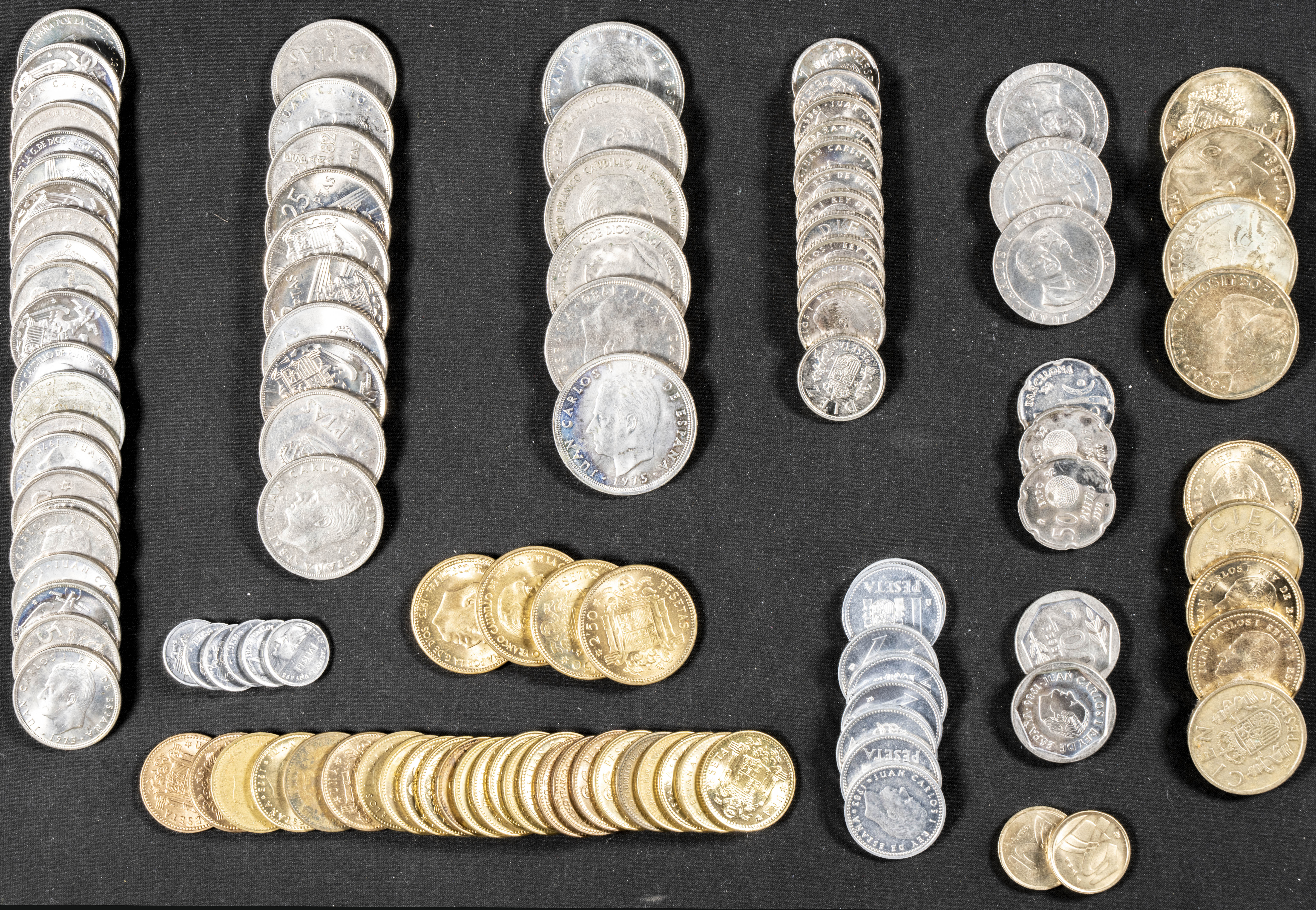 ESTADO ESPAÑOL Y JUAN CARLOS I. Magnífico lote con acuñaciones de ambos periodos donde destacan 44 monedas de plata de los módulos de 100 Pesetas de 1966 (41) y 2000 Pesetas (3). Diferentes estados de conservación con mención especial a una buena parte de las piezas de 100 Pesetas sacadas directamente de cartucho (1966 *66). A EXAMINAR.
