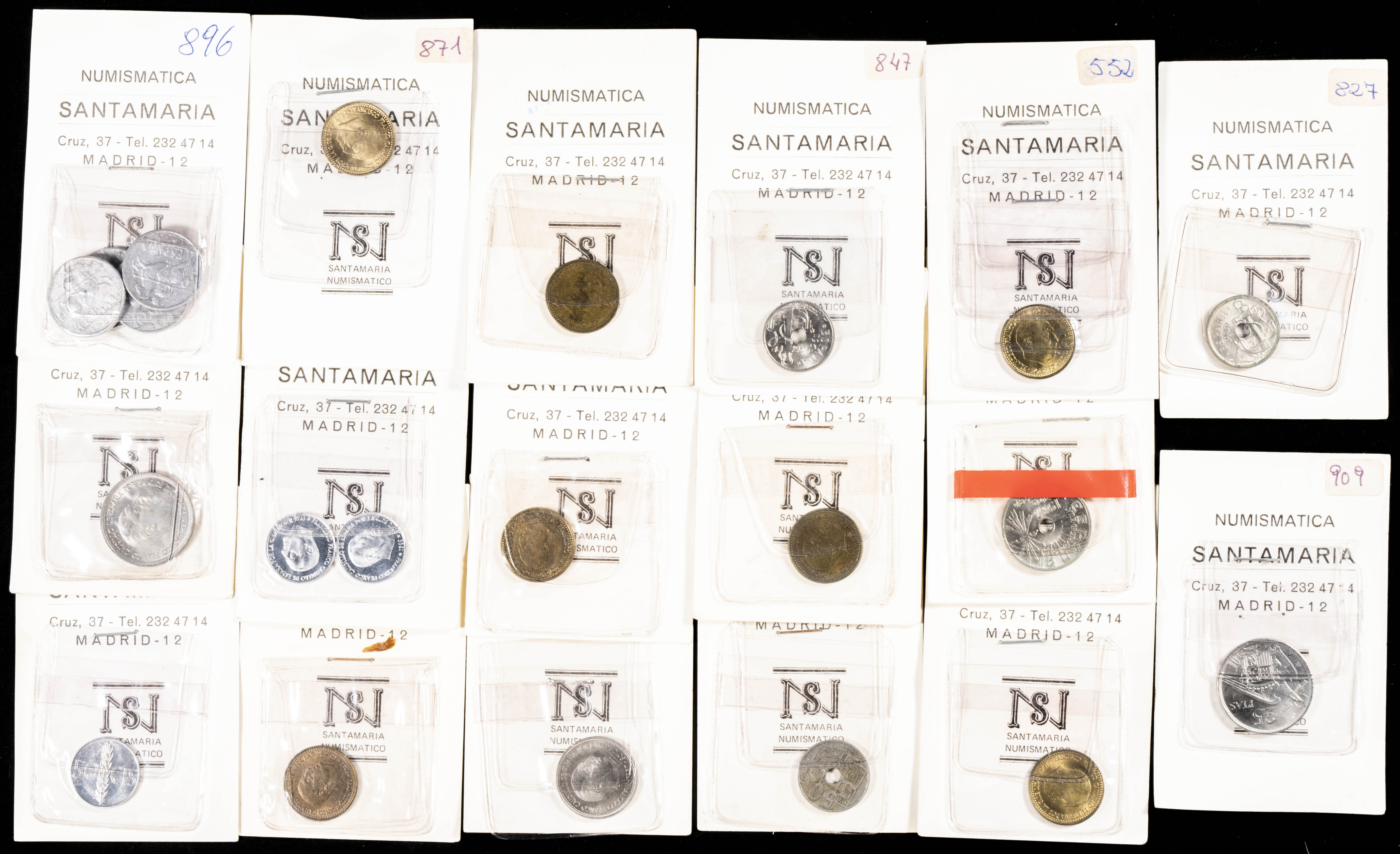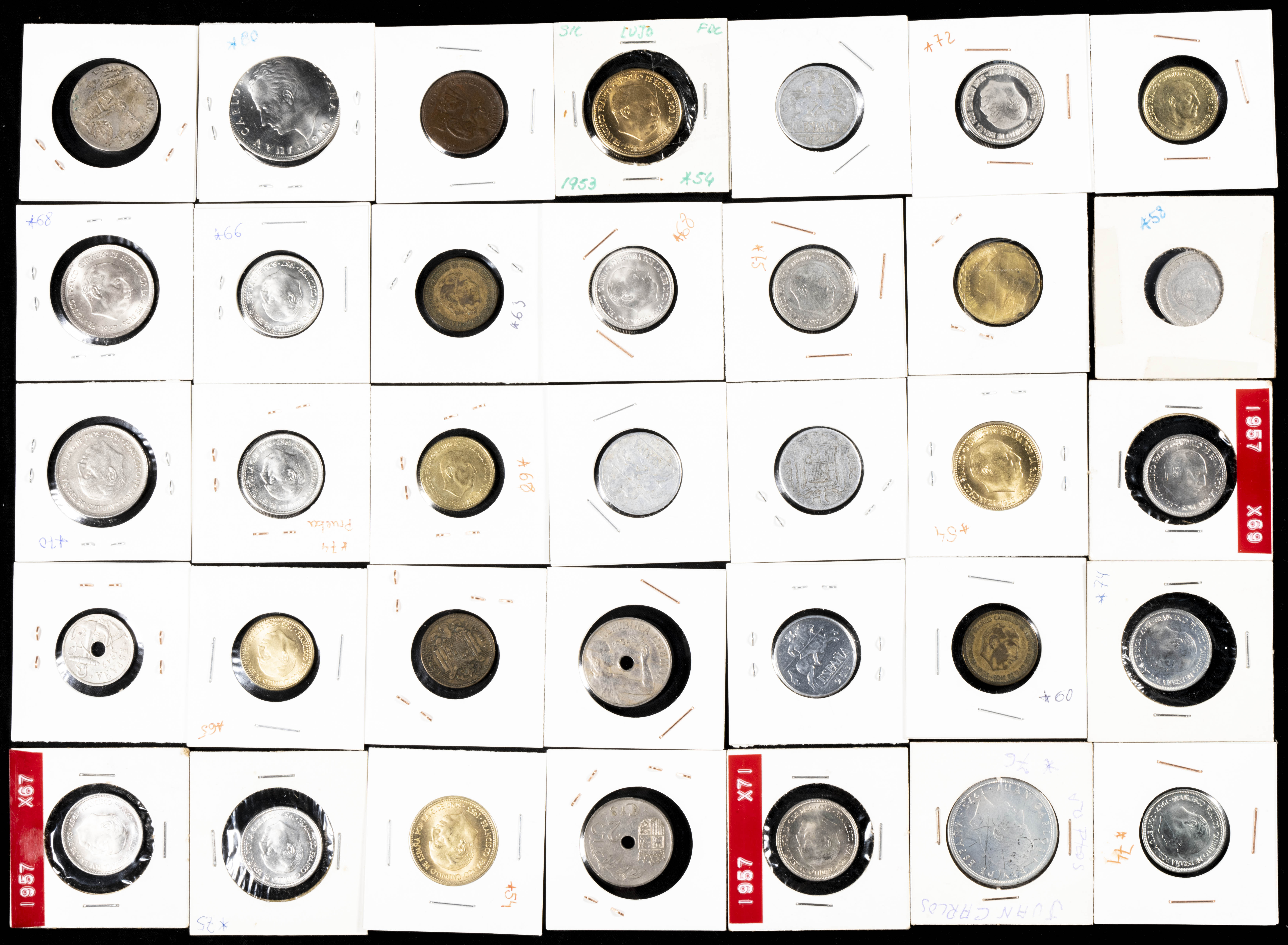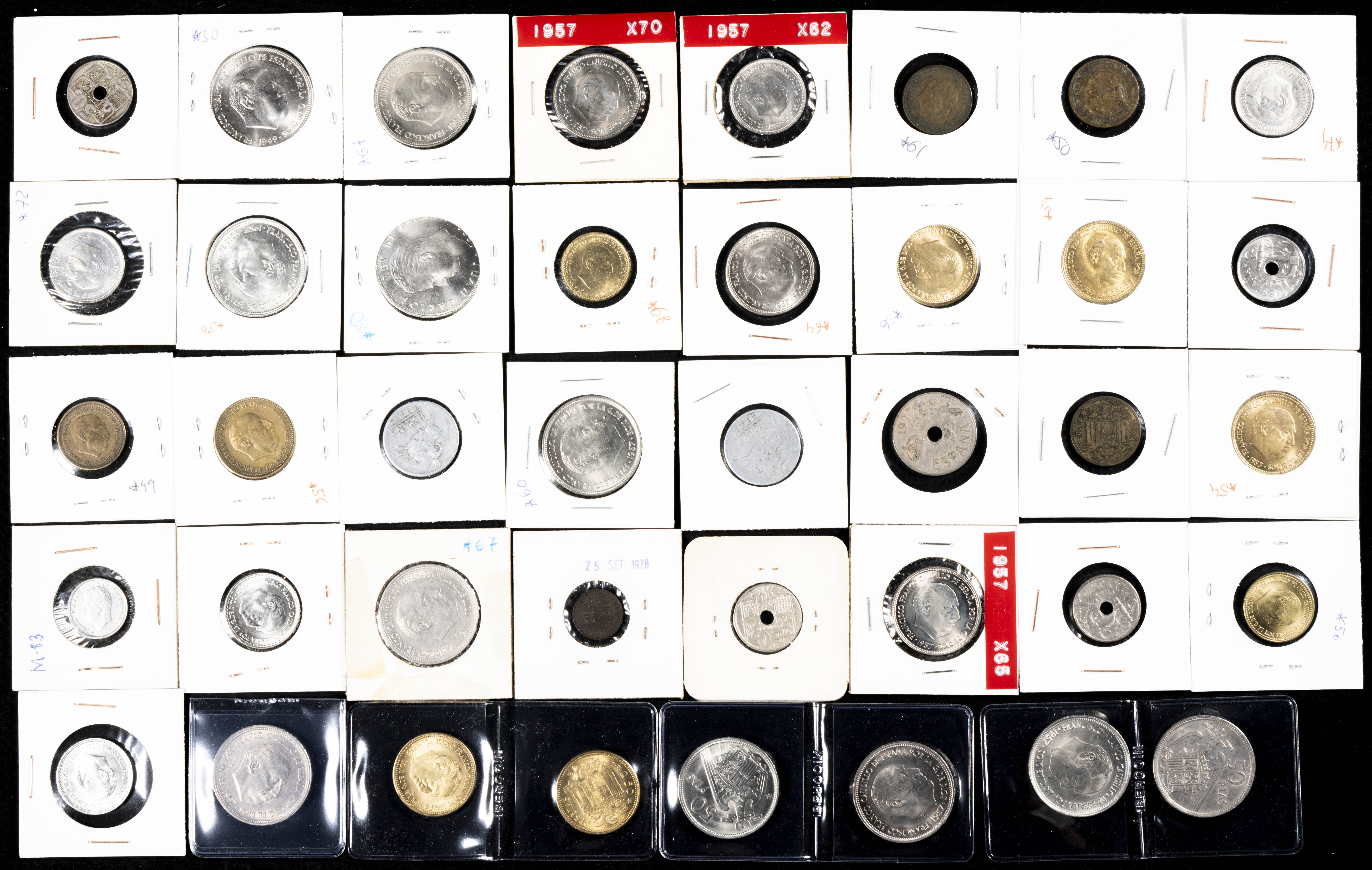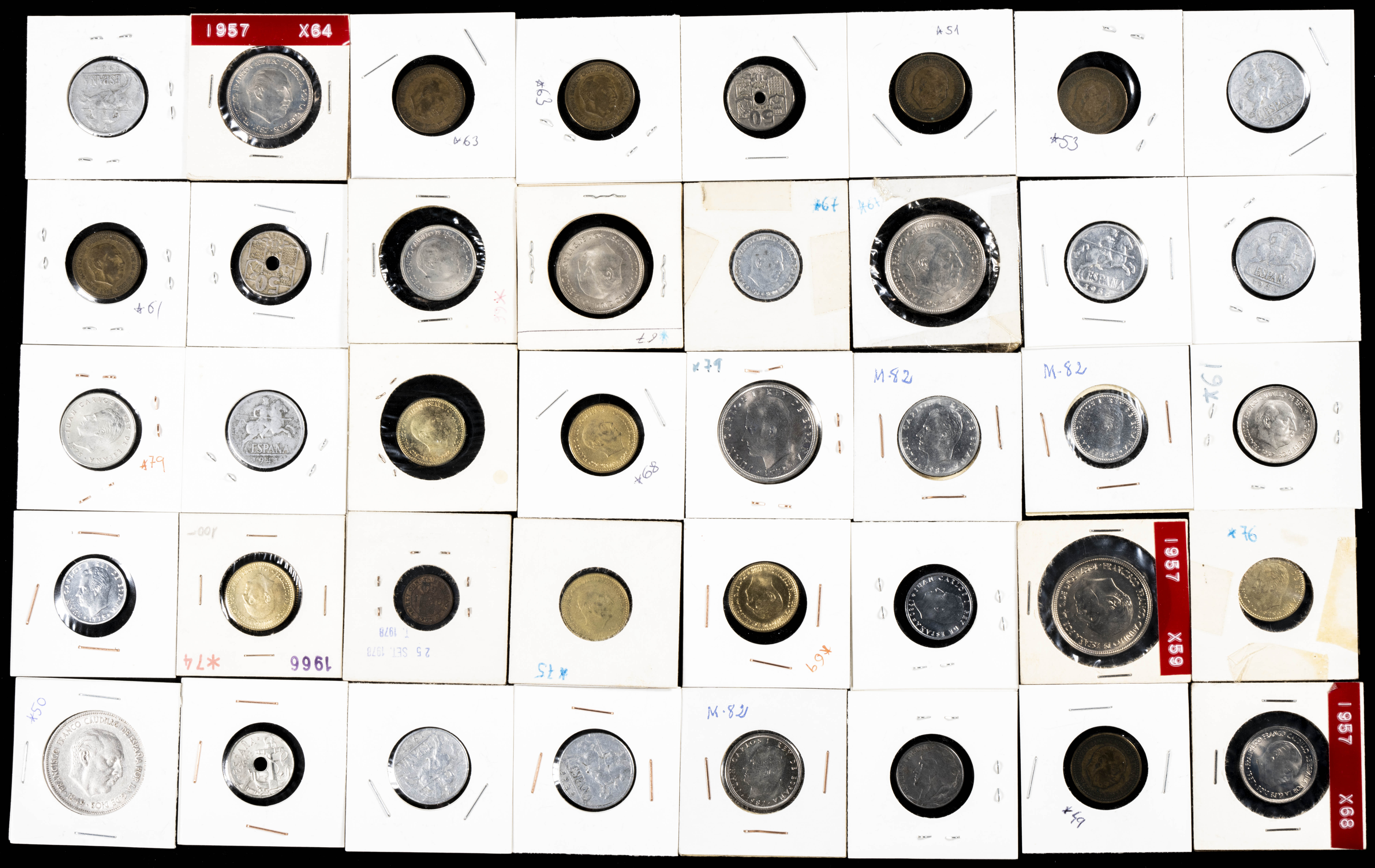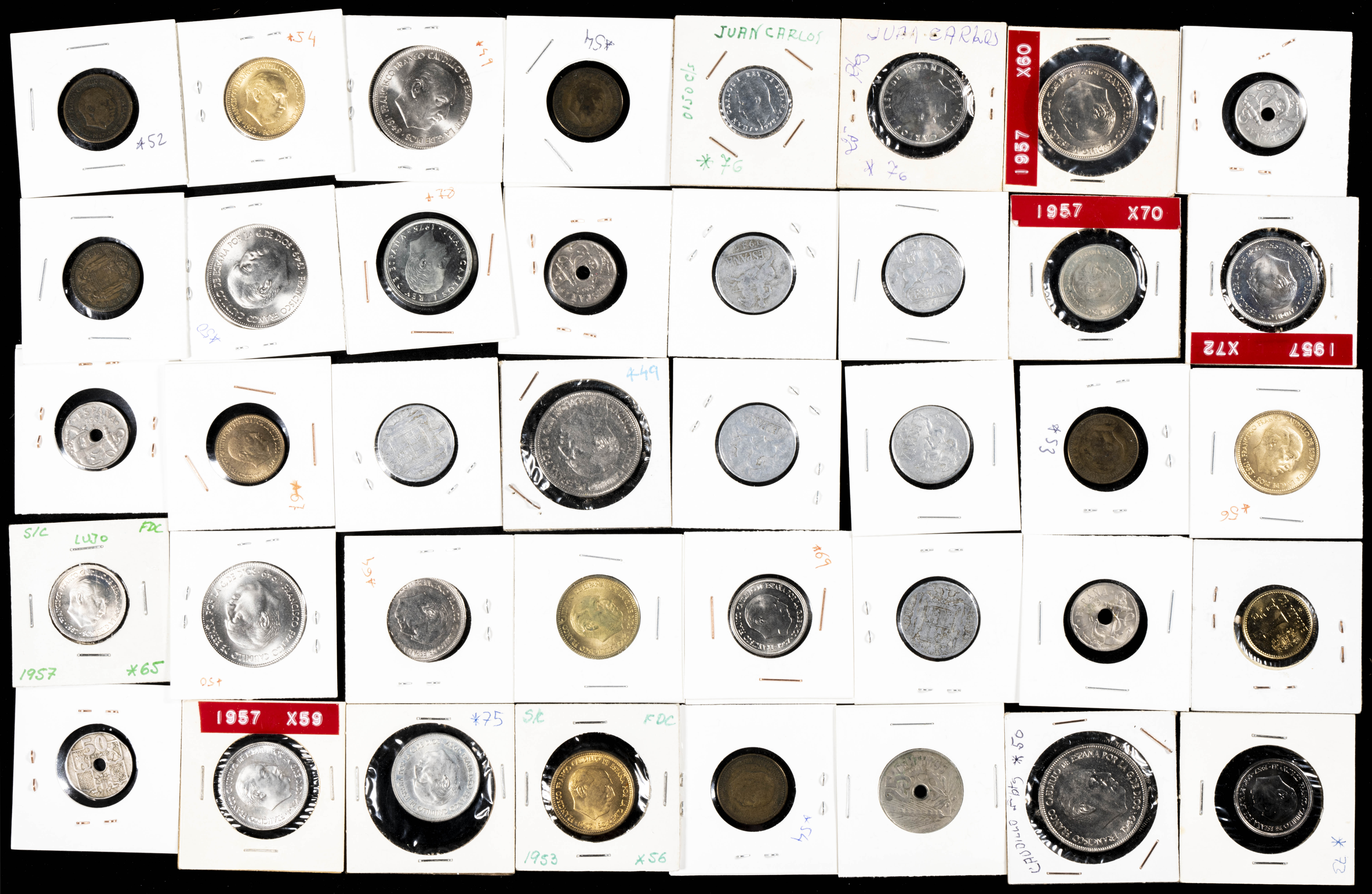 ESTADO ESPAÑOL Y JUAN CARLOS I. Extraordinario conjunto formado por cientos de monedas en cartoncillos, tiras, carteras y estuches acuñados en ambos periodos (también hay un pequeño resto de piezas anteriores a estos periodos). Este conjunto es de especial interés para los coleccionistas de este periodo ya que, aunque hay piezas en todas las calidades, las piezas en estados SC y con pátina son abundantes. Destacan además por una interesante selección de carteras (incluye la *73 faltando el valor de 25 Pesetas) y numerosas piezas conmemorativas en plata de las 200 Pesetas de 1989. A EXAMINAR.