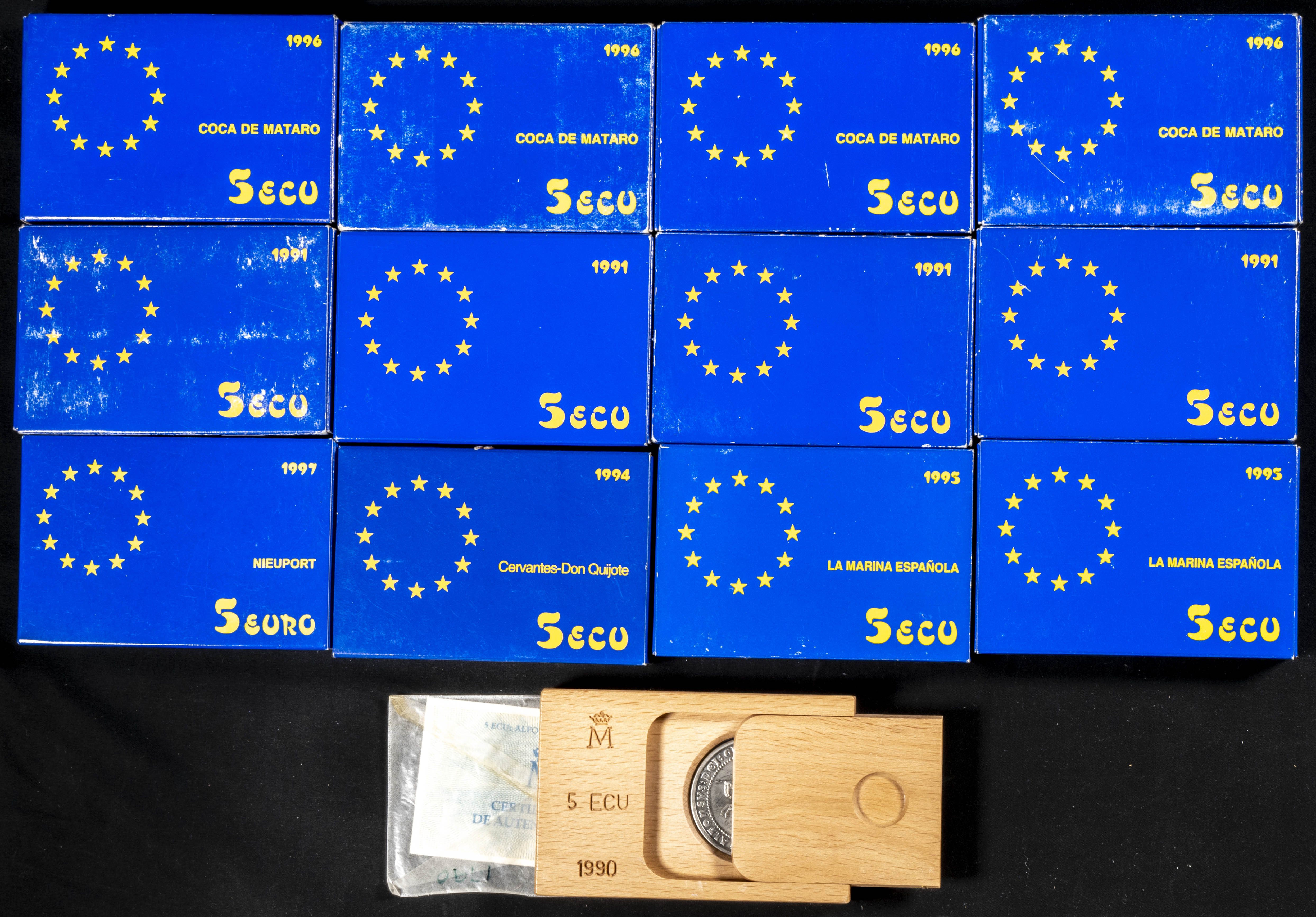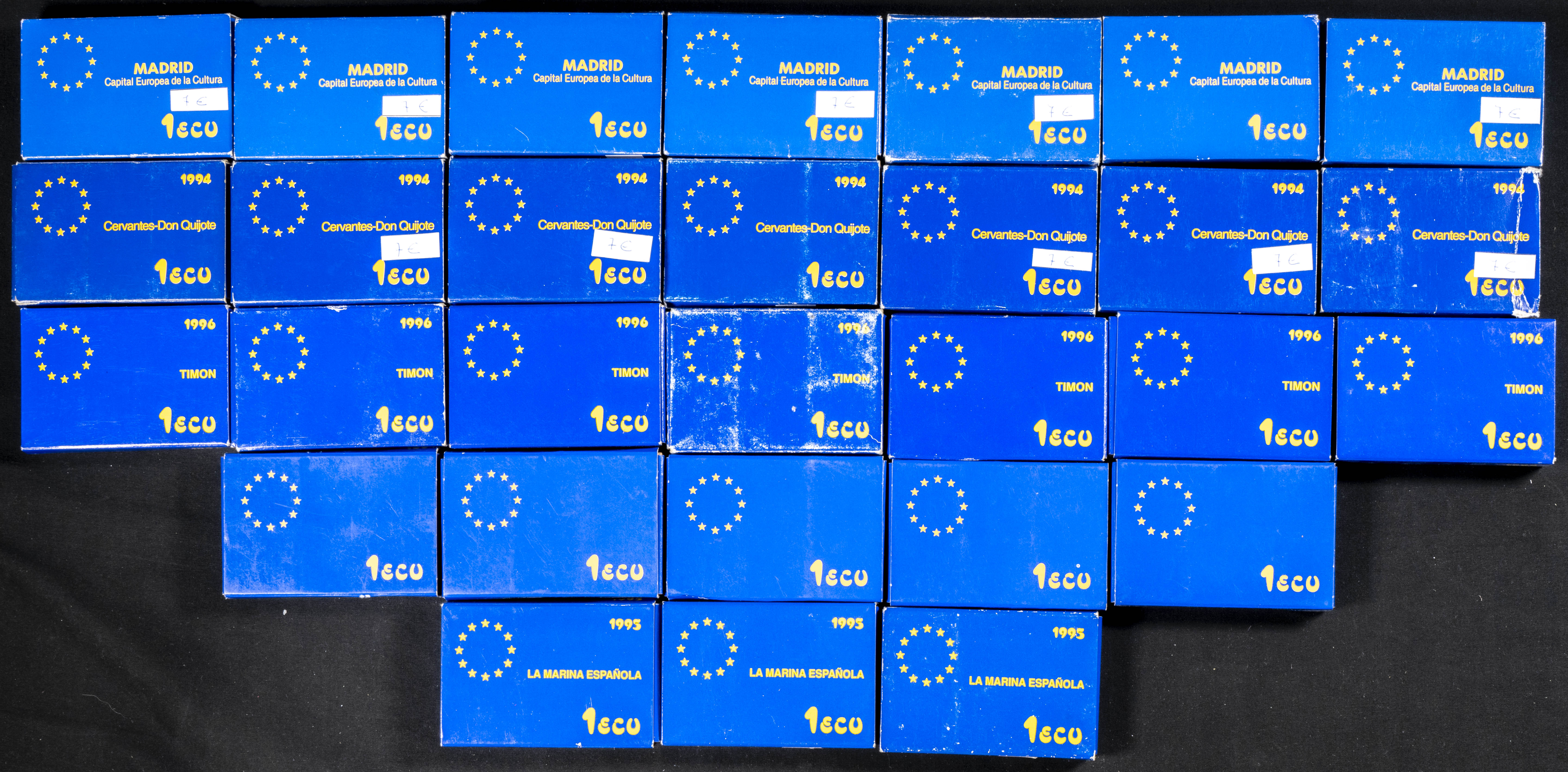 CONTEMPORÁNEO. Magnífico y extenso conjunto formado por 42 estuches de 1 y 5 Ecu de diferentes fechas y por 12 Sets o carteras conmemorativas tanto de Euros como de Pesetas. Muy buen estado de conservación general. A EXAMINAR.
