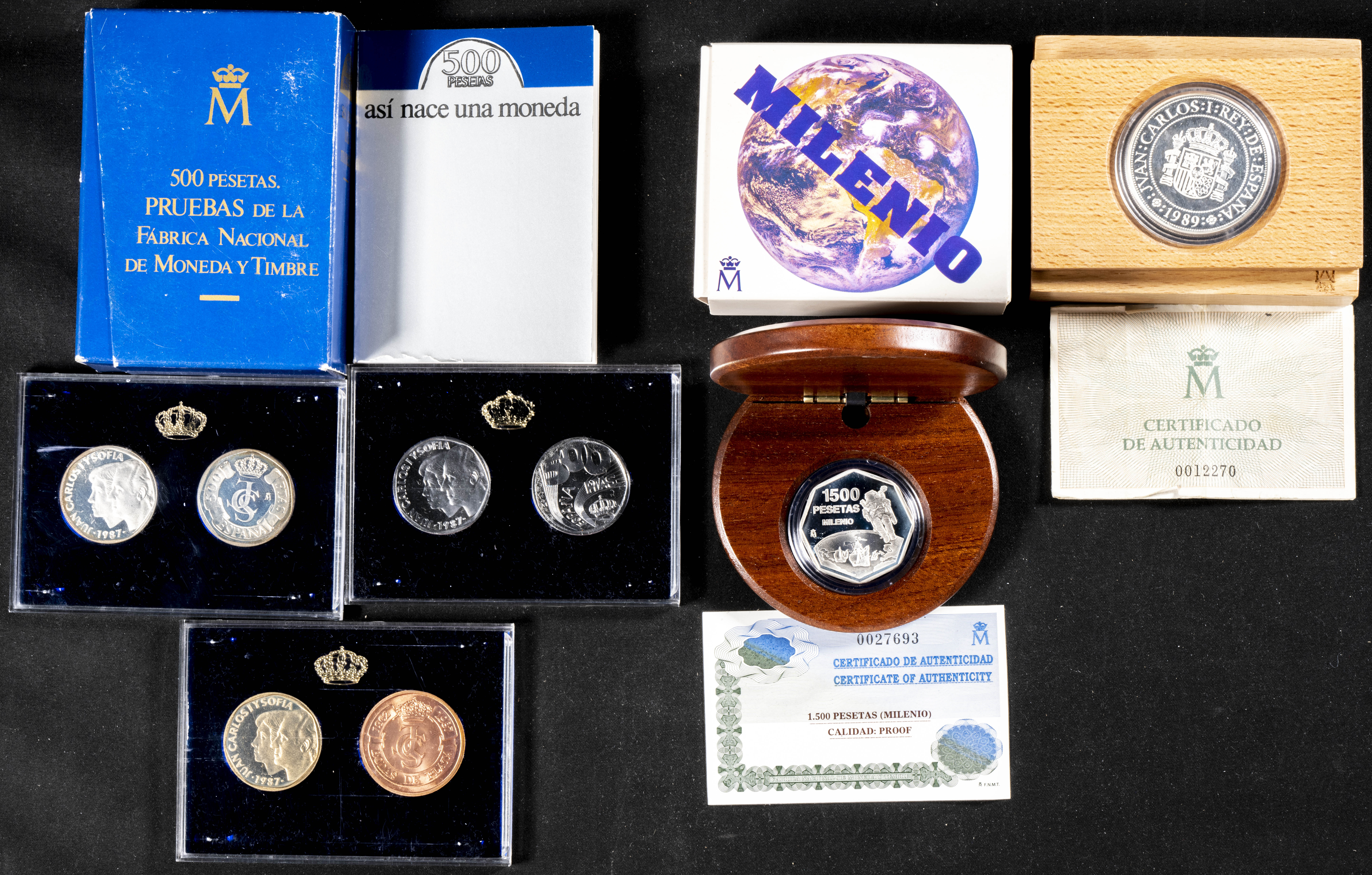 CONTEMPORÁNEO. Conjunto de 3 estuches conmemotativos: 5000 Pesetas de 1989, 1500 Pesetas (Milenio) y Así nace una moneda. Incluyen certificados de autenticidad. A EXAMINAR.