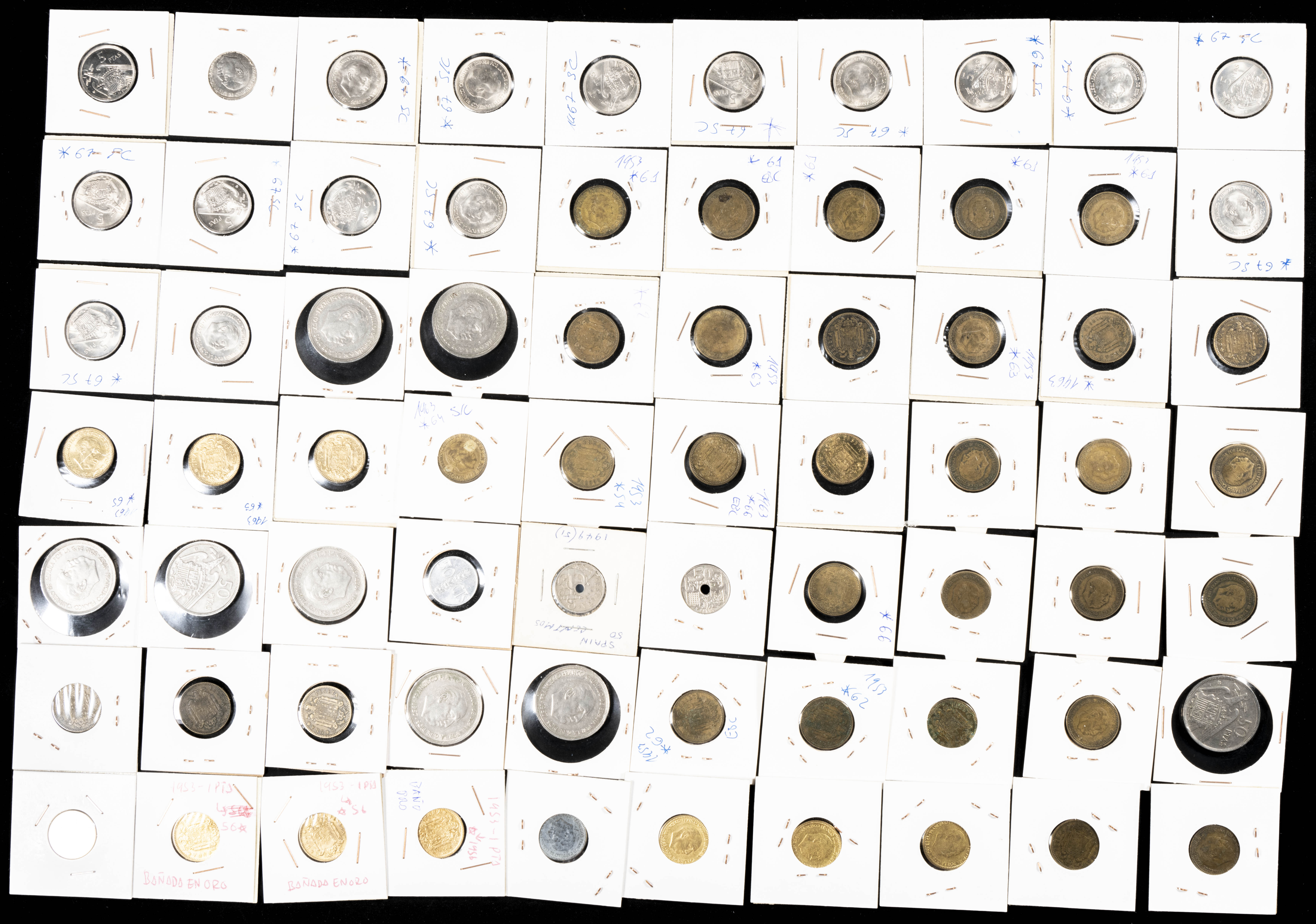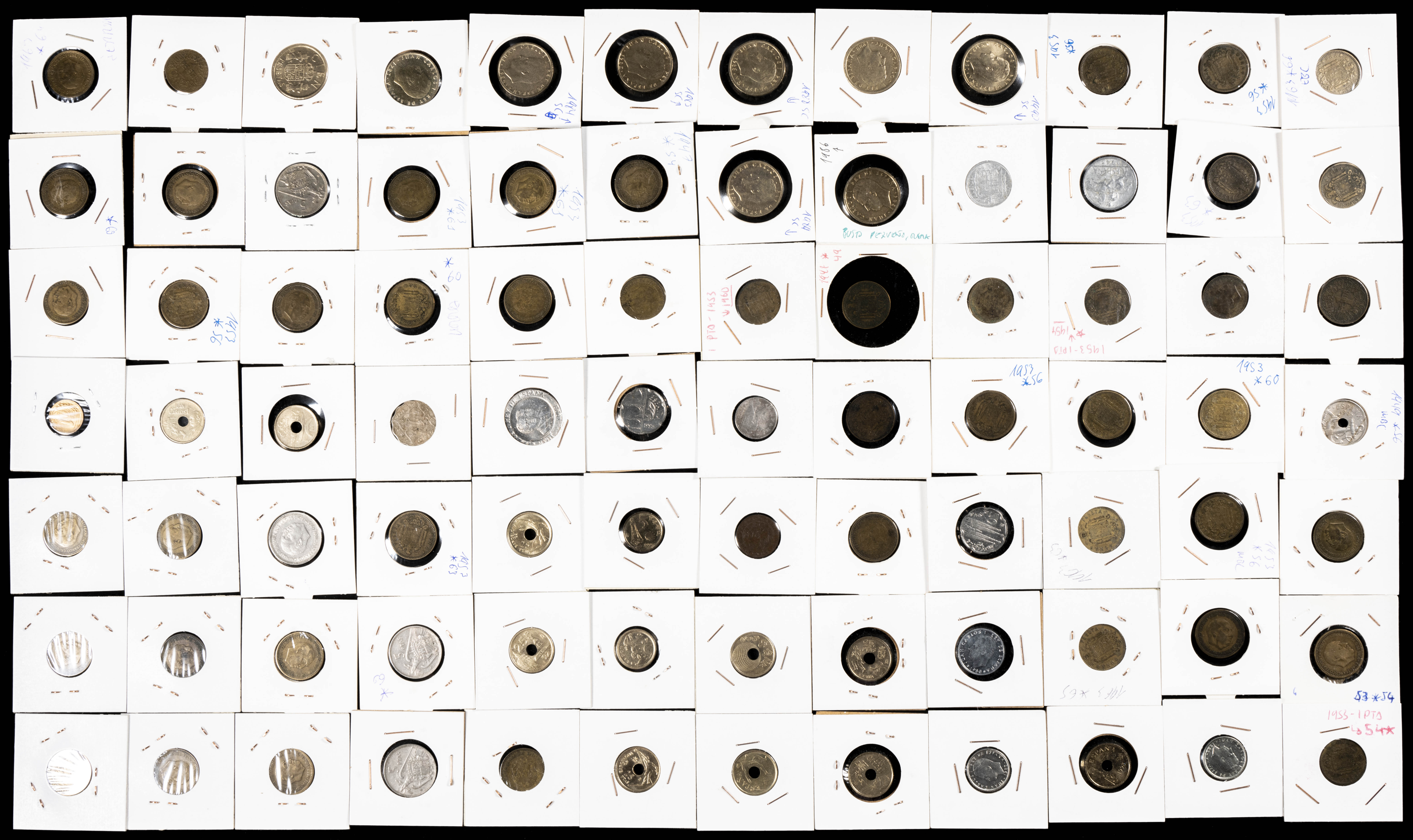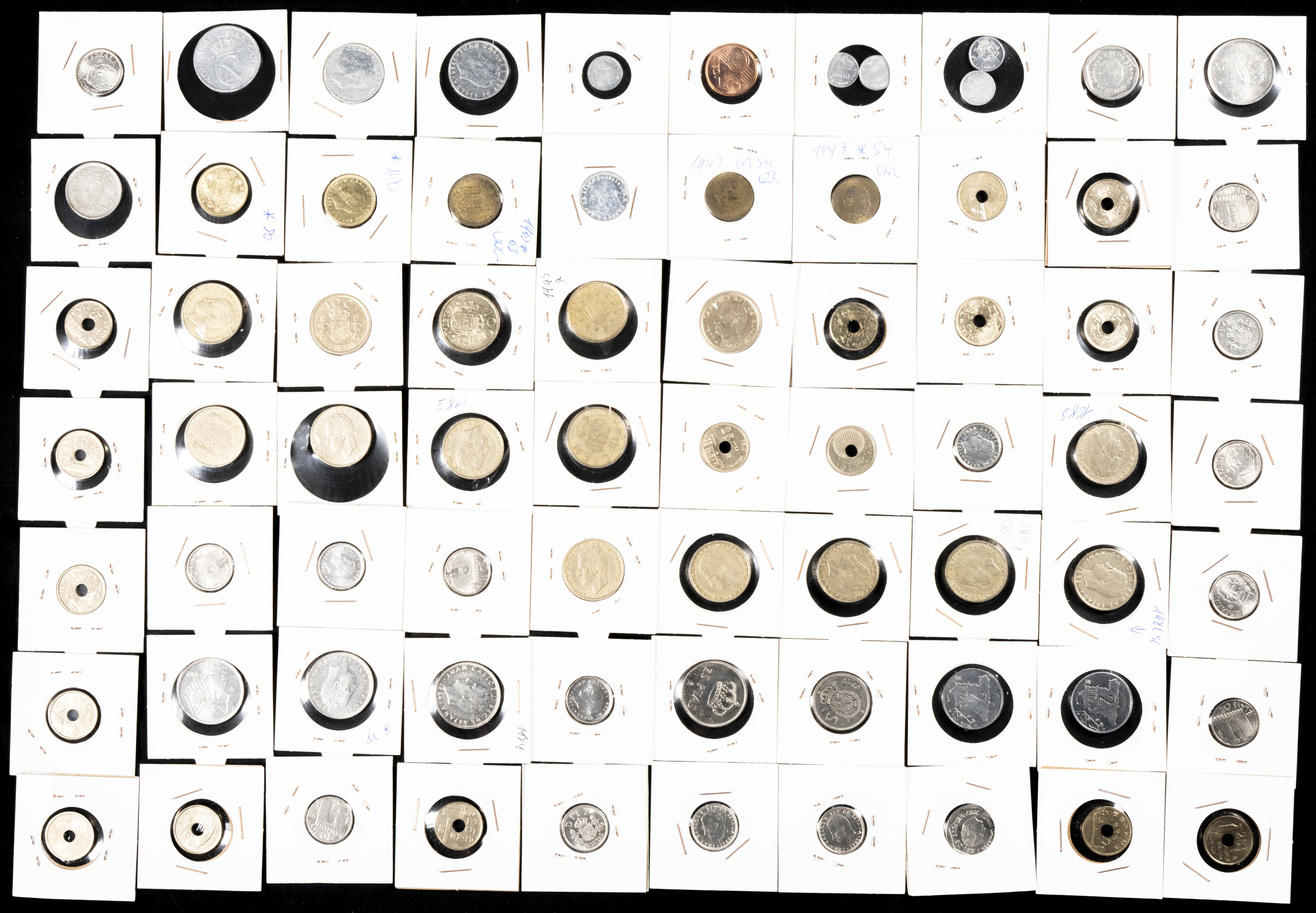 Interesenta y amplio conjunto formado por centenares de monedas, en su gran mayoría españolas, que comprenden una amplia cronología. A destacar gran variedad de años y estrellas. Incluye un interesante lote de más de 50 billetes extranjeros. Gran variedas de módulos, medidas y calidades. A EXAMINAR.
