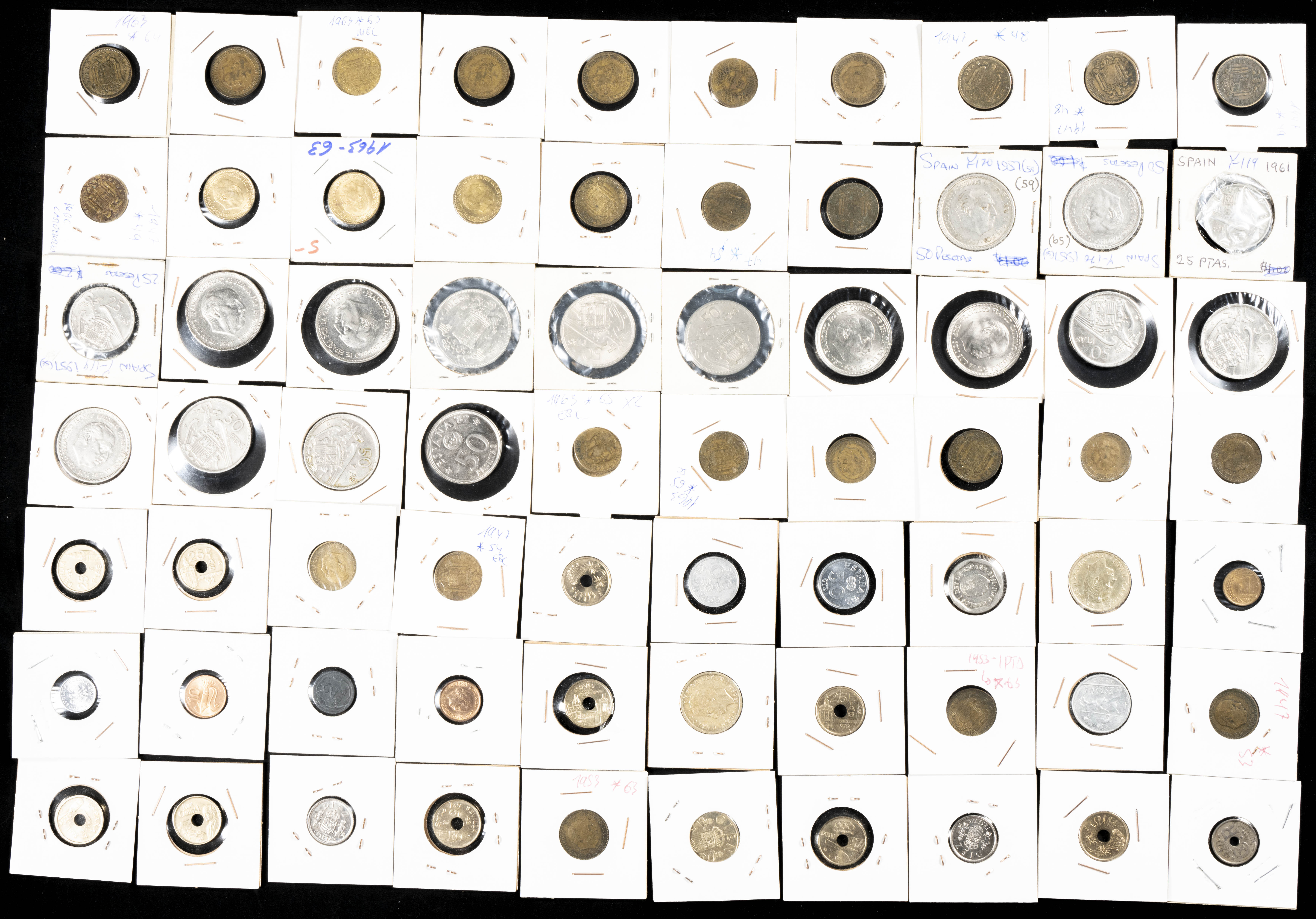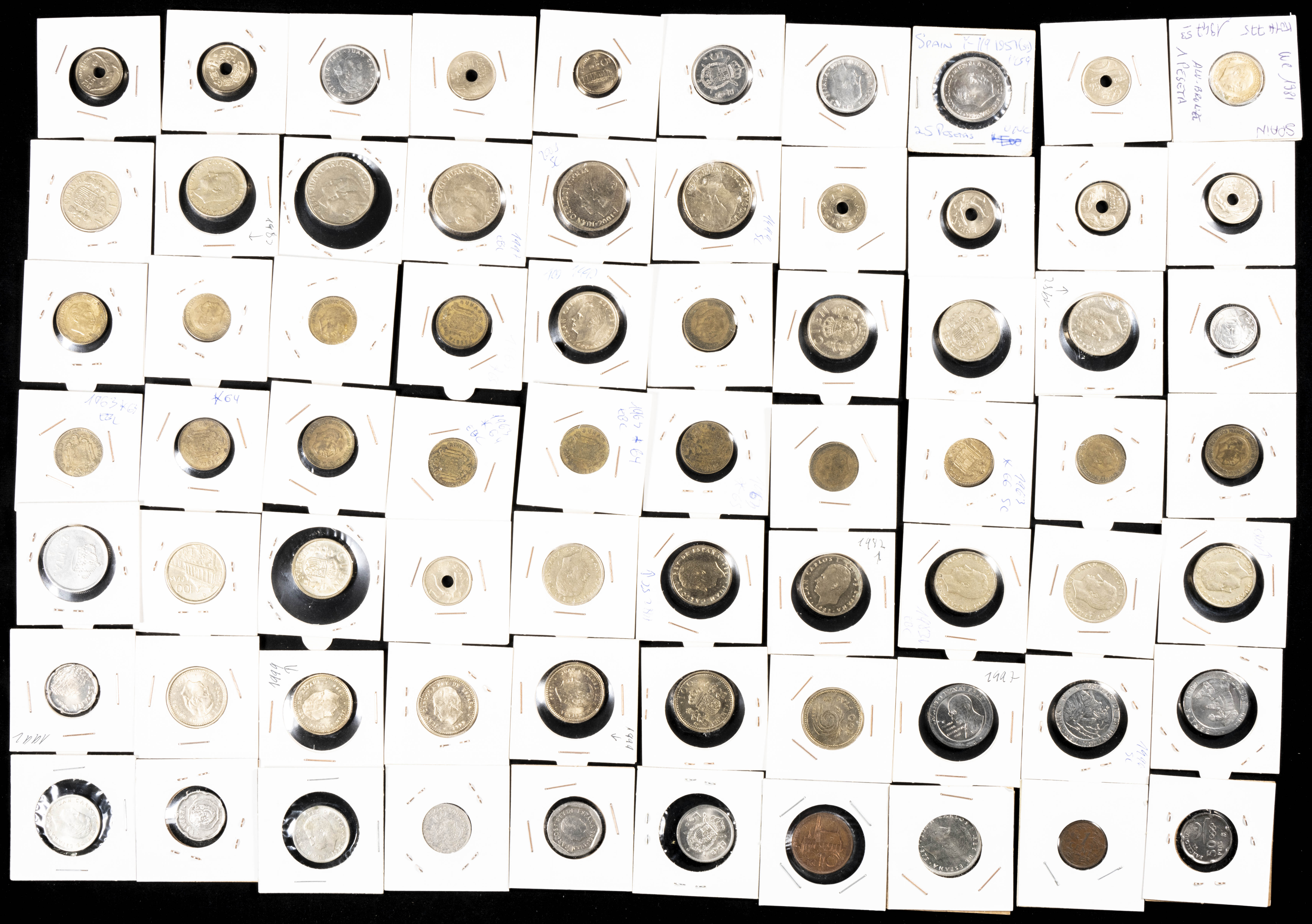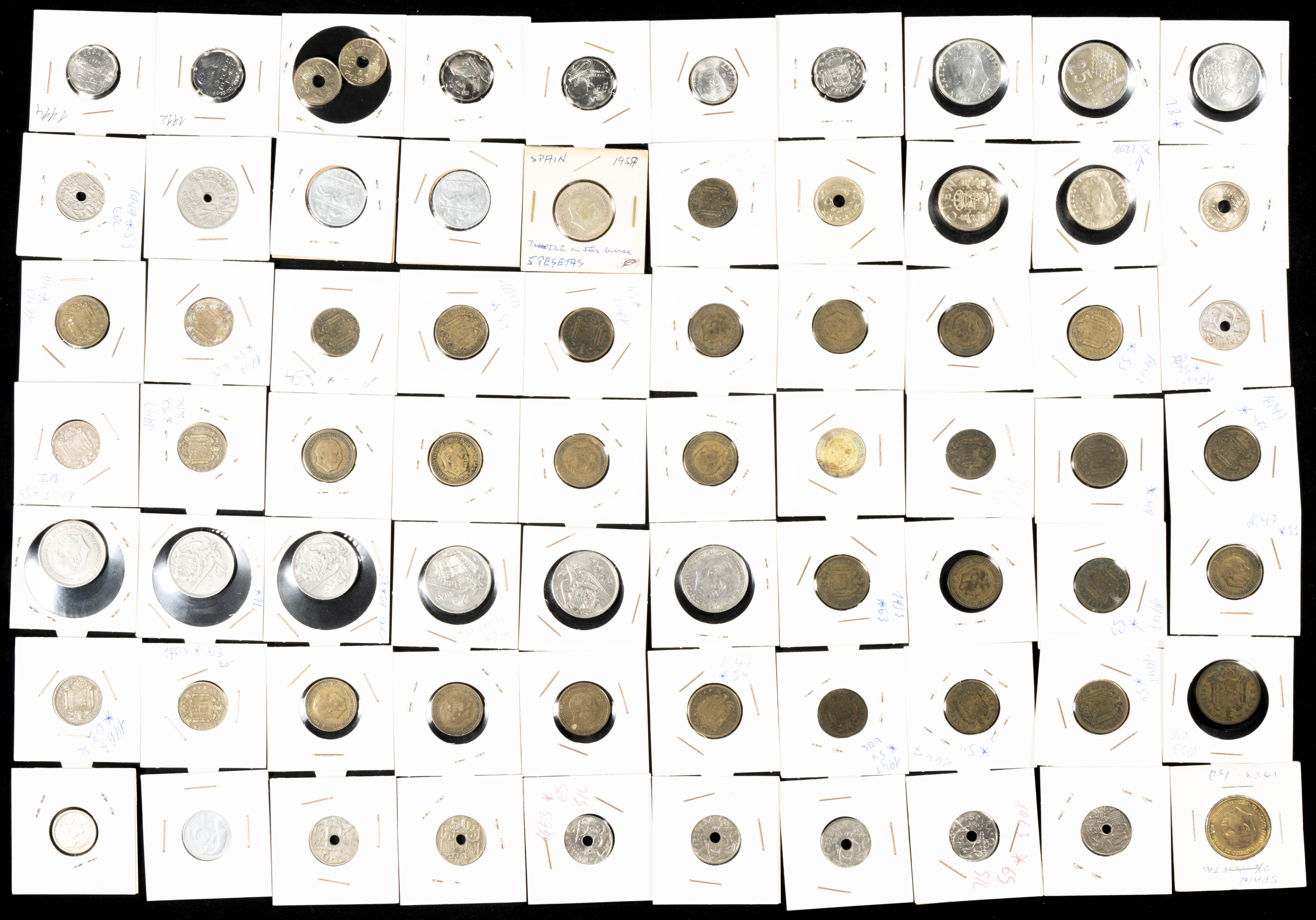 Interesenta y amplio conjunto formado por centenares de monedas, en su gran mayoría españolas, que comprenden una amplia cronología. A destacar gran variedad de años y estrellas. Incluye un interesante lote de más de 50 billetes extranjeros. Gran variedas de módulos, medidas y calidades. A EXAMINAR.
