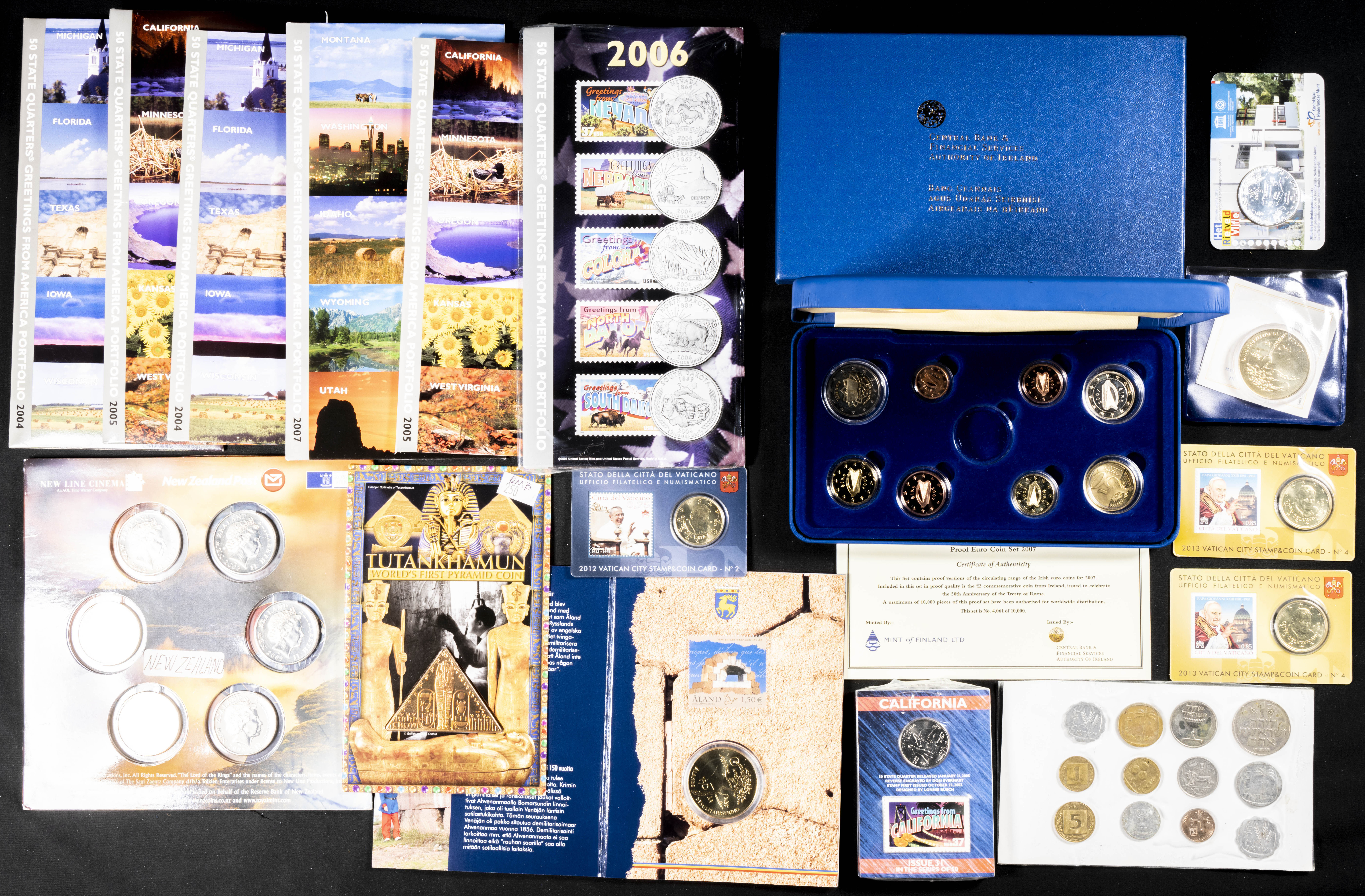 MONEDAS EXTRANJERAS. Interesante y amplio conjunto de cientos de piezas donde destacan estuches, sets y piezas en plata conmemorativas de una gran cantidad de países. También destacamos una muy completa colección de State Quarter Dollar de Estados Unidos. Diferentes estados de conservación. IMPRESCINDIBLE EXAMINAR.