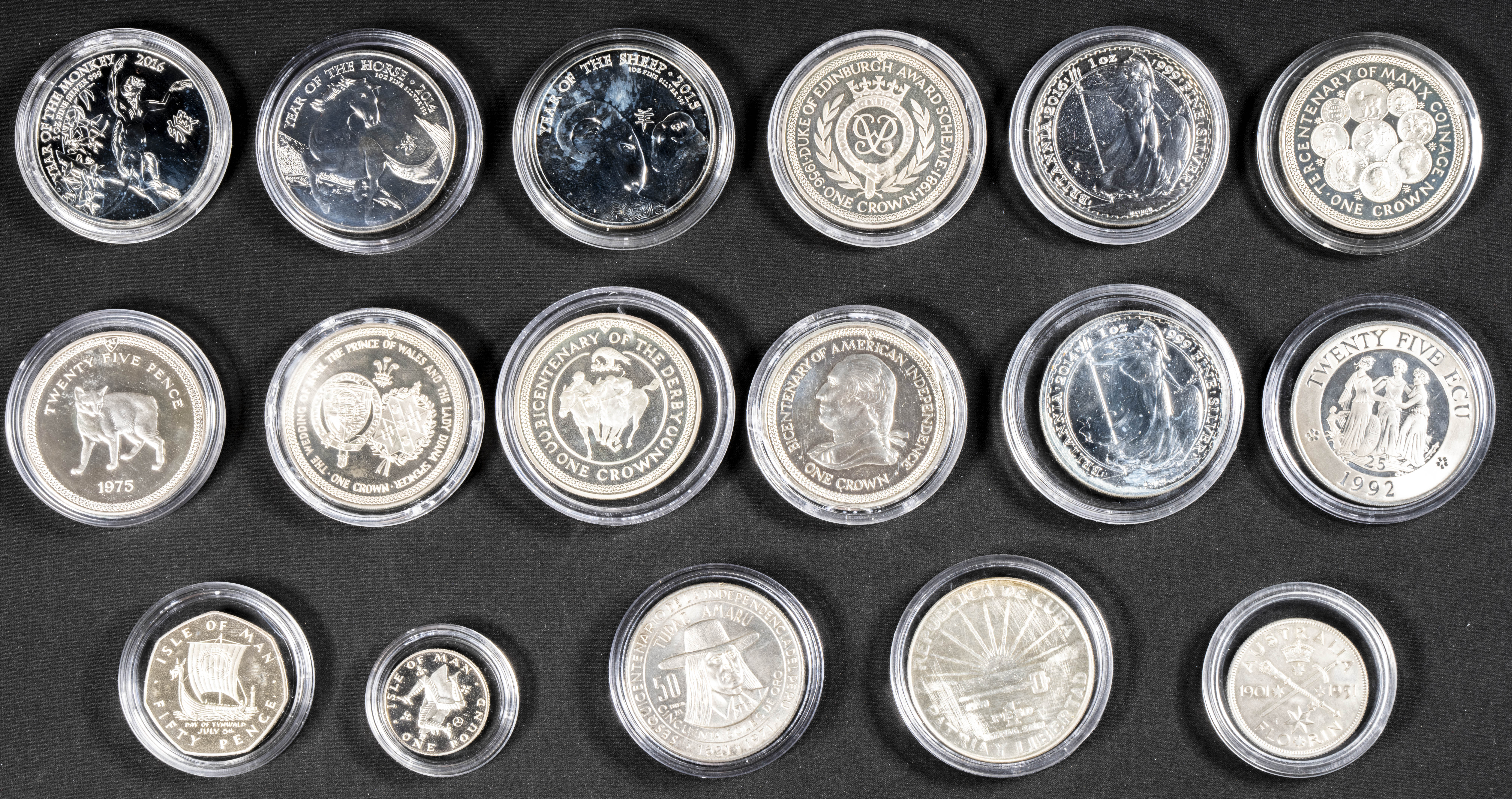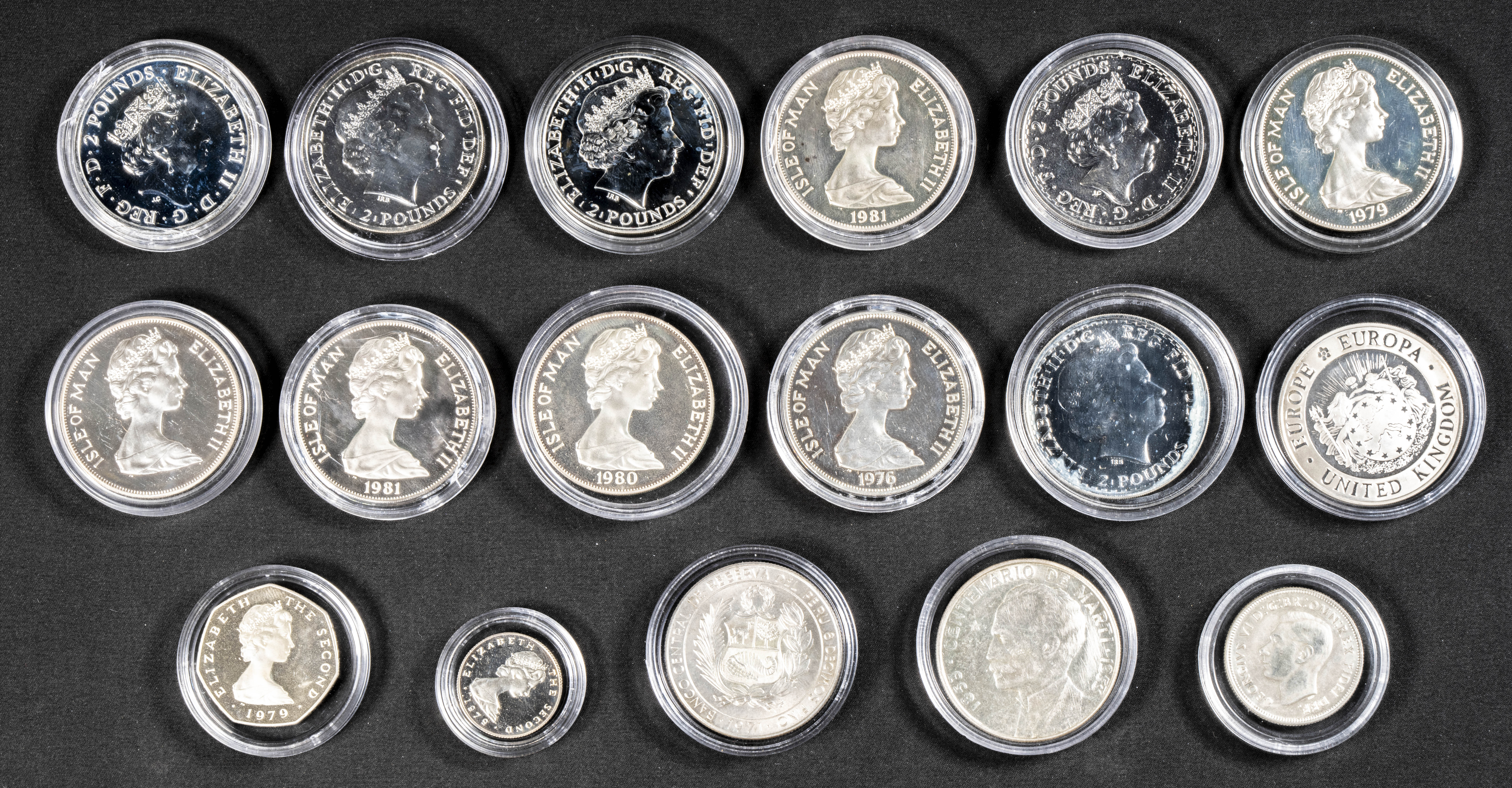 MONEDAS EXTRANJERAS. Interesante y variado conjunto de 18 monedas en plata, de diferentes países, módulos y fechas. Destacan fundamentalemente, por número, acuñaciones de países y enclaves de la Commonwealth aunque podemos encontrar, también, ejemplares de Cuba y Perú. Alto nivel de conservación general, incluyendo terminaciones PROOF y en color. A EXAMINAR.