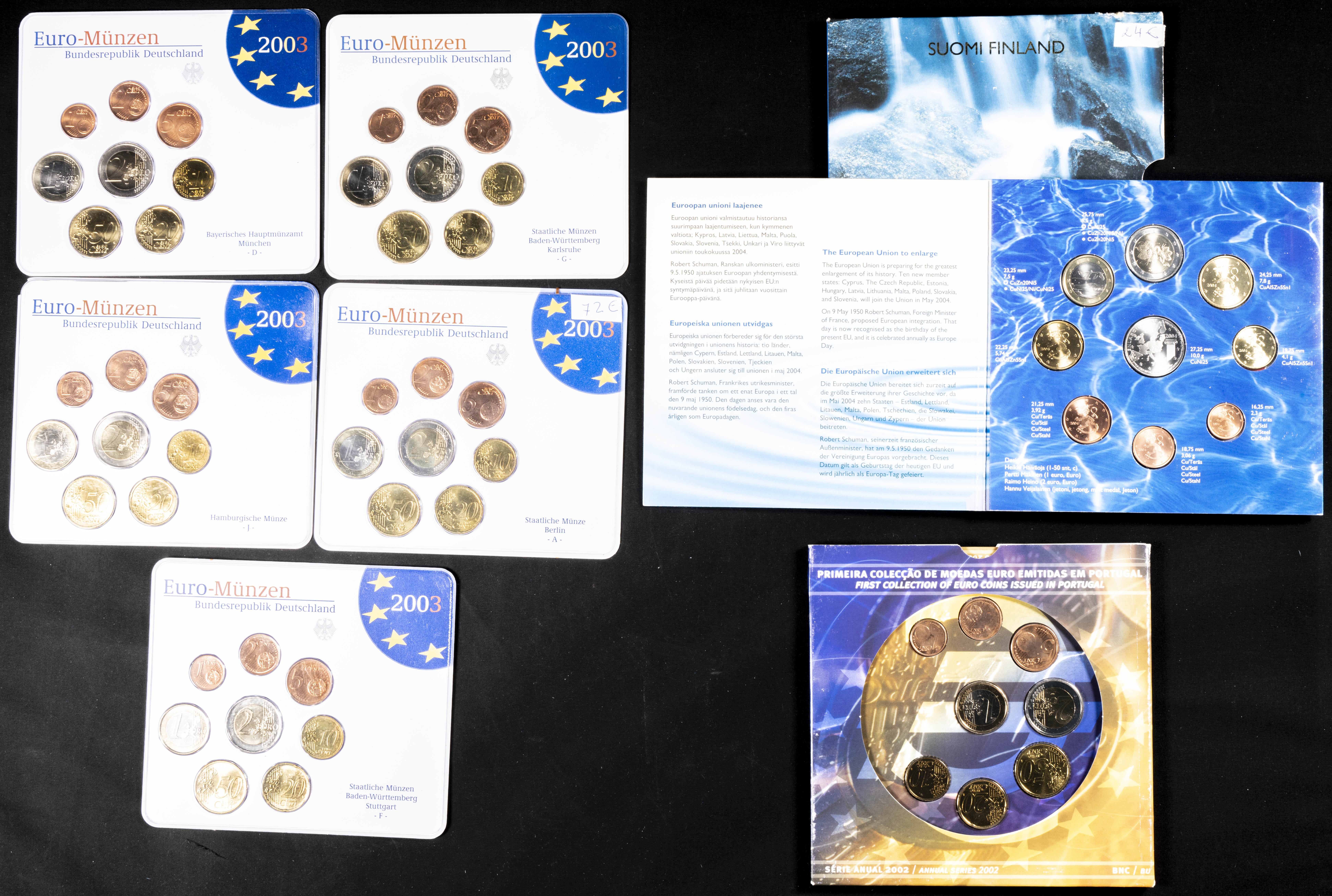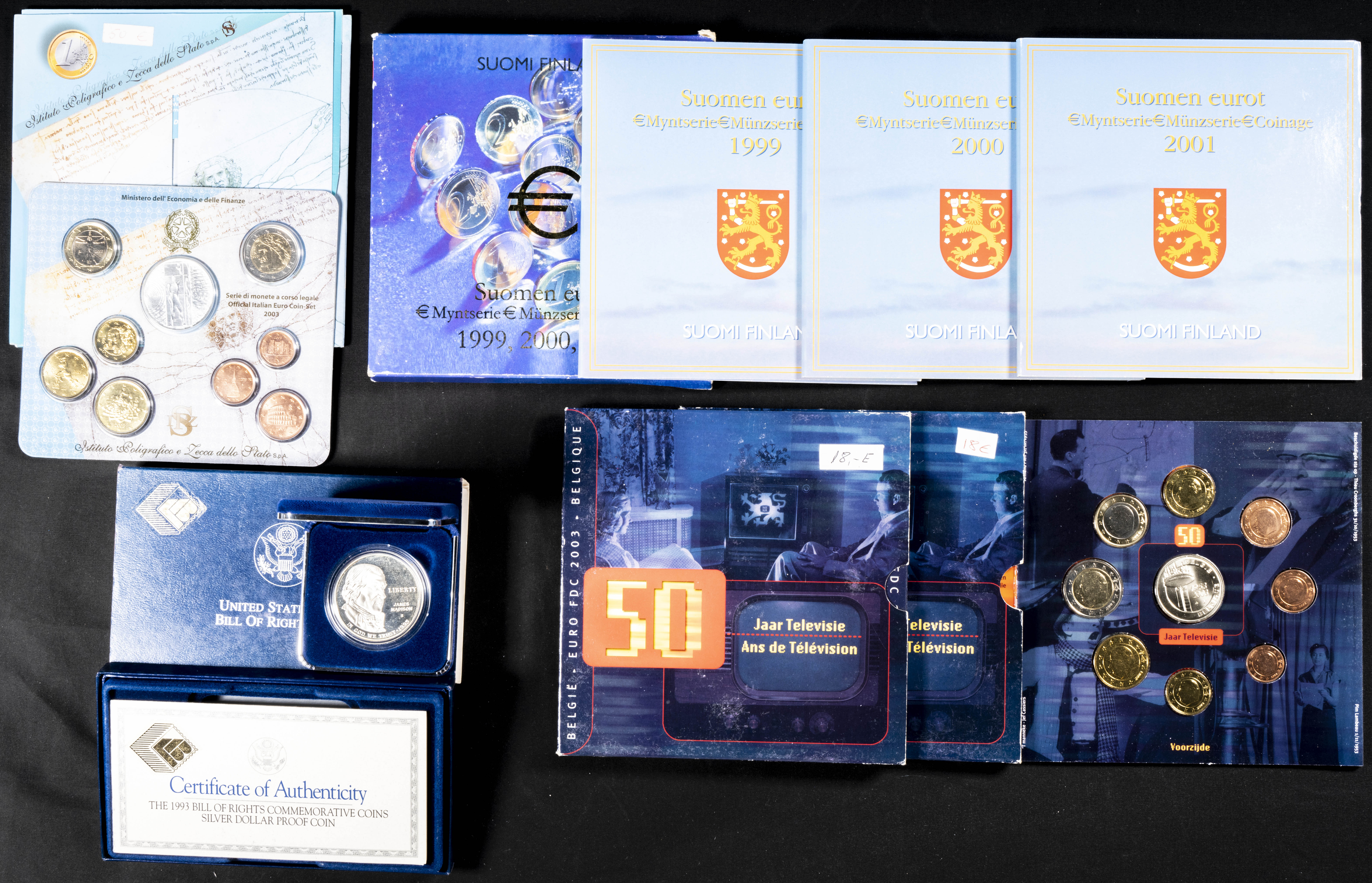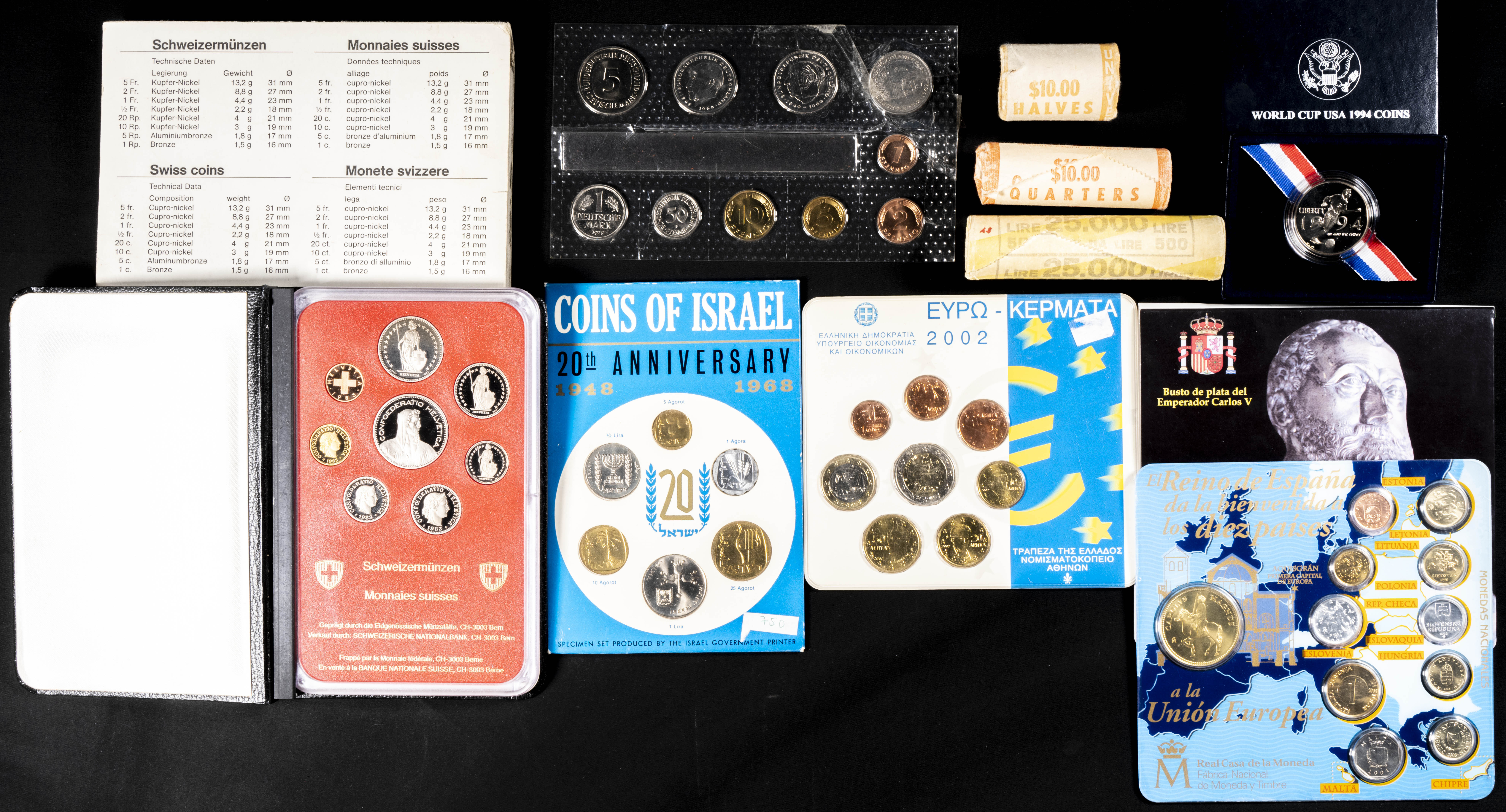 MONEDAS EXTRANJERAS. Interesante conjunto formado por sets, estuches y cartuchos conmemorativos de diferentes países. Incluye Euros y piezas en plata. Destacamos en el conjunto un triple set de euros de Finlandia (1999, 2000 y 2001), dos cartuchos (1/2 Dollar y Quarter Dollar,incompletos) de Estados Unidos y un set del Banco Nacional Suizo de 1983 en calidad PROOF. Muy buen estado de conservación general. A EXAMINAR.