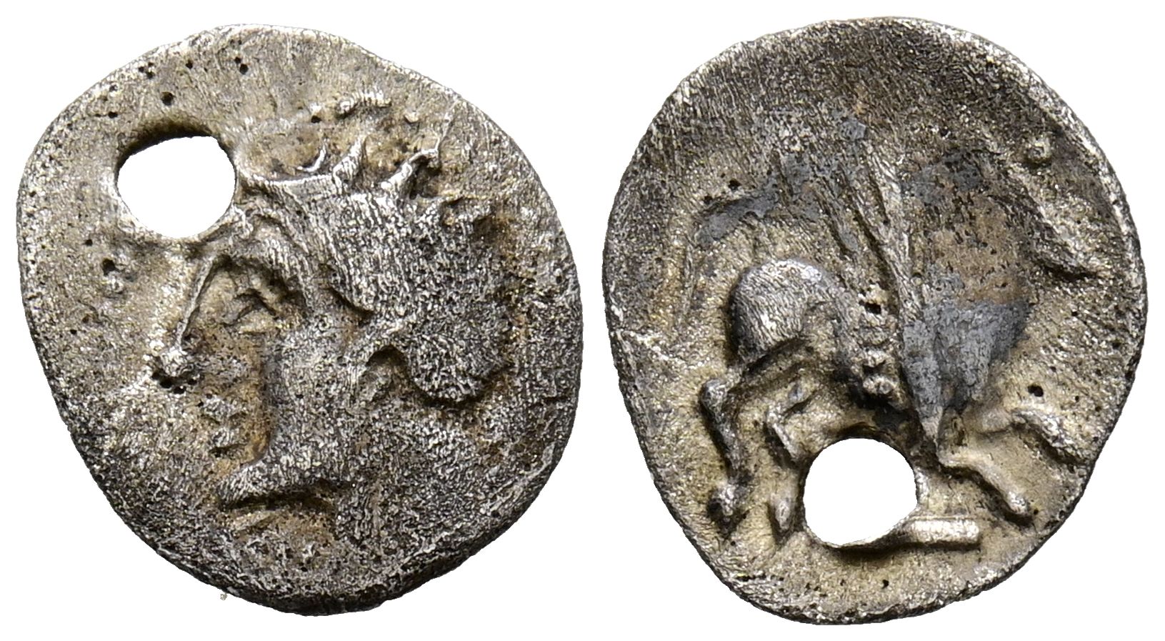 EMPORION (Ampurias, Gerona). Tritartemorion. (Ar. 0,41g/10mm). 220-215 a.C. (ACIP 512, catalogada como R8). Anv: Cabeza diademada femenina a izquierda. Rev: Pegaso volando a derecha. MBC. Perforación. Raro ejemplar.