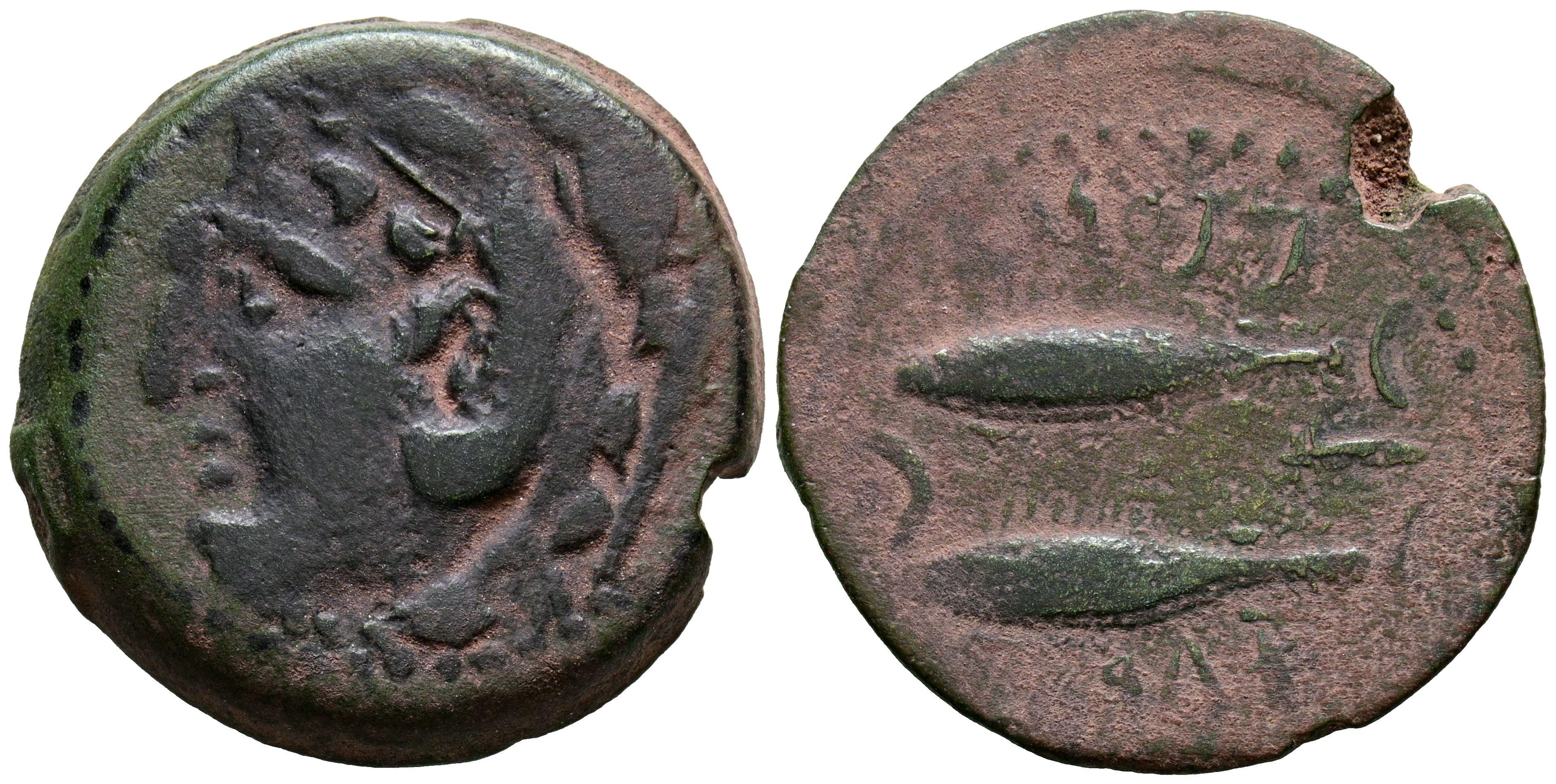 GADES (Cádiz). As. (Ae. 11,88g/26mm). 100-20 BC (FAB-1339). Anv: Cabeza de Hércules a izquierda, detrás clava. Rev: Dos atunes a izquierda, entre ambos media luna y punto, letra púnica alef, alrededor de leyenda púnica tipo B. MBC-.