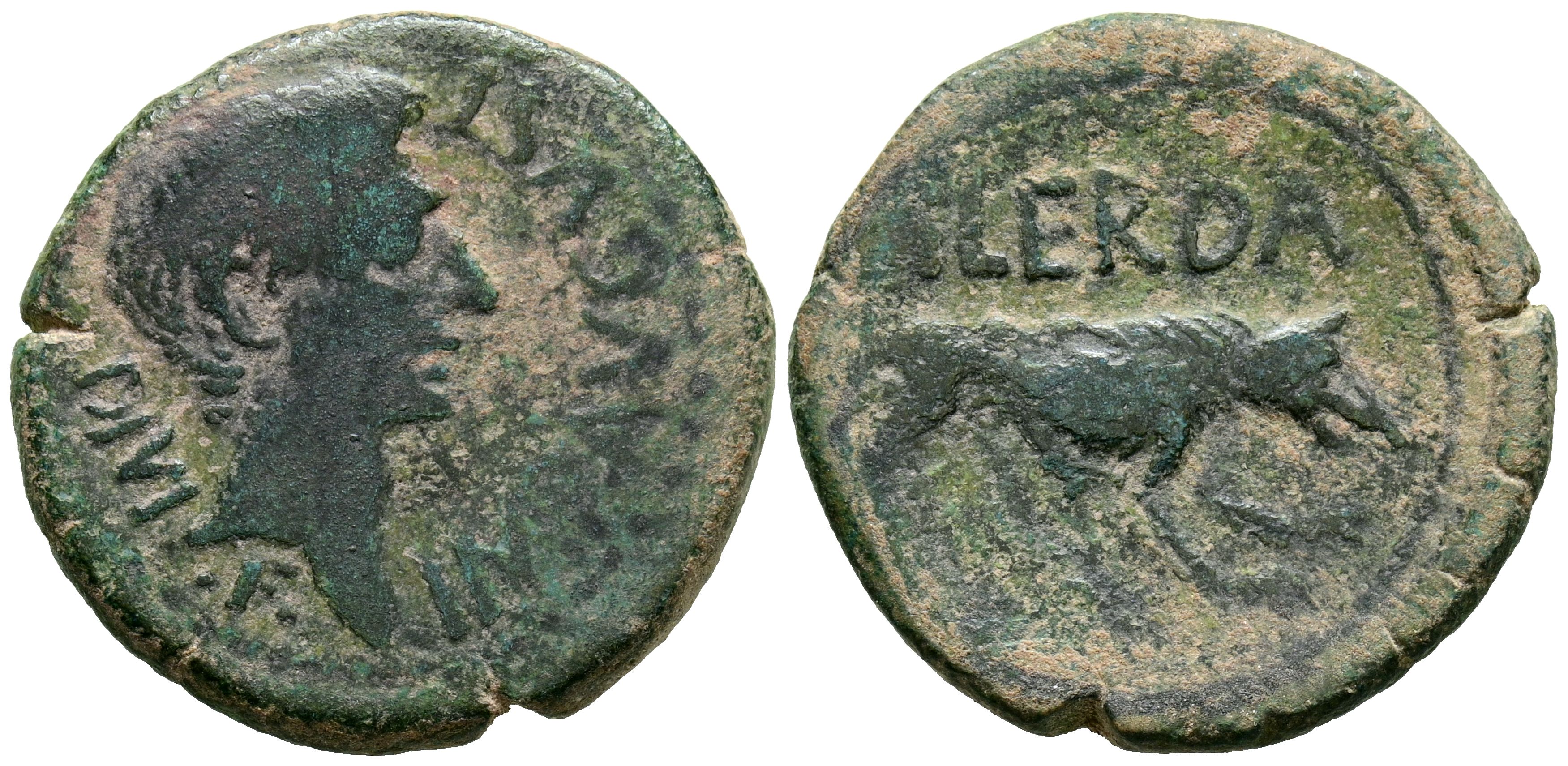 ILTIRTA (Lérida). As. (Ae. 8,44g/23mm). 27 a.C.-14 d.C. (FAB-1488). Anv: Cabeza de Augusto a derecha, alrededor leyenda: DIVI F IMP AVGVST. Rev: Lobo andando a derecha, encima leyenda: ILERDA. MBC-.