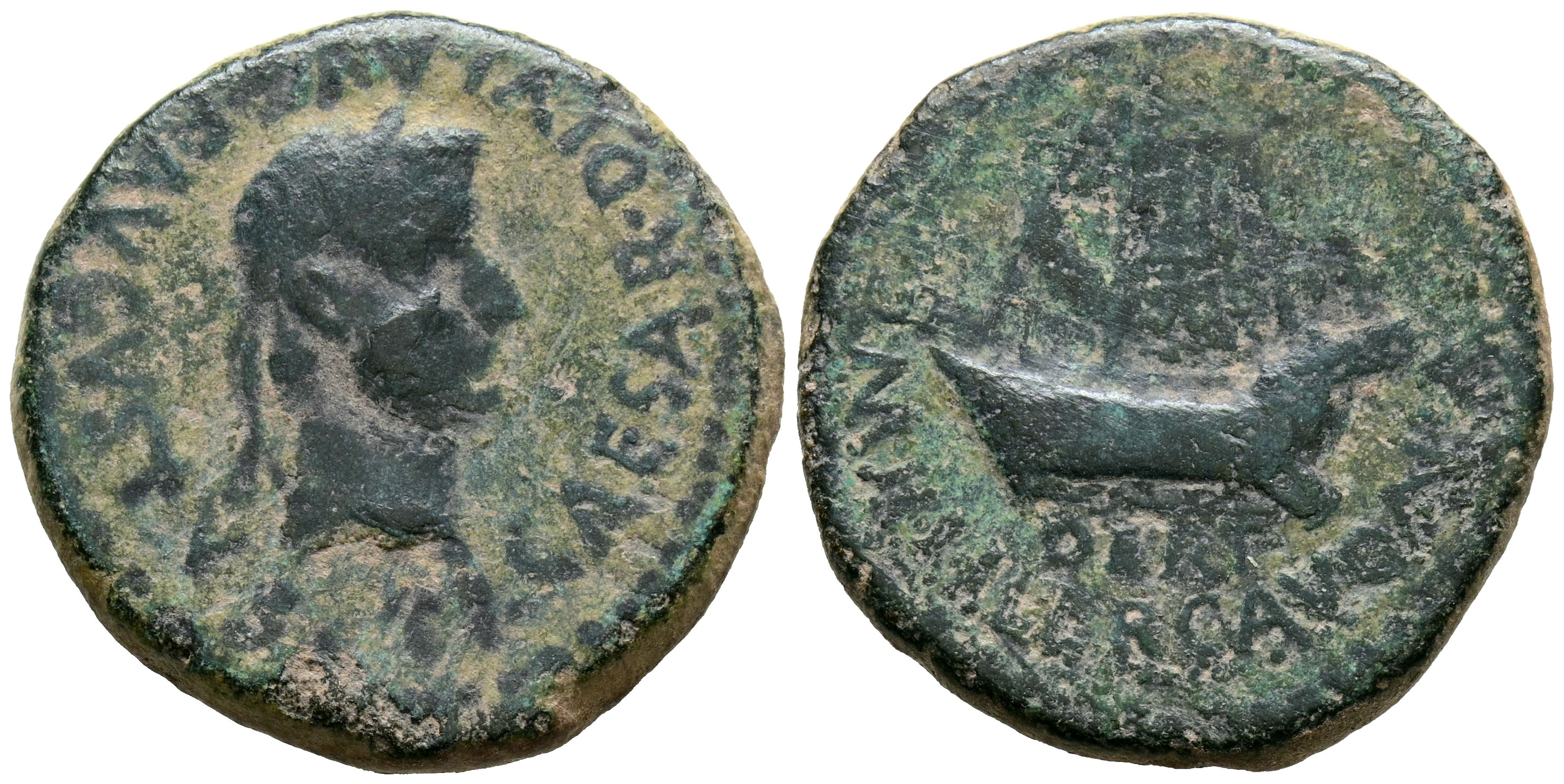 ILERGAVONIA (Tortosa, Tarragona). As. (Ae. 8,54g/25mm). 14-36 d.C. (FAB-1493). Anv: Cabeza laureada de Tiberio a derecha, alrededor leyenda: TI CAESAR DIVI AVG AVGVSTVS. Rev: Nave, debajo: DERT/ILRECAVONIA. BC+. Escaso ejemplar.