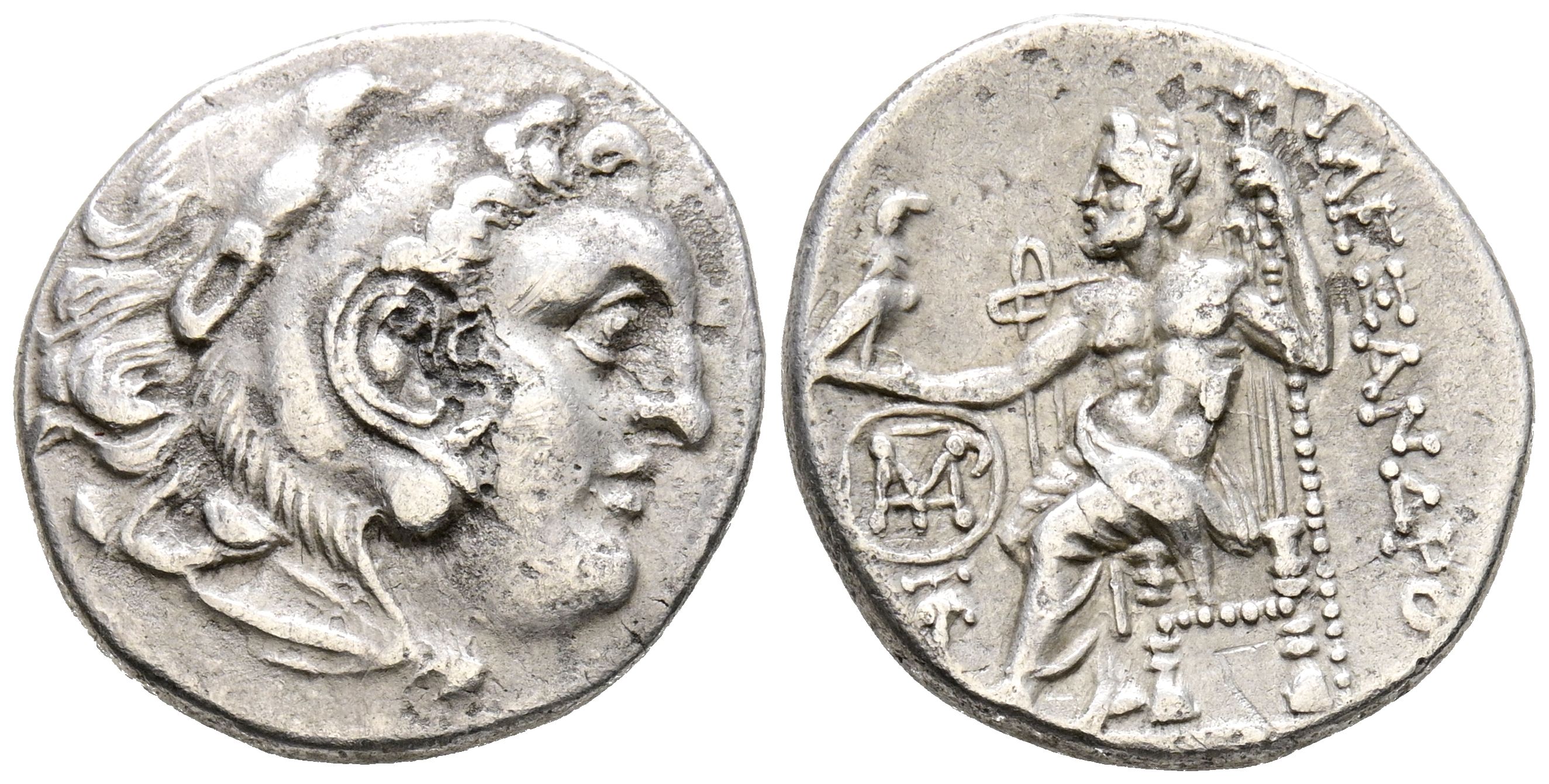 REYES DE MACEDONIA, Alejandro III el Grande. Dracma. (Ar. 4,04g/19mm). 290-275 a.C. Chios. (Price 2324). Anv: Cabeza de Hércules con piel de león a derecha. Rev: Zeus sentado a izquierda portando cetro y águila, delante monograma y racimo de uvas, d etrás leyenda griega: ΑΛΕΞΑΝΔΡΟΥ. MBC.