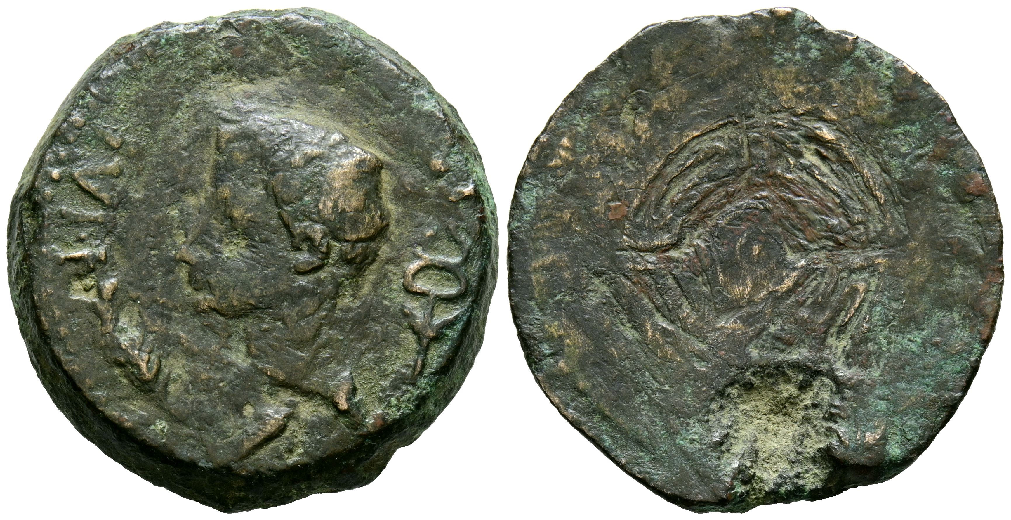LUCO AUGUSTI (Lugo). As. (Ae. 7,92g/25mm). 27 a.C.-14 d.C. (FAB-1706). Anv: Cabeza desnuda de Augusto a izquierda, detrás caduceo, delante palma, alrededor leyenda: IMP AVG DIVI F. Rev: Rodela de frente sin reborde. BC. Repasado.