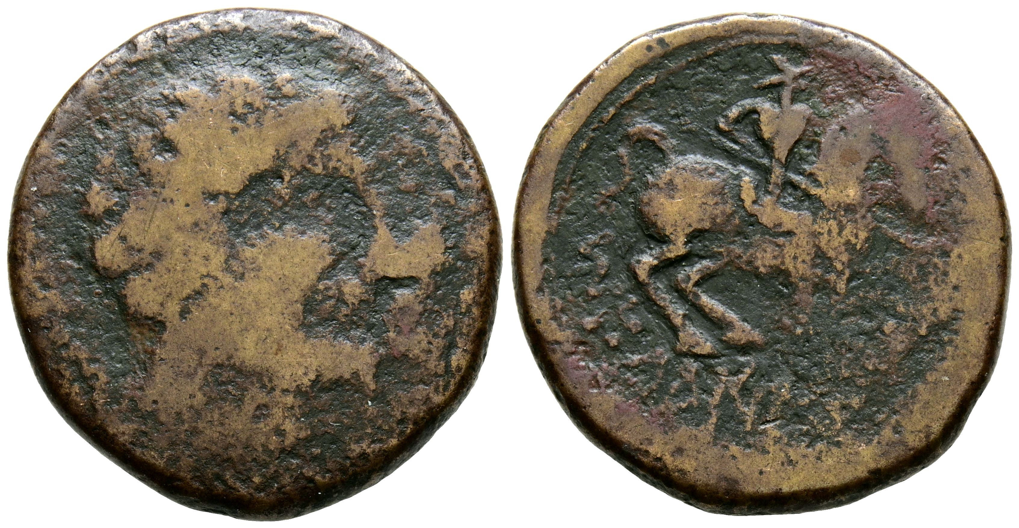 MEDUAINUM (Zona norte del EBRO). As. (Ae. 8,67g/25mm). 120-20 a.C. (FAB-1749). Anv: Cabeza masculina a derecha entre dos delfines hacia abajo. Rev: Jinete con lanza a derecha, debajo leyenda ibérica: MEDuIANUM. BC-. Ejemplar muy raro.