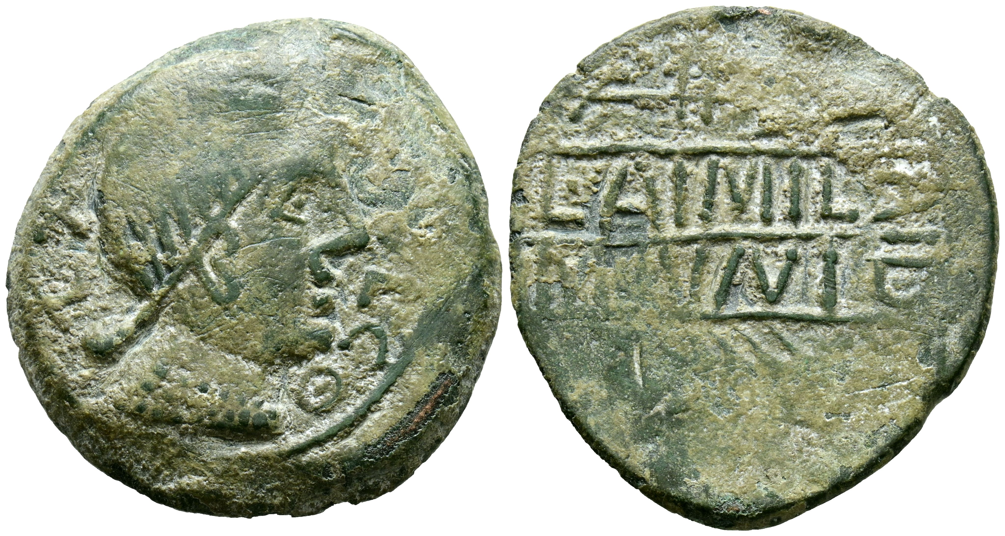 OBULCO (Porcuna, Jaén). As. (Ae. 13,89g/30mm). 220-20 a.C. (FAB-1818). Anv: Cabeza femenina a derecha, delante leyenda: OBVLCO. Rev: Leyenda: L AMIVL/M IVNI, encima arado a derecha, debajo espiga con letra ibérica Ta, a derecha leyenda AID. MBC-.